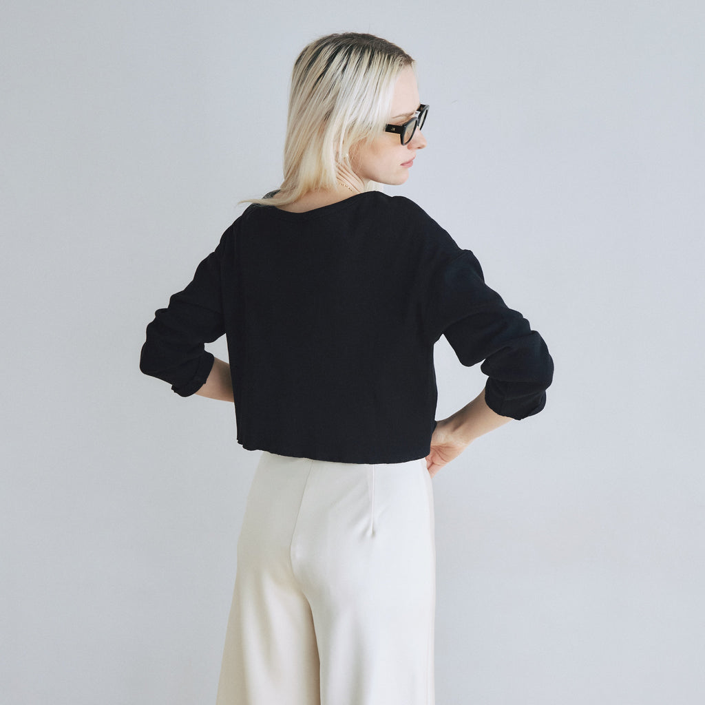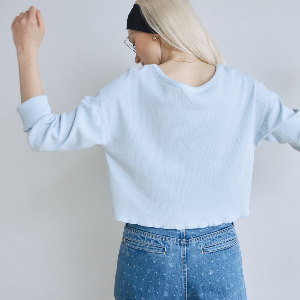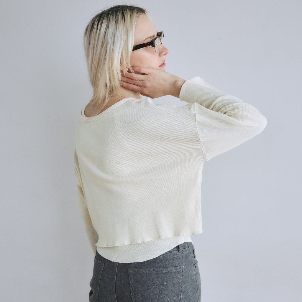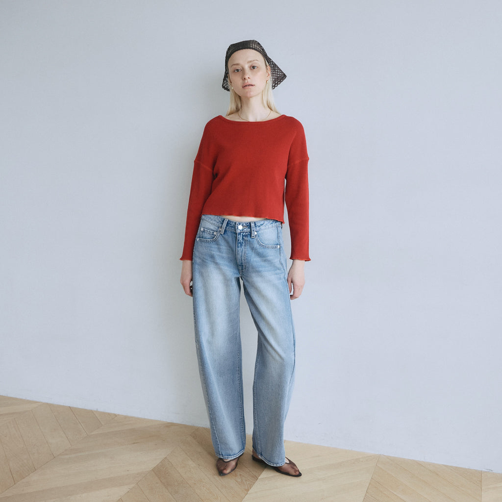 【計算されたコンパクトフォルム】バストが幅広いコンパクトなフォルムが可愛いポイント。腕はゆるすぎないジャストな着用感にしています。重ね着した時に肩紐がチラリと見えるよう、ネックを広めに設計しました。