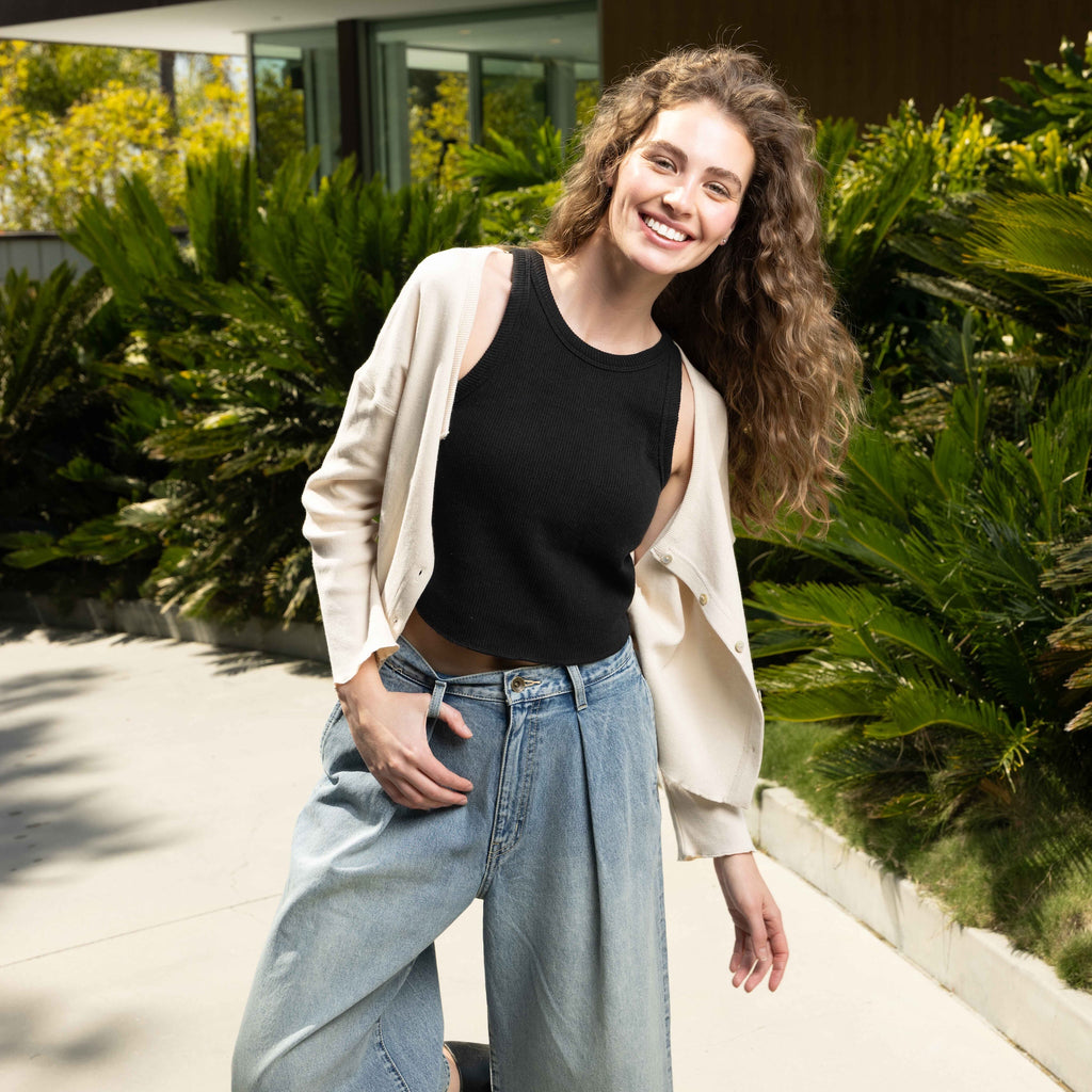 ◆コーディネートオフィスでスラックス合わせからプライベートでデニムやワンピースまで。コーデやシーン問わず着られる1枚。〈C/L Fluffy パッドinアメスリタンク〉とアンサンブルの着こなしもお楽しみいただけます。着用モデル身長172cm(ホワイト)167cm(ウォッシュブラック、オフホワイト)176cm(ベビーピンク)