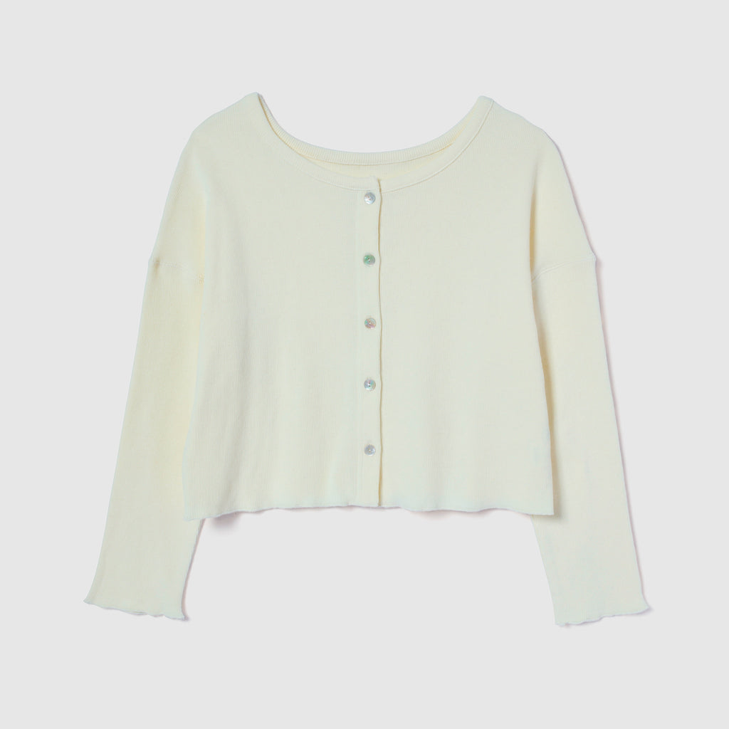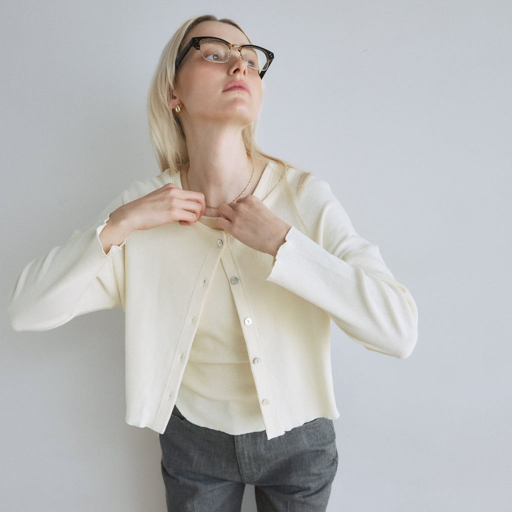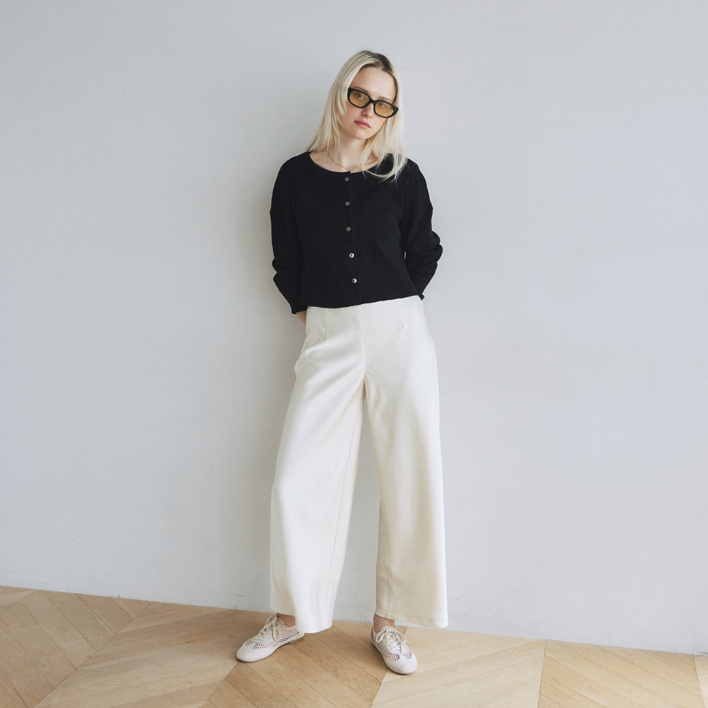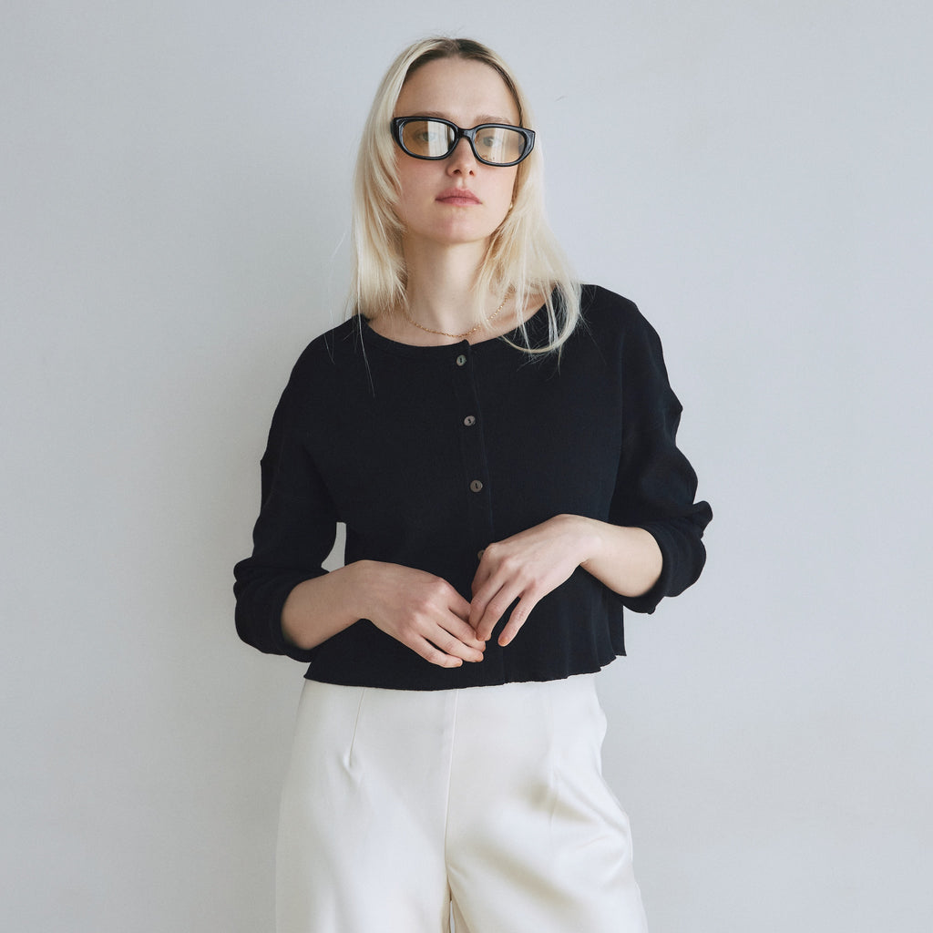 【コーデの幅広がる2WAY】華奢めな前立てとシェルボタンがシンプルなアクセント。カーディガンとしてだけでなく、ボタンを背中側にしてトップスとしても着用可能です。