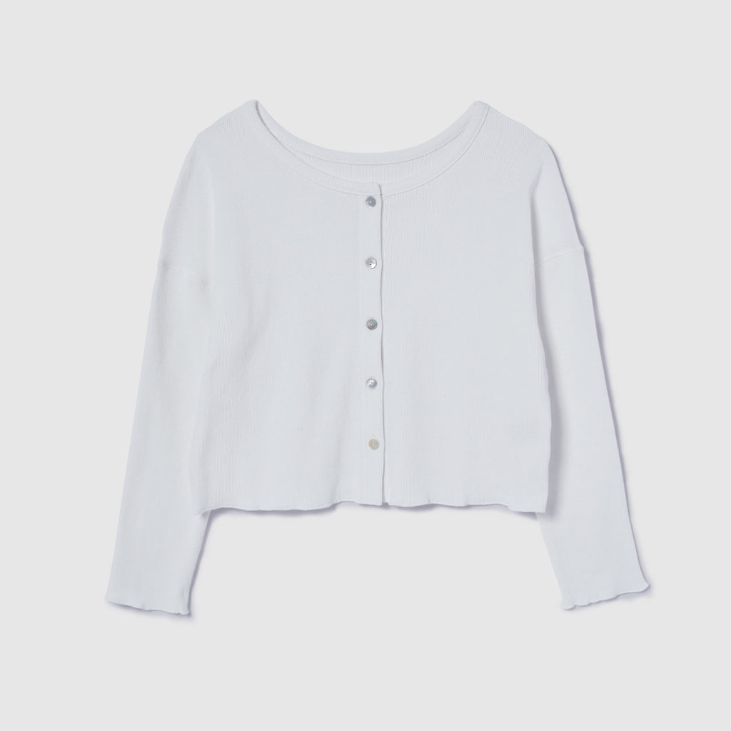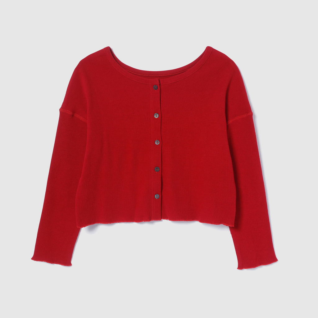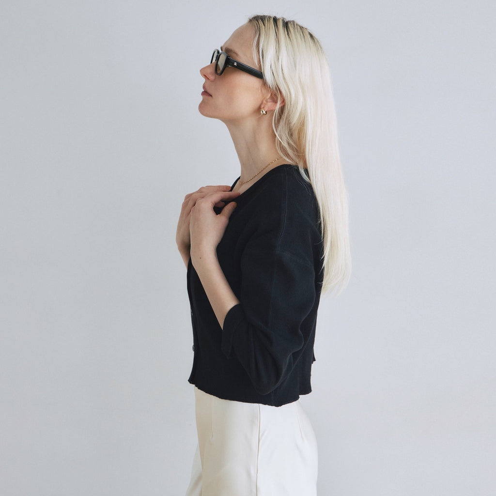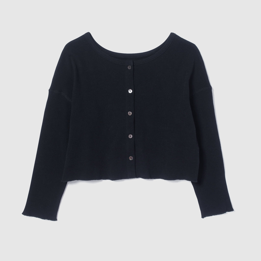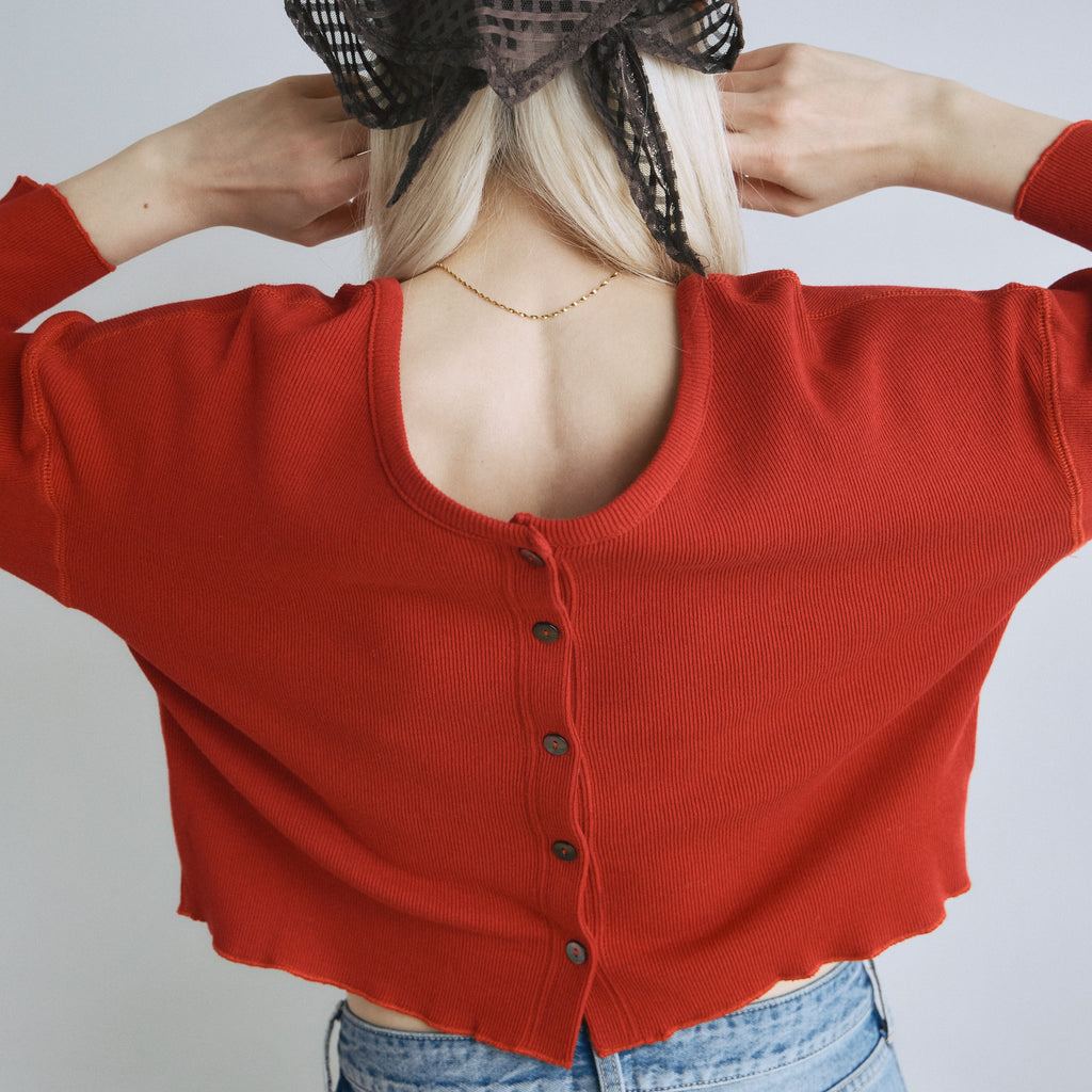 【コーデの幅広がる2WAY】華奢めな前立てとシェルボタンがシンプルなアクセント。カーディガンとしてだけでなく、ボタンを背中側にしてトップスとしても着用可能です。