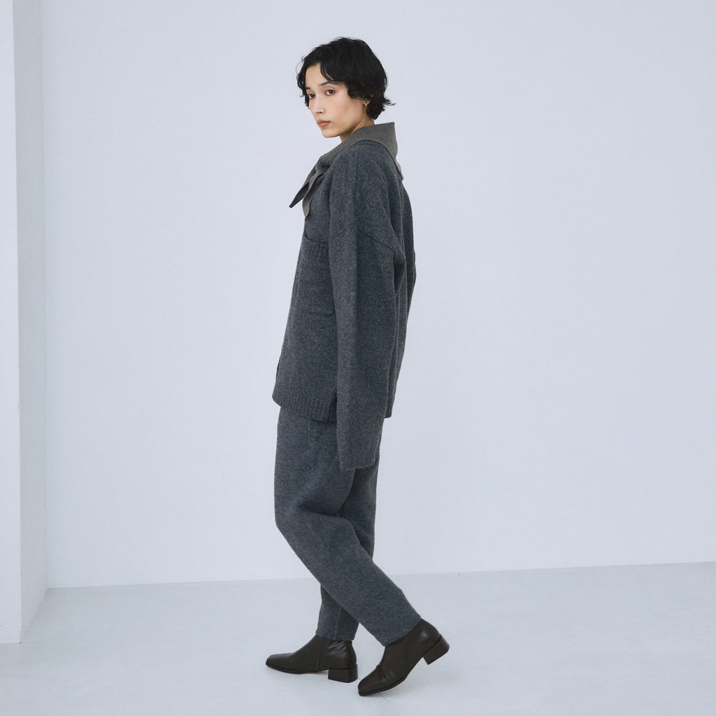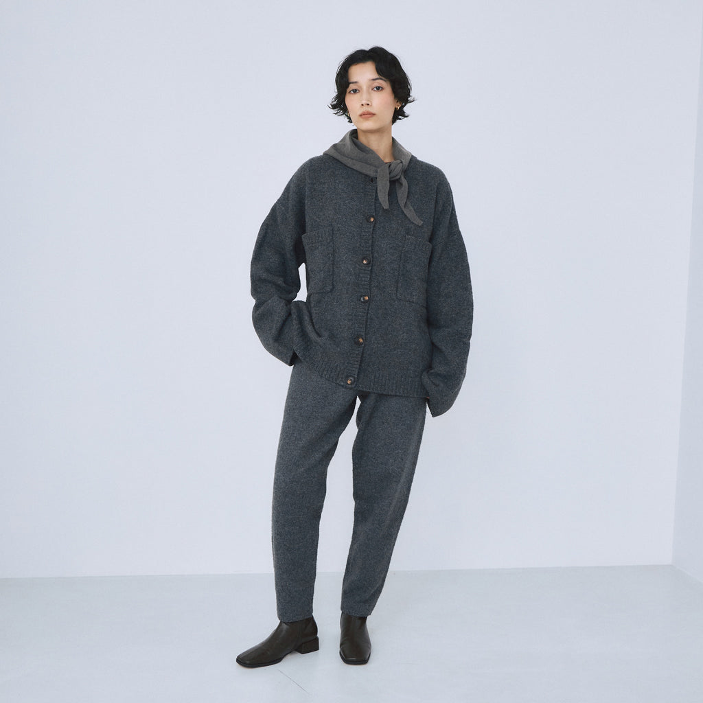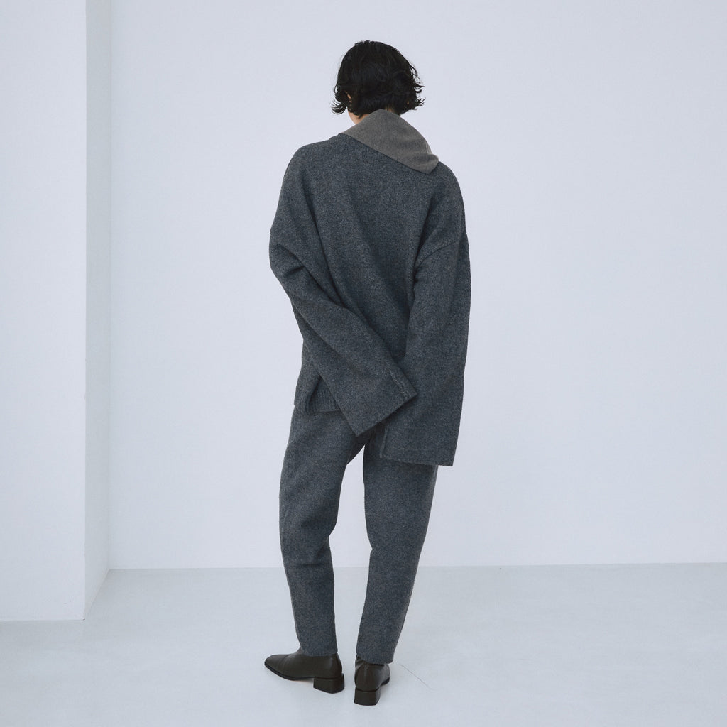 4種類の素材をミックスし圧縮した生地。詰まった編地が生む、もっちりとした手触りが特徴の良質ニットです。圧縮しているため、風を通しにくく、保温性が高いのが魅力。ウール混でしっかり暖かく、表面には柔らかなふんわり感もあり、冬にぴったりの1枚です。