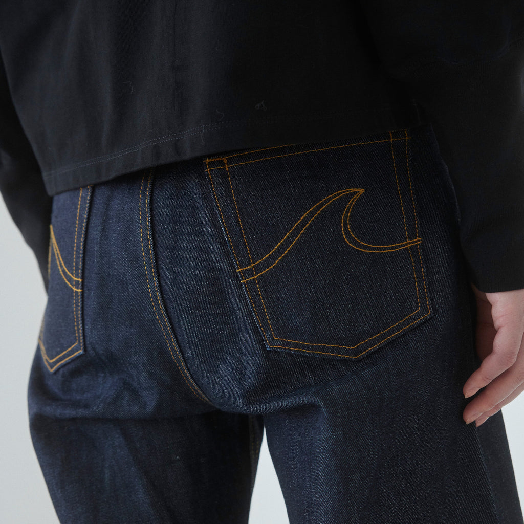やや厚みのある13.5ozのデニム生地を使用しています。糸がしっかり太く、シボ感とタテ落ちがデニムらしいのが特徴。厚みはあっても硬さはないため、窮屈さを感じにくい生地です。