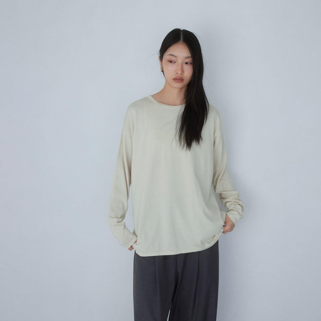 フラットな天竺編みでミニマルな印象に。この編み地は伸縮性と柔軟性を持つため、湿度に反応した生地がしなやかになった時、よりしっとりとした風合いを感じやすくなります。