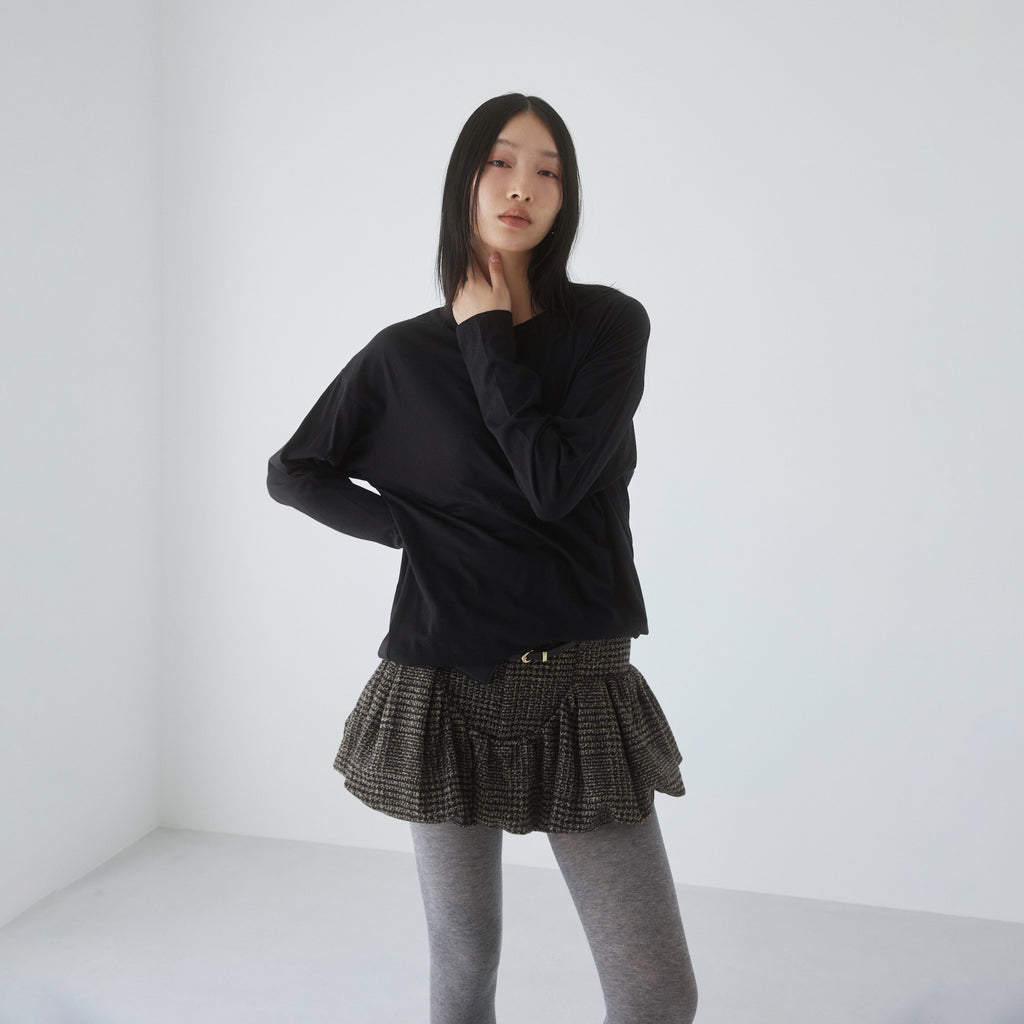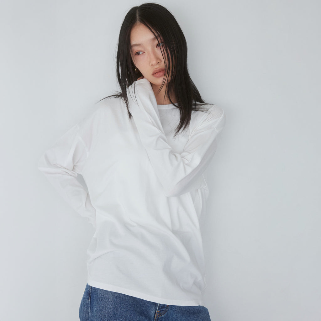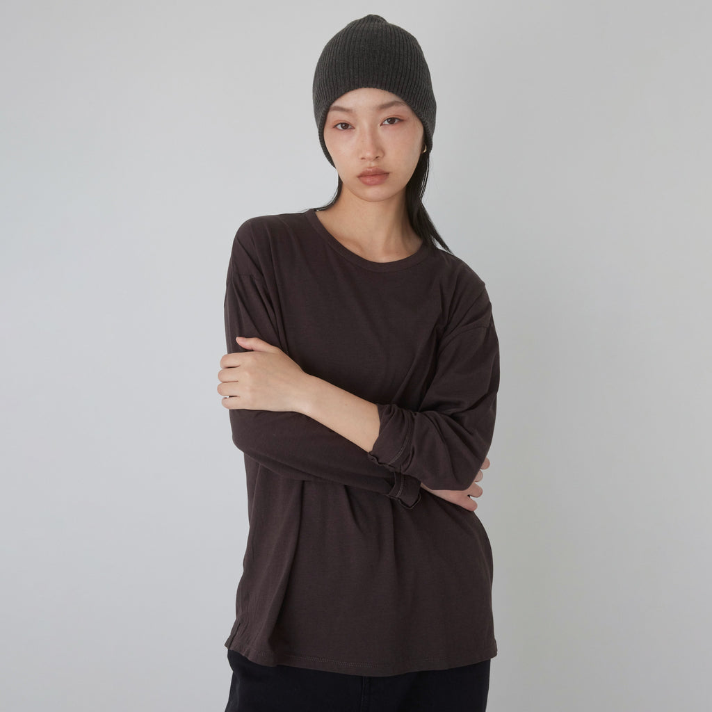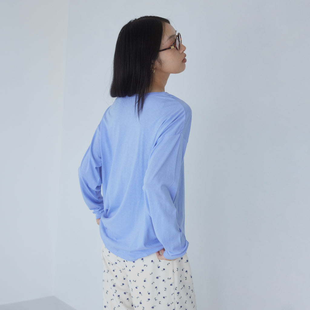 柔らかく肌に馴染む極上の着心地が特徴の、シルク混の生地。湿度に反応してさらにしなやかさが増すため、梅雨時期にもぴったりです。湿気を味方に、柔らかさをまとう新感覚のロンT。「ダークブラウン」、「ベビーアイリス」が新色です。