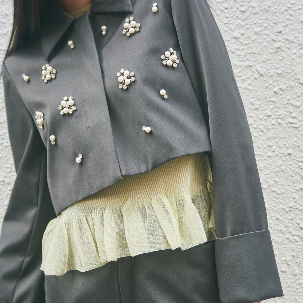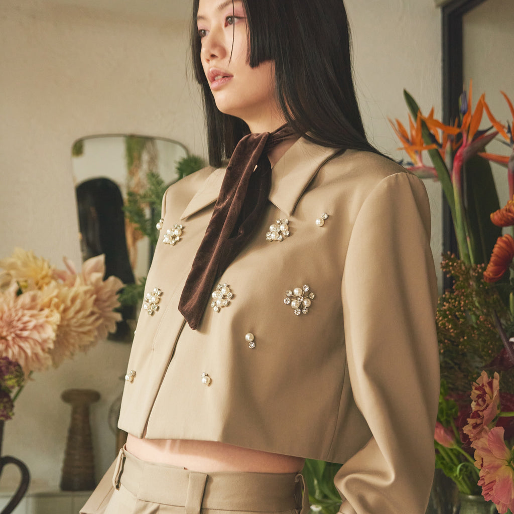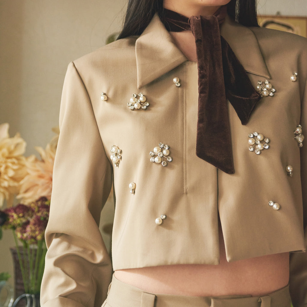 パールとダイヤカットの2パターンをオリジナルで組み合わせたビジューがアイキャッチー。1点1点手付けし全体に散りばめ、ラグジュアリーなジャケットに仕上げました。