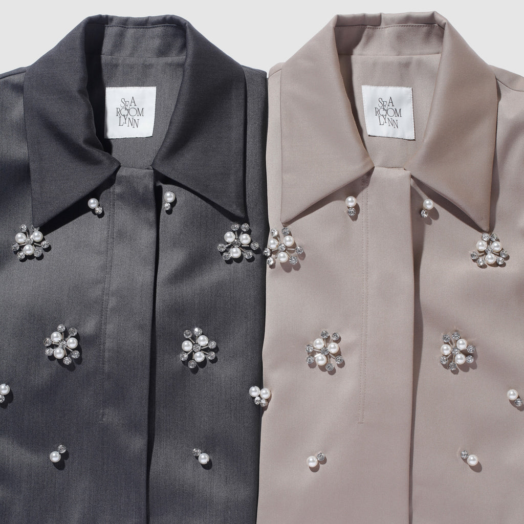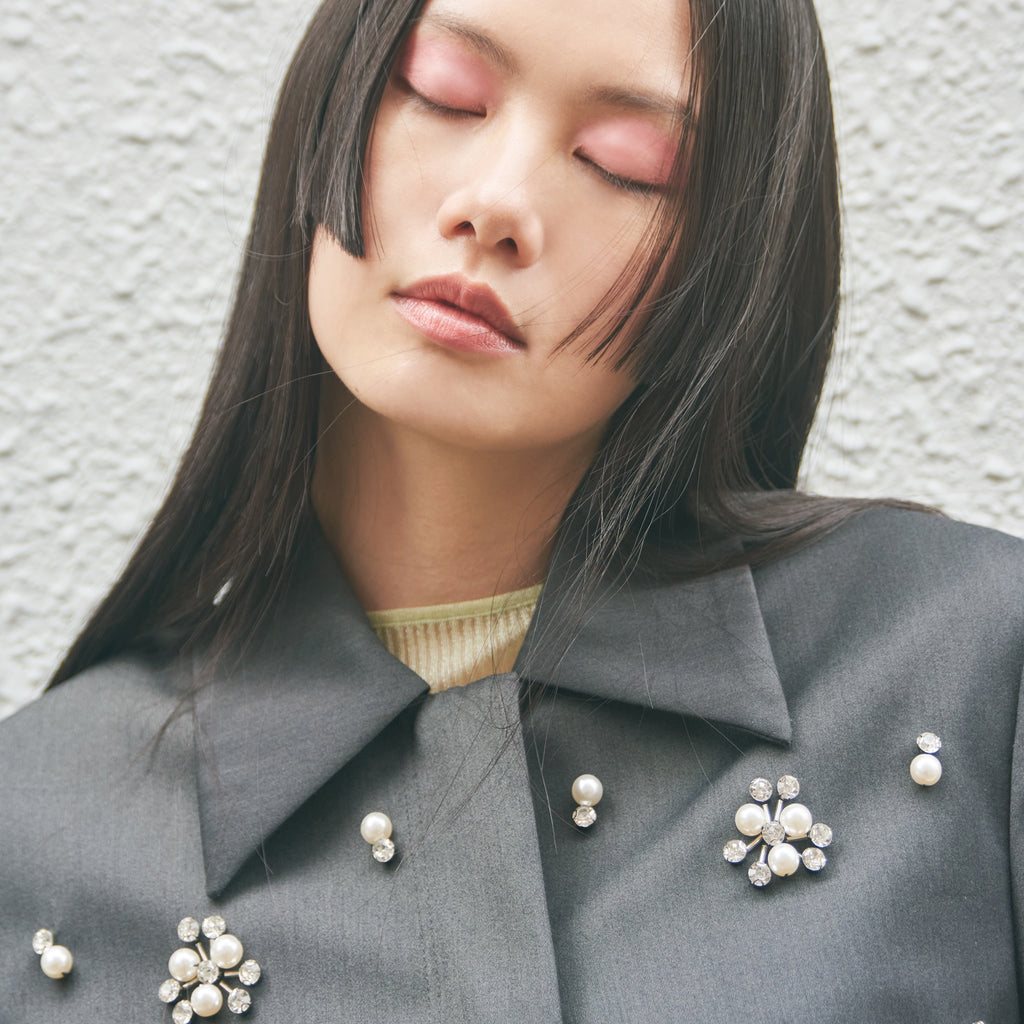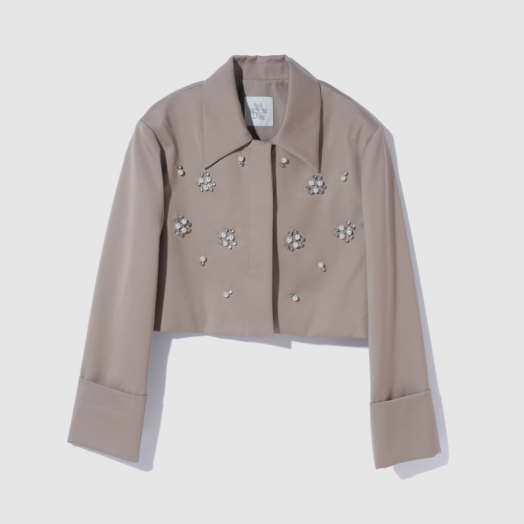 パールとダイヤカットの2パターンをオリジナルで組み合わせたビジューがアイキャッチー。1点1点手付けし全体に散りばめ、ラグジュアリーなジャケットに仕上げました。