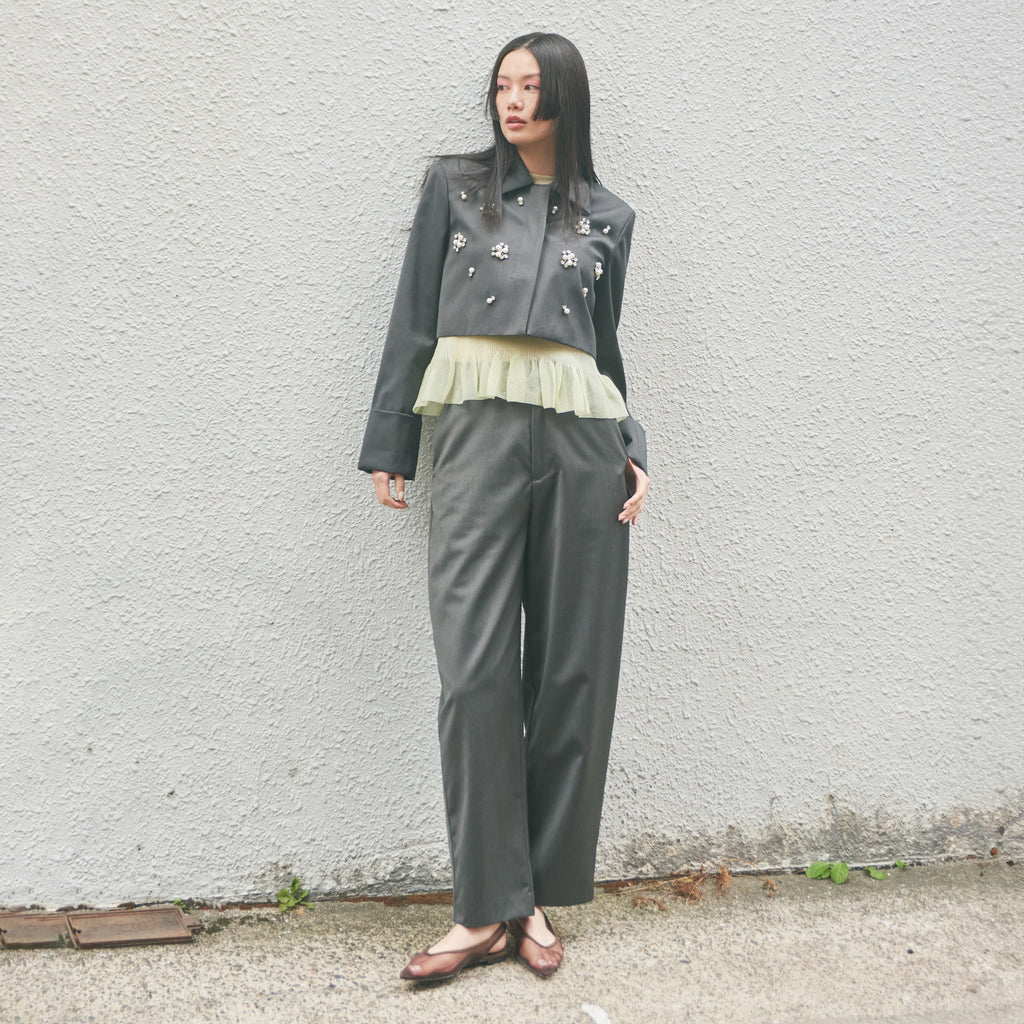 〈Glitter SheerフリルRIBニット〉と合わせると、ちょうどニットのフリルがジャケットから出る好バランス。冠婚葬祭では〈Flowy Fabric Curve Slacksパンツ〉とのセットアップや〈ソフトフレアスパゲッティワンピース〉などワンピースの上から羽織って、デイリー使いではデニムやチュールスカートなどで気崩してお使いください。