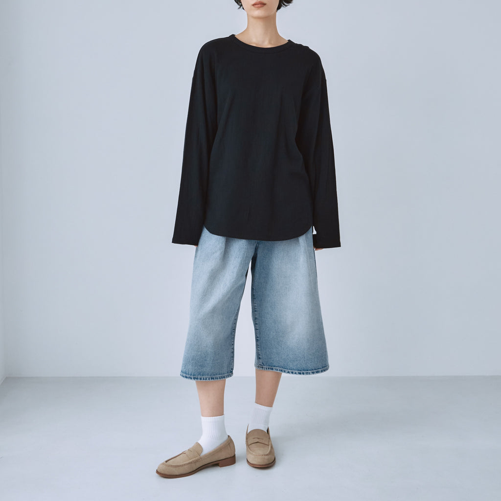ワイドストレートのデニムをカットしたようなデザイン。タックを入れることによってウエストからヒップにゆとりが生まれ、シルエットに立体感が出ています。