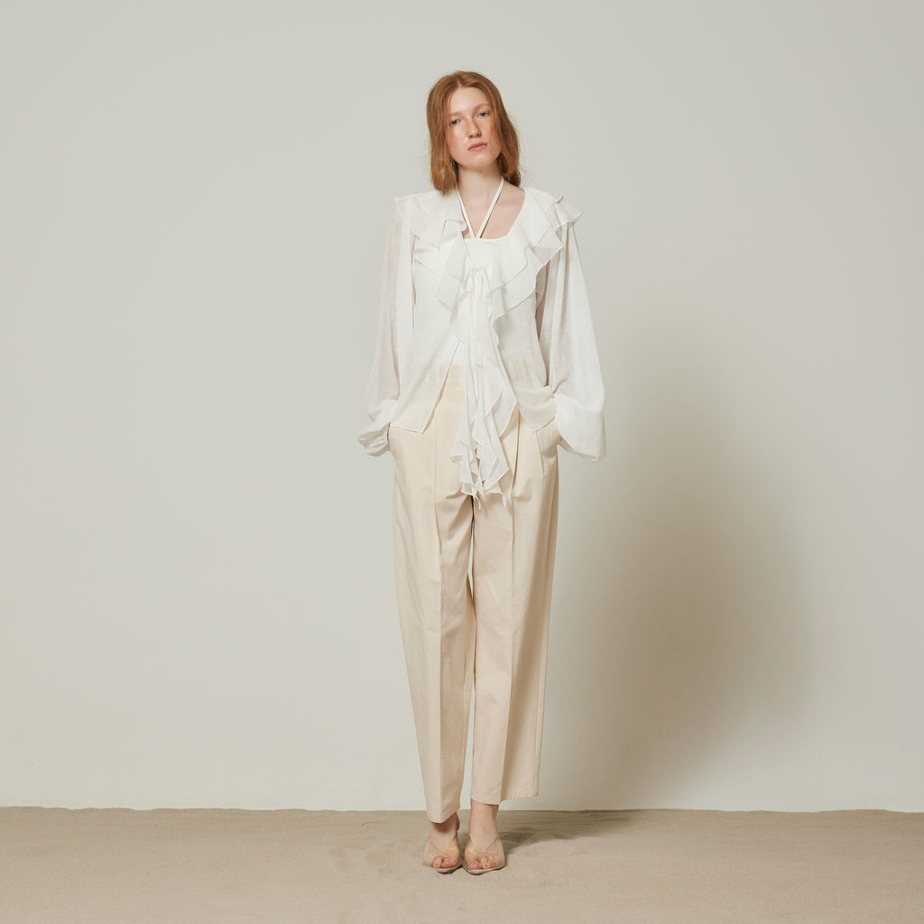 ウエスト、ヒップにボリュームを持たせながら裾幅を狭く仕上げたテーパードシルエット。ウエストは大きめに設定しゆるさを出しています。腰履きも可能なので、ずるっと落として今年らしいルーズな雰囲気もお楽しみいただけます。股下もやや長めの設定なので、折り返して履いてもOK。