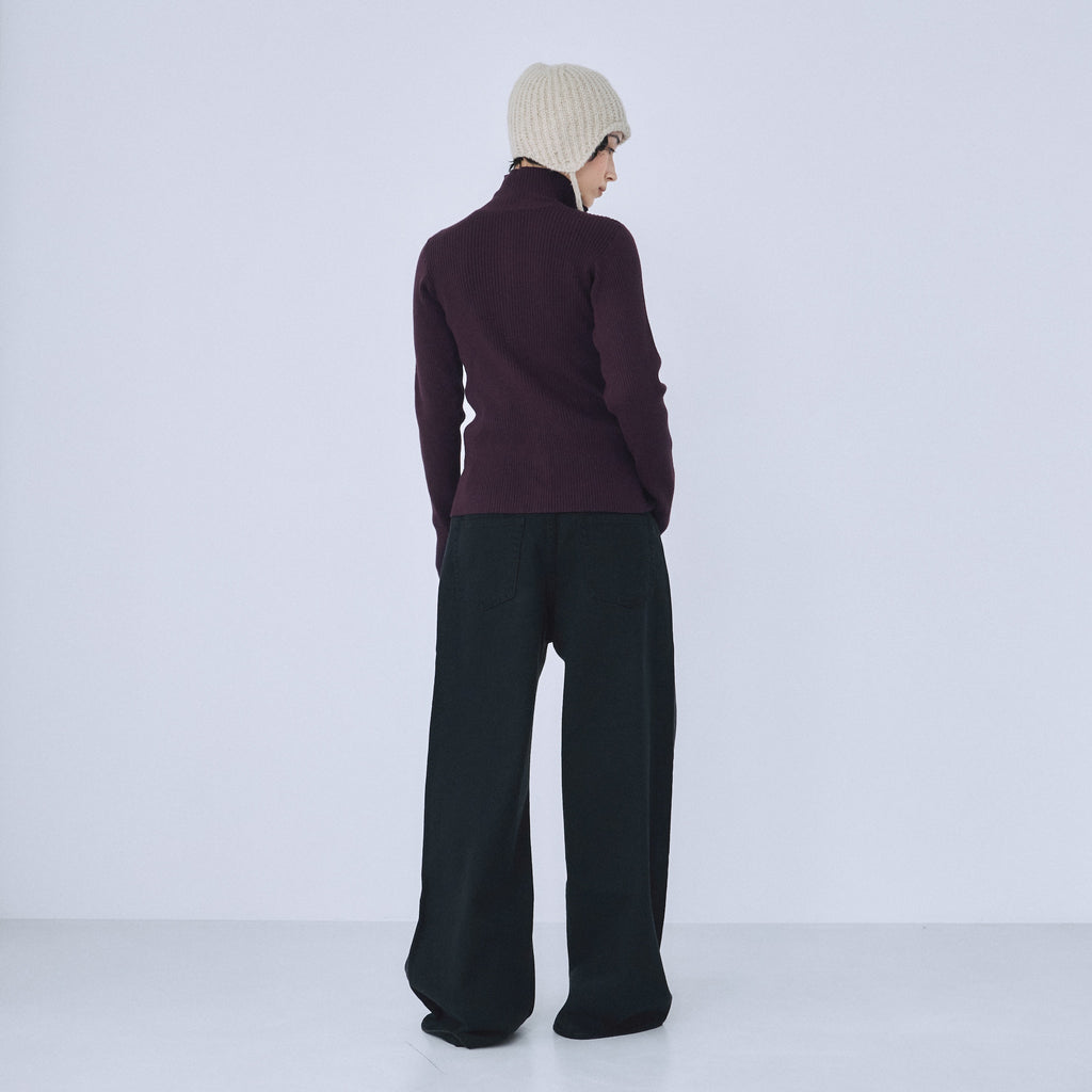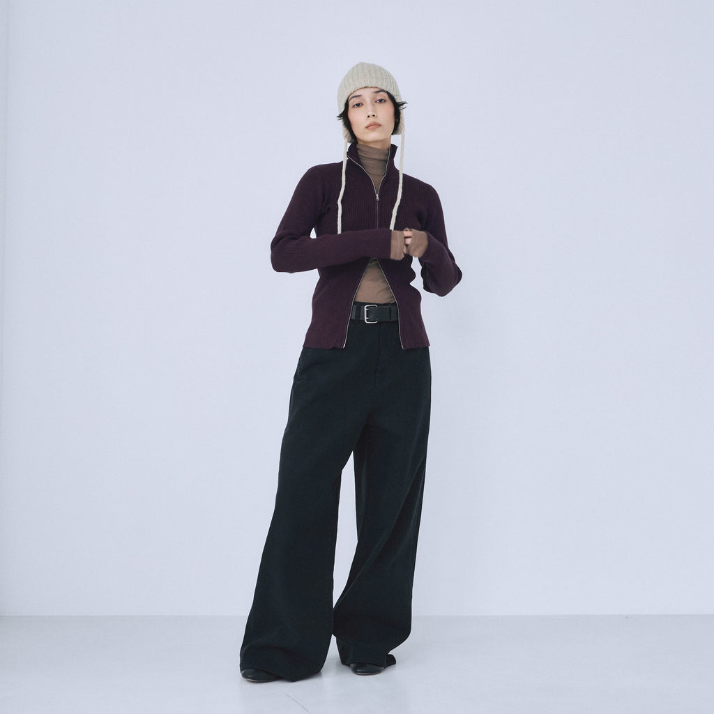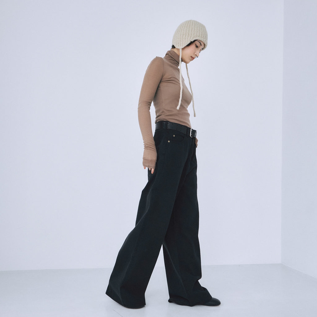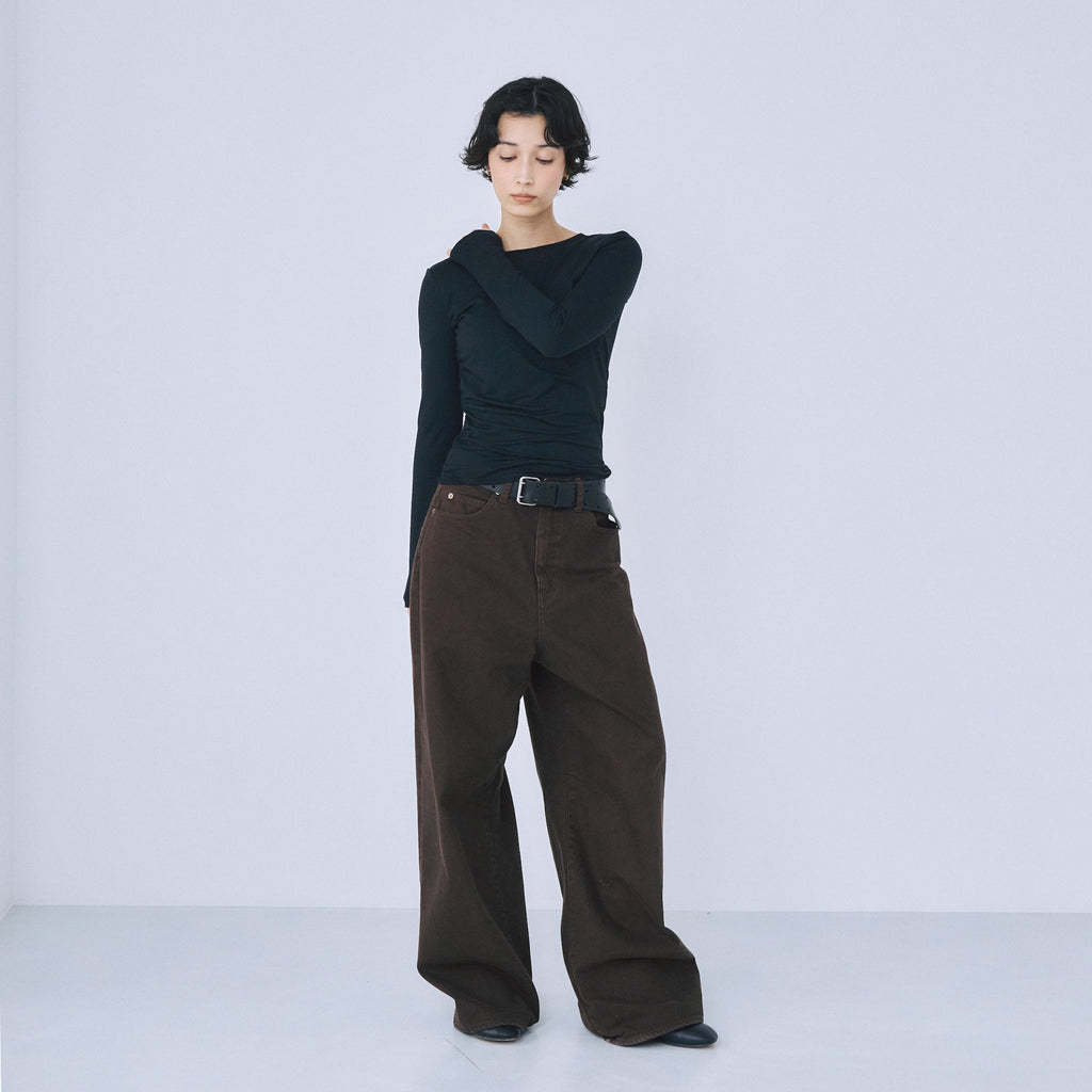 ※〈ワイドルーズHigh/Low SRN05〉をベースにウエスト−1cm、ヒップ+4cm、ワタリ〜ヒザはそのまま、裾−4cmにすることで、よりルーズに仕上げると共に、ややテーパードラインへと変更しています。また、股底を約2cm下げているため、よりずるっとした印象に。