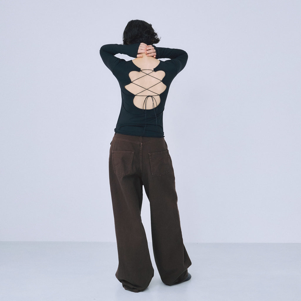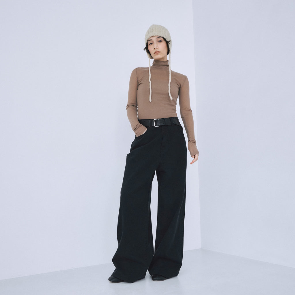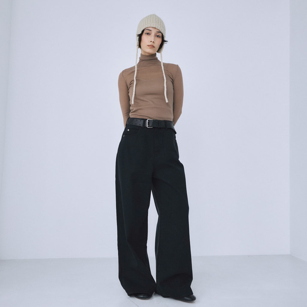ウエストは腰履きを前提とし、ゆとりを持たせています。いつものサイズをお選びいただければ自然と腰位置で止まり、こなれたシルエットが完成します。