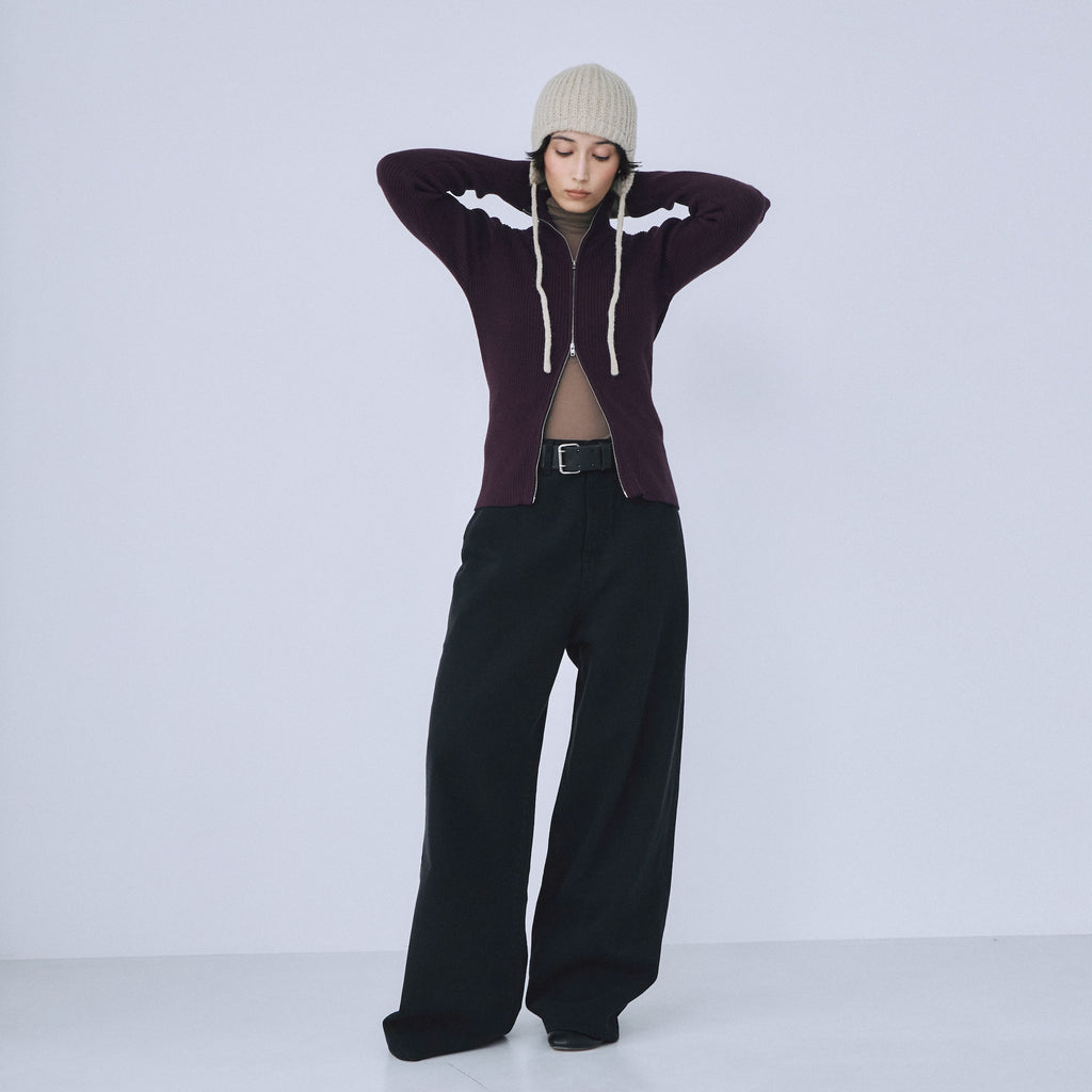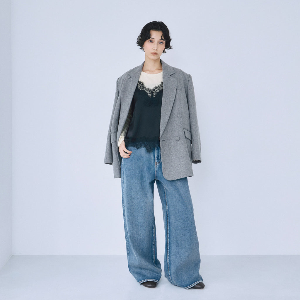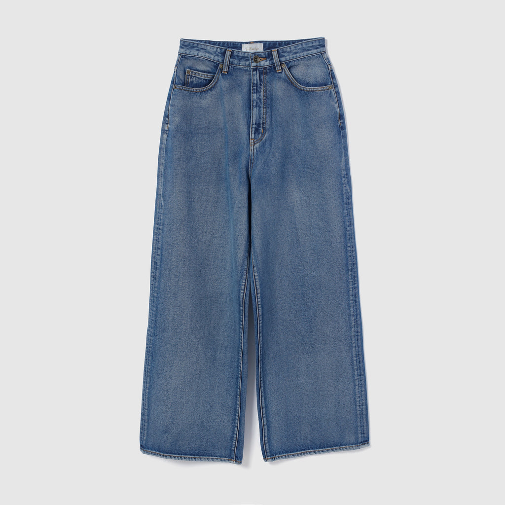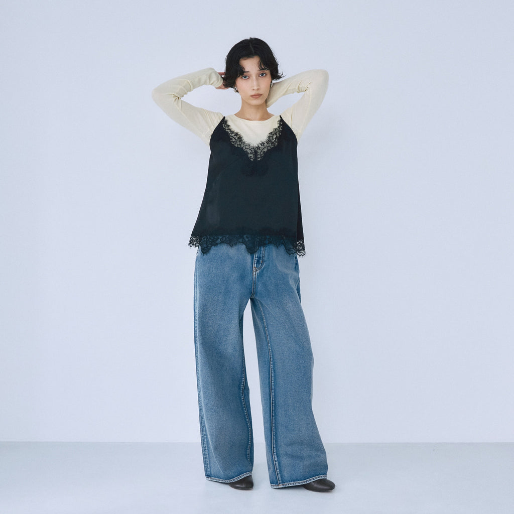 SRLデニムの中でも股上が最も深いアイテム。ハイウエストでピタッと履くのではなく、あえて腰位置まで落として履くのがこのデニムの正解。裾にたっぷりと生地の溜まるルーズさが、抜け感と今っぽさを強調します。