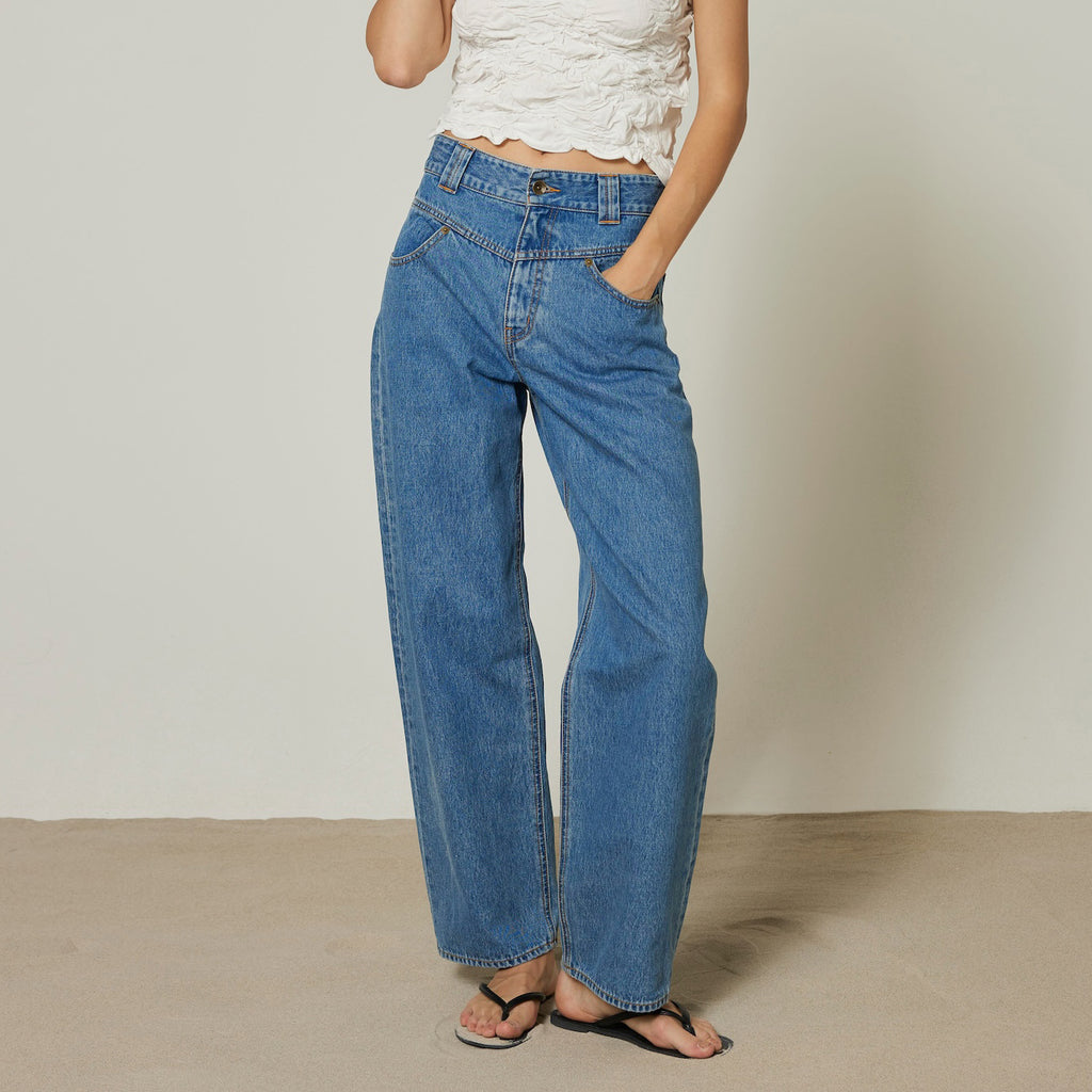 ウエスト下に入ったヨーク切り替えが自然な立体感をプラス。視覚的に腰位置が高く見えるため、スタイルアップにも効果的です。通常のデニムよりも構築的な表情を持ち、ラフすぎず洗練された印象に。きちんと感とカジュアル感のバランスをポイントにしました。太めベルトループもアクセント。