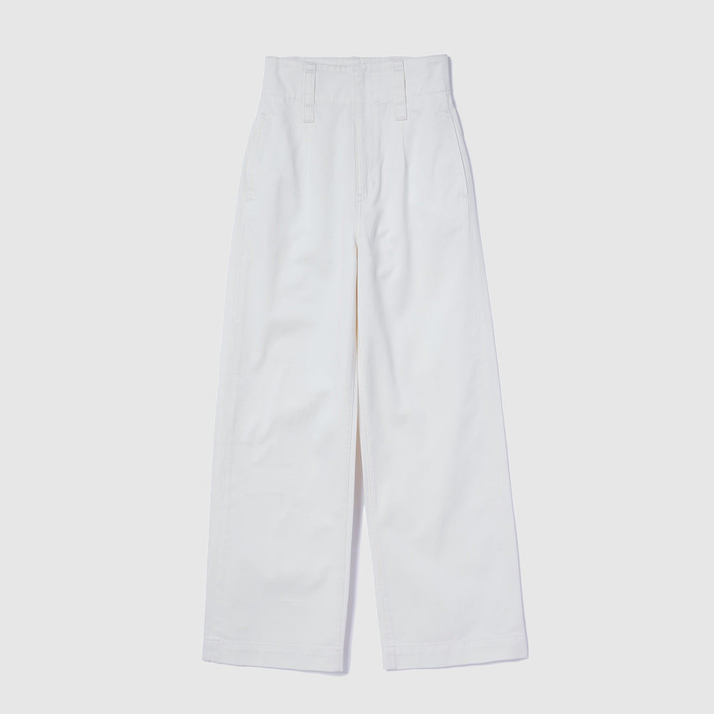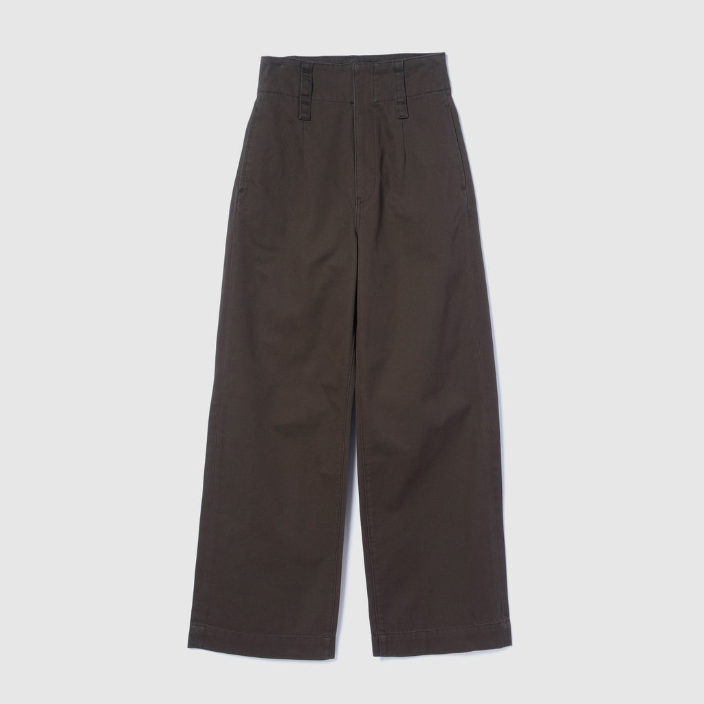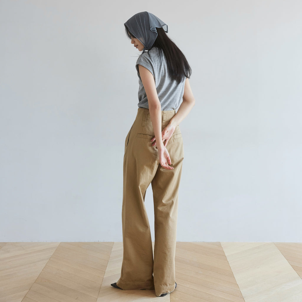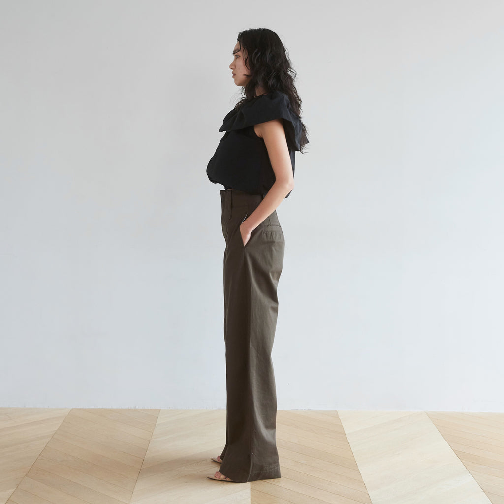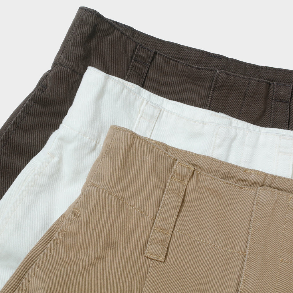 ハイウエストに設定した、立ち姿が美しいチノパンツ。スラックスのデザインを踏襲し、カジュアルすぎないのがポイントです。新色「ダークブラウン」「ホワイト」も追加となりました。