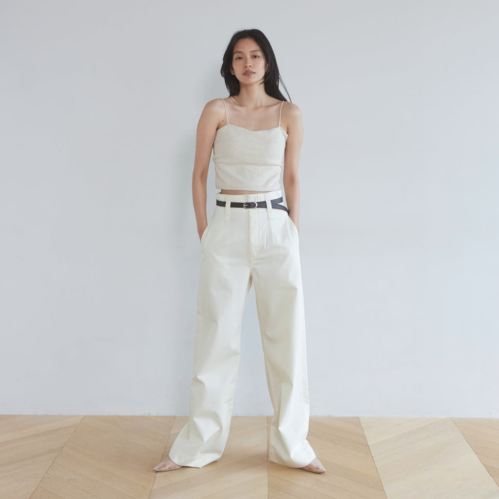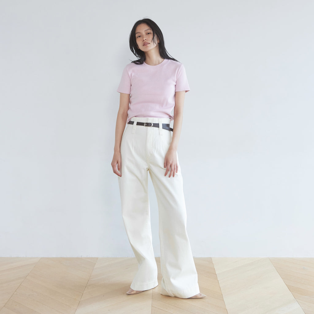 丈の短いトップスと合わせると今年らしいスタイリングに。裾をINしても◎。ベルトを合わせるのもおすすめです。