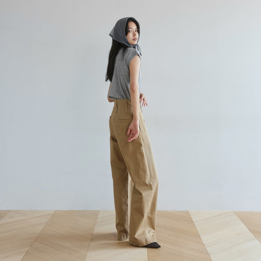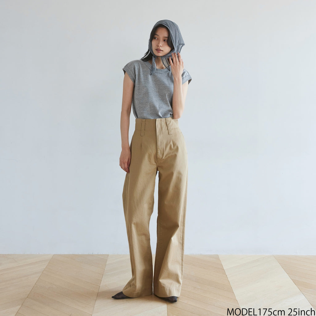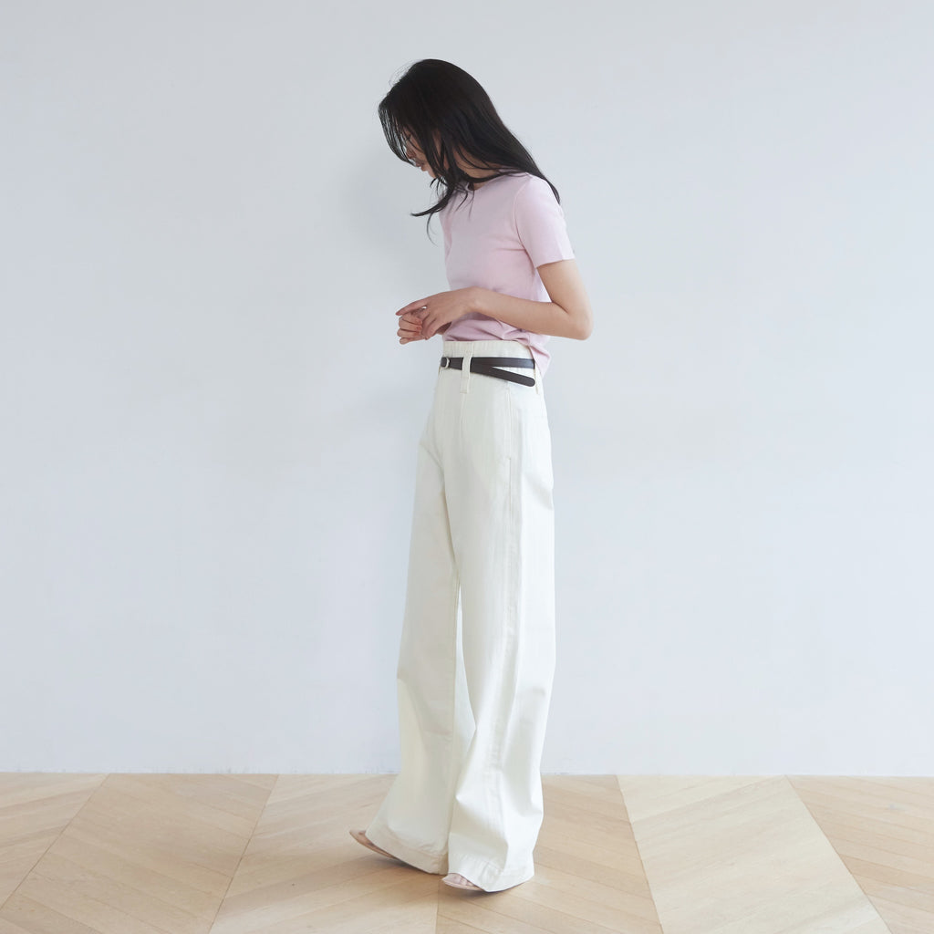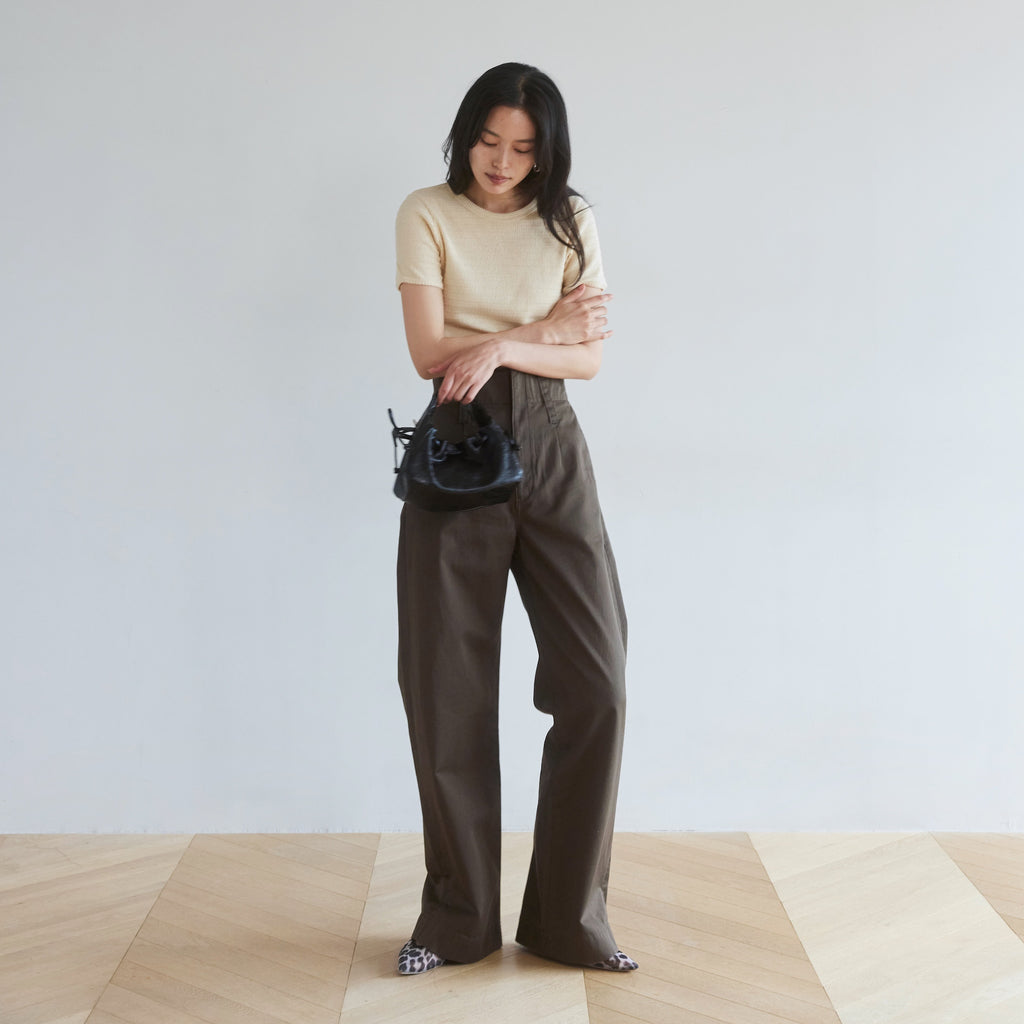 ハイウエスト×ソフトワイドで縦に長く見えるスタイルアップな1本。通常より長くお作りしているため、身長の高い方にもおすすめです。高さのあるベルトループでウエストマークもOK。