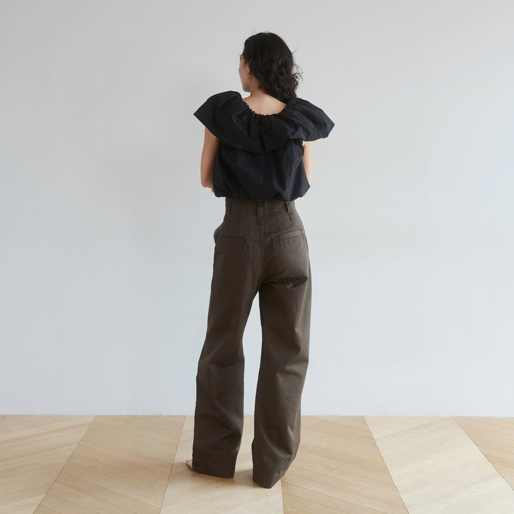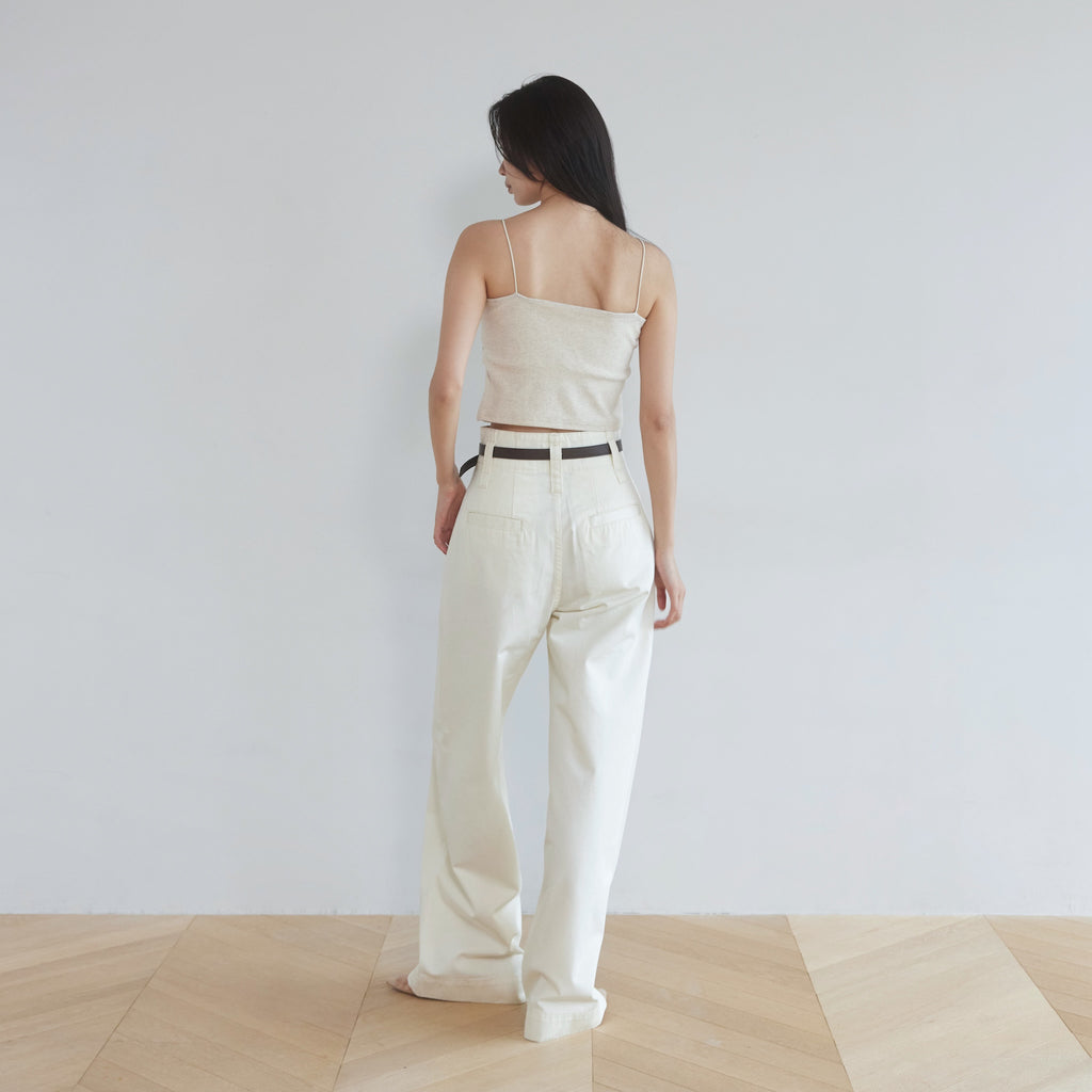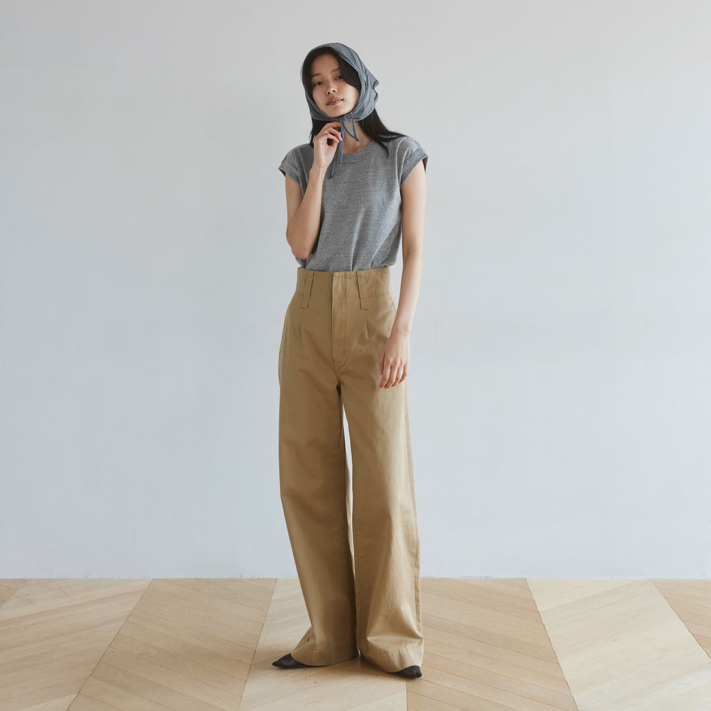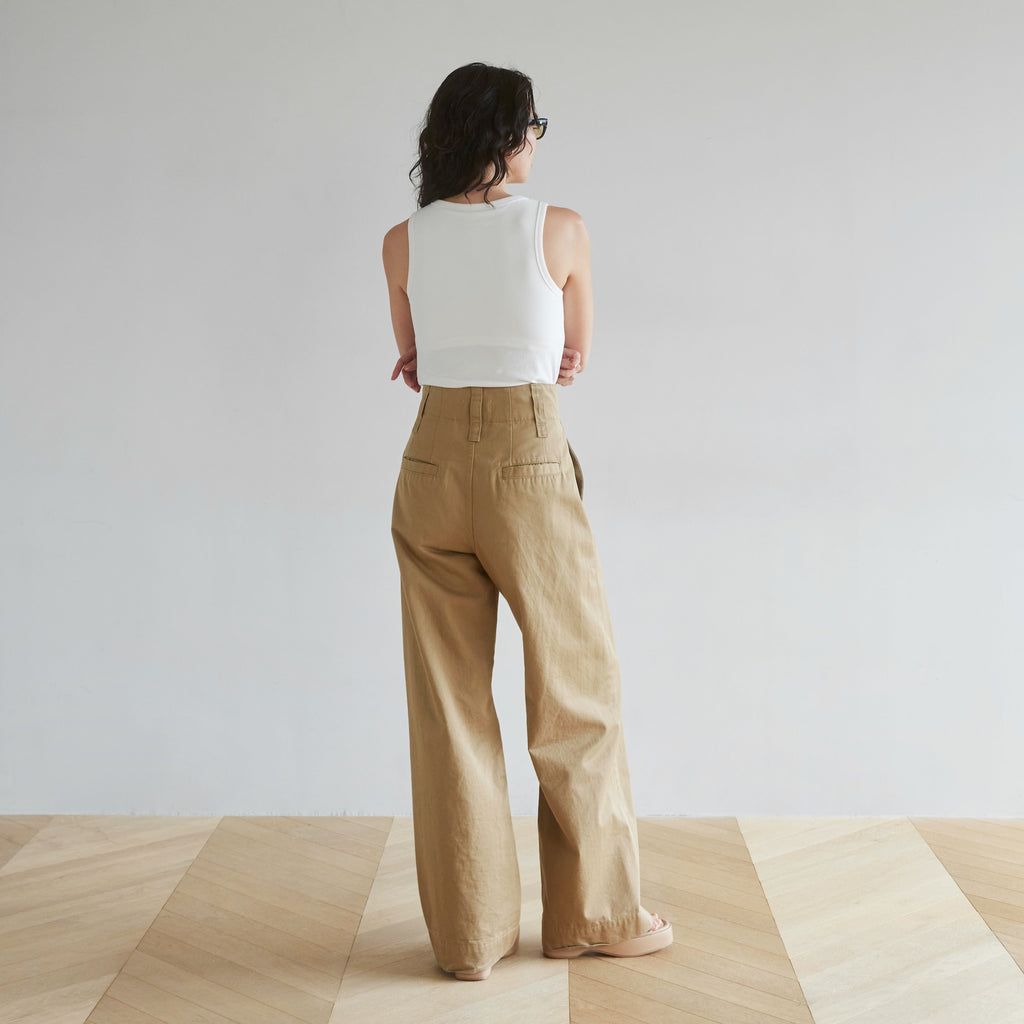 ハイウエスト×ソフトワイドで縦に長く見えるスタイルアップな1本。通常より長くお作りしているため、身長の高い方にもおすすめです。高さのあるベルトループでウエストマークもOK。