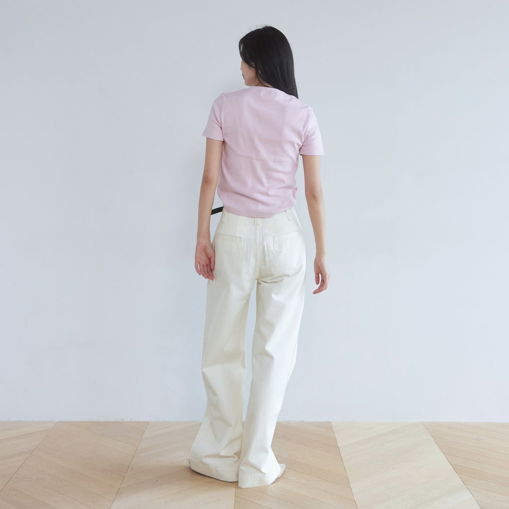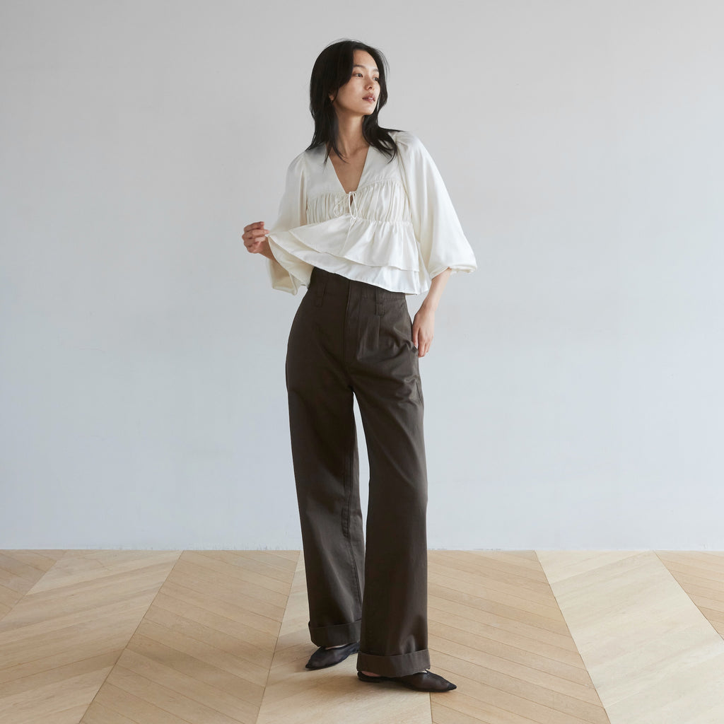 幅広な裾は折り返しても履けるようにデザインしています。折り返さずにズルッと履くとトレンドの着こなしが完成します。