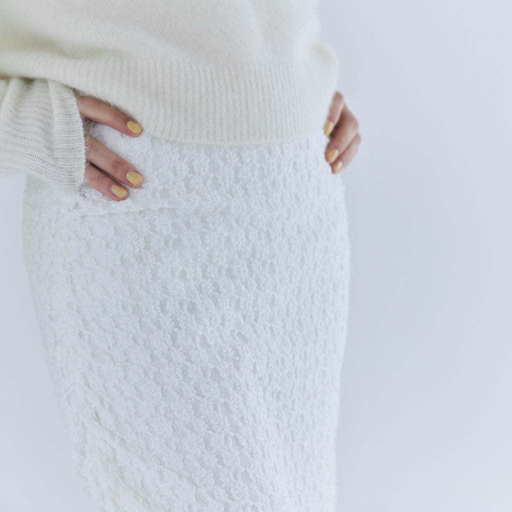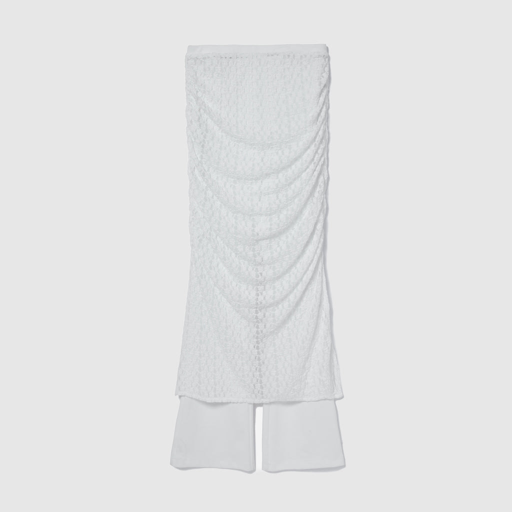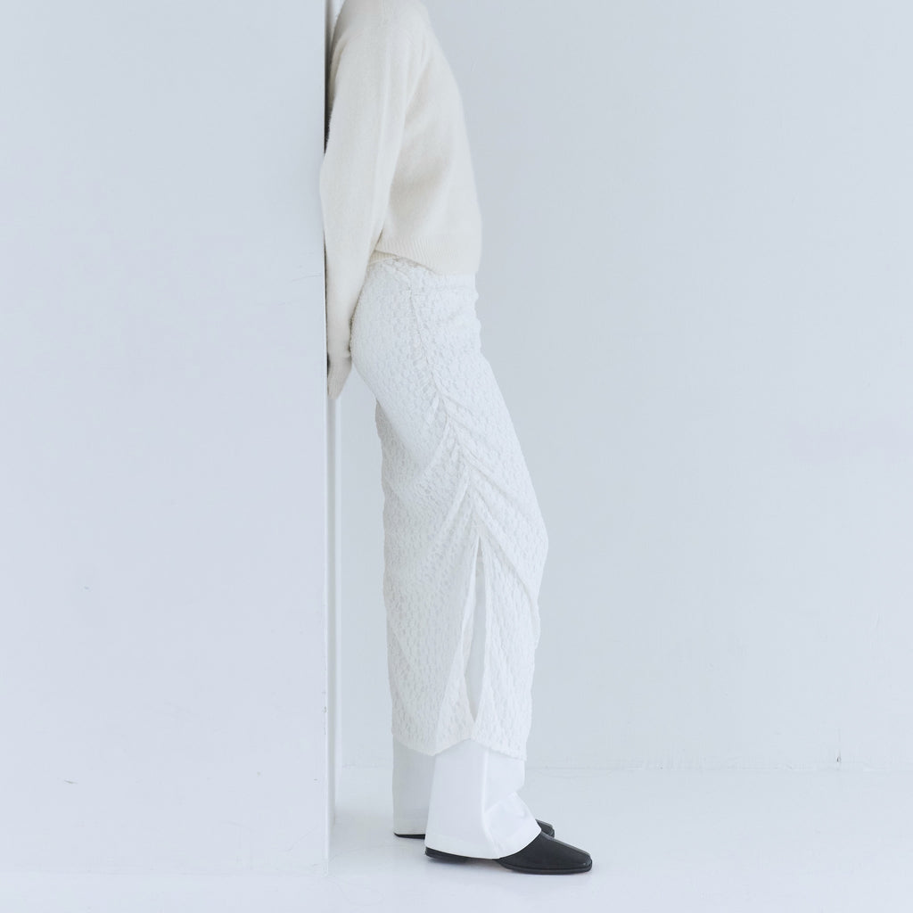 【コーデに奥行きを与える異素材MIX】「ブラックチュール」は透け感のあるパワーメッシュ生地、「ホワイトレース」は小花柄のストレッチレースのシアースカート。パンツはどちらのカラーも伸縮性のあるポンチ素材を採用。綺麗な表面感が特徴で、表のスカートとの素材のコントラストをお楽しみいただけます。