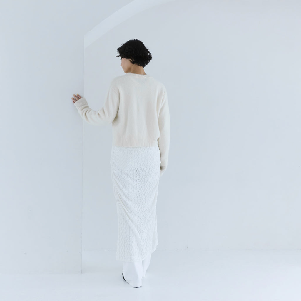 【ギャザーで表情をプラス】スカートのギャザー分量は素材ごとに調整し、それぞれが最も美しく見えるバランスに。「ホワイトレース」は重さ、厚みもあるので生地分量を減らし、ギャザーを少なくしてスッキリした見え方にしています。逆に「ブラックチュール」はしっかりギャザーを目立たせ、ワンポイントに。