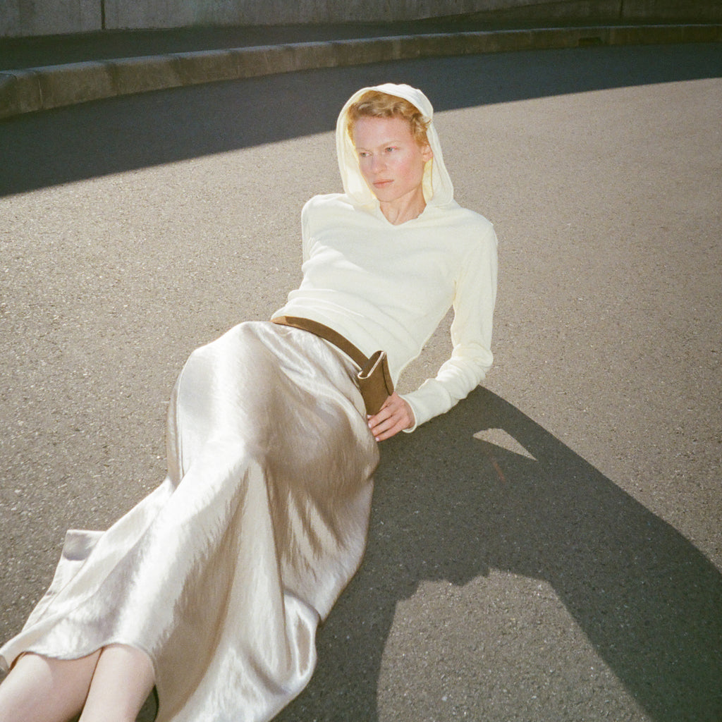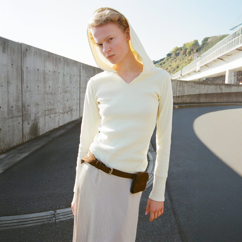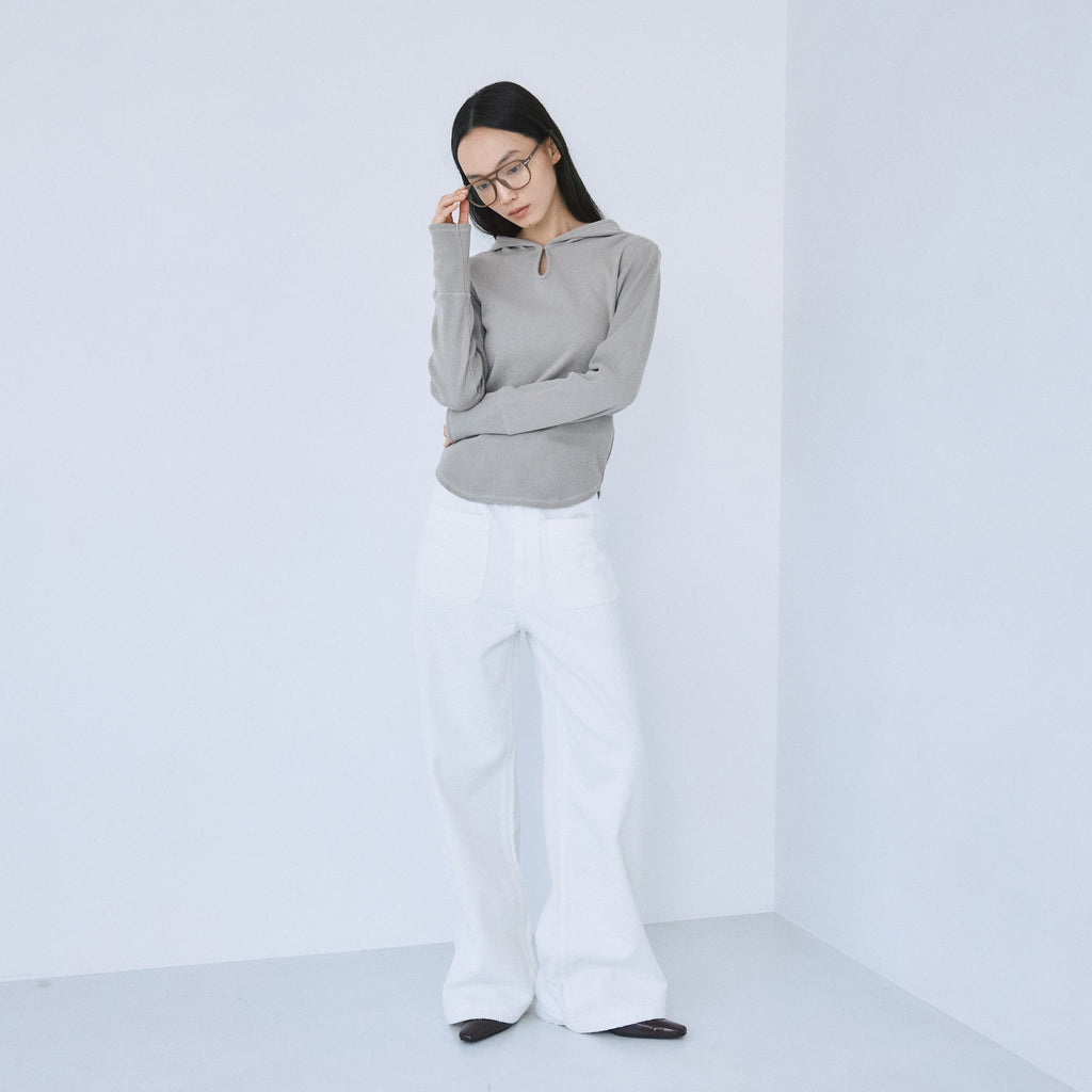 縦リブがスタイルアップを助け、ラウンドヘムの丸みが女性らしいシルエットを叶えます。