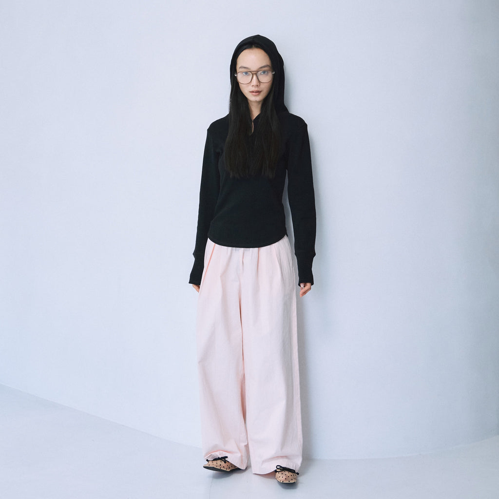 デニムやワイドパンツに合わせてカジュアル見えのスタイリングにはもちろん、アウターの中に着てフードを出した合わせはキャッチーでおすすめなコーディネートです。