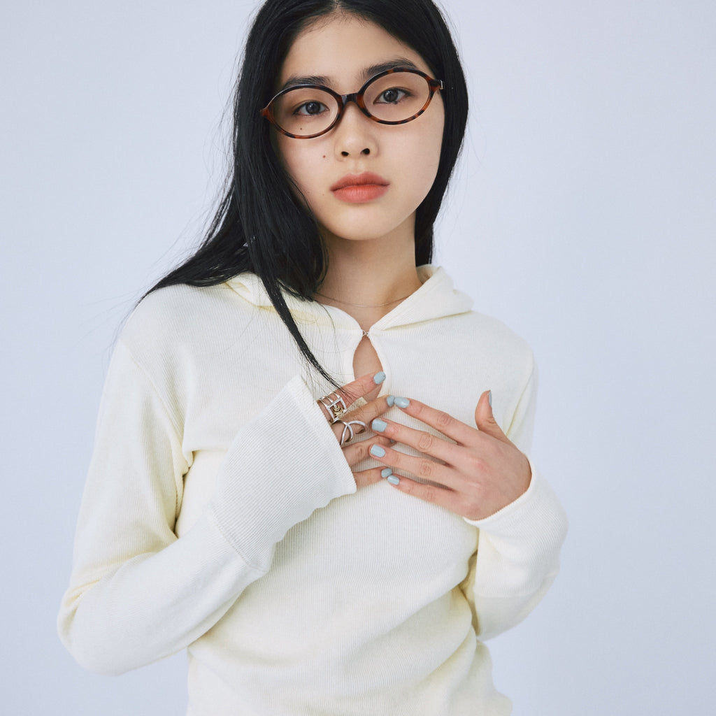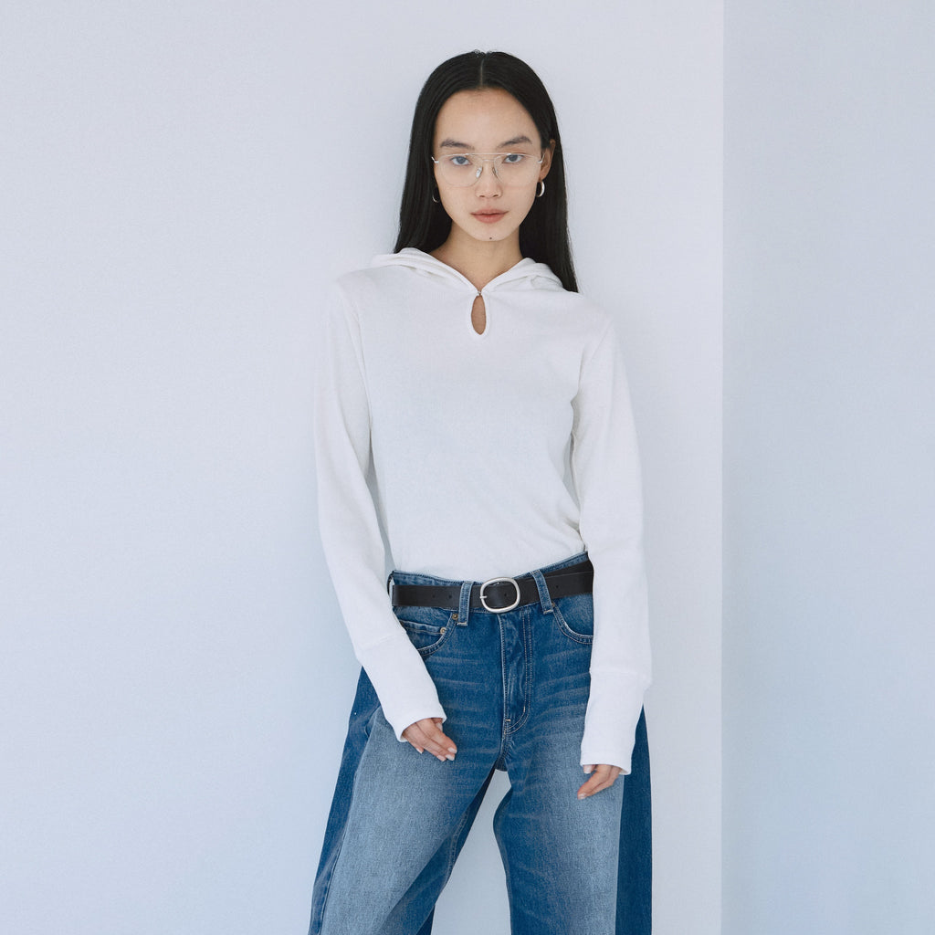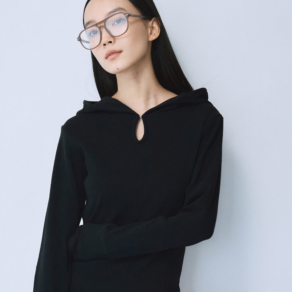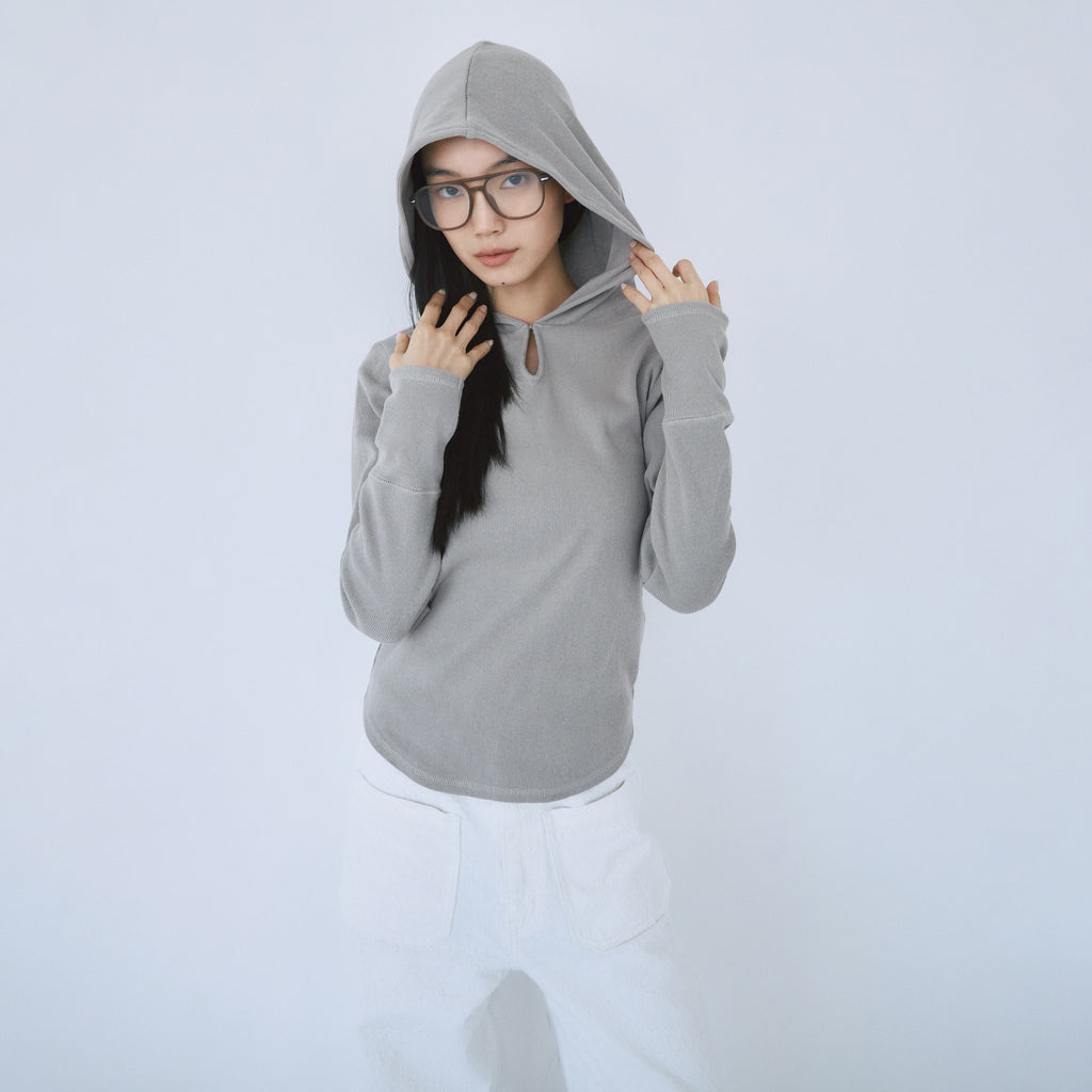 衿元のホックでさりげない肌見せが可能なティアドロップ風フードデザイン。