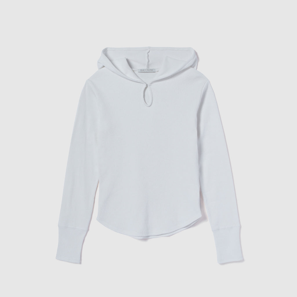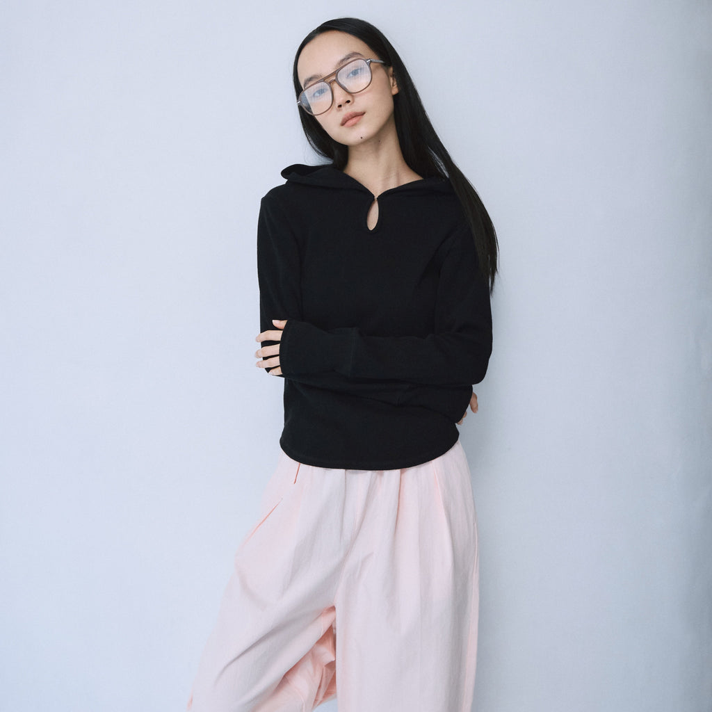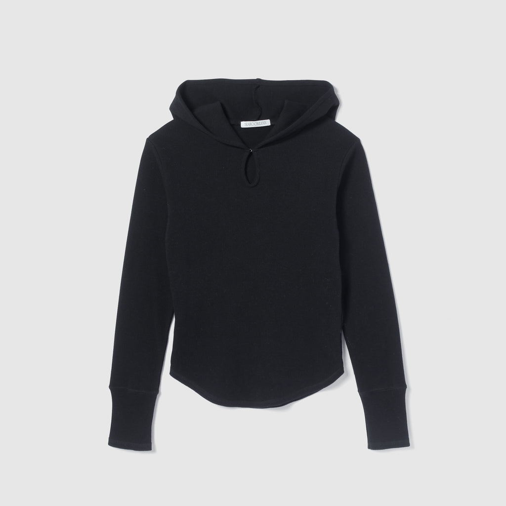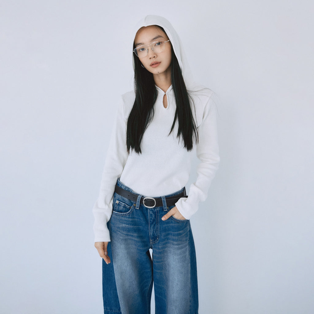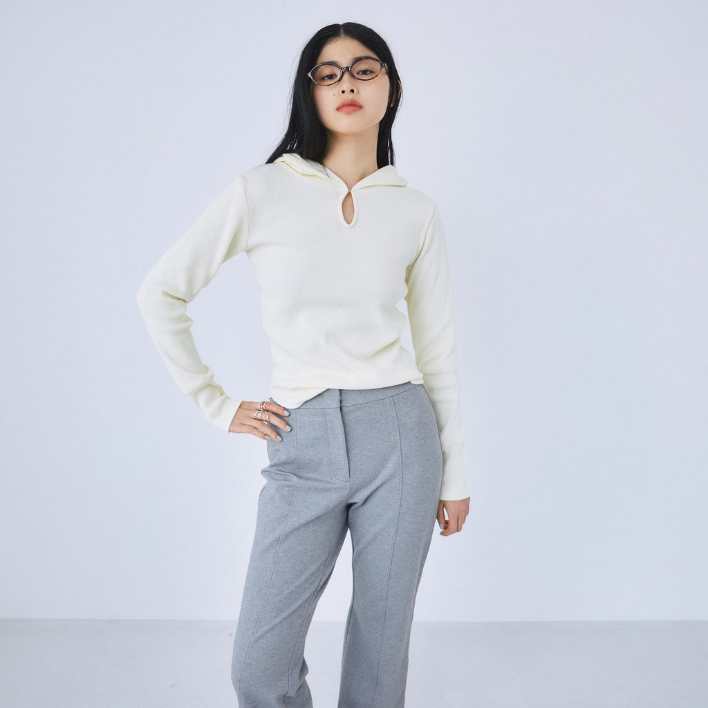衿元のホックでさりげない肌見せが可能なティアドロップ風フードデザイン。