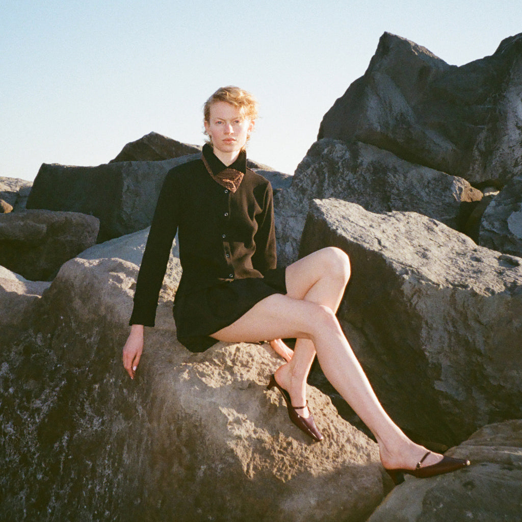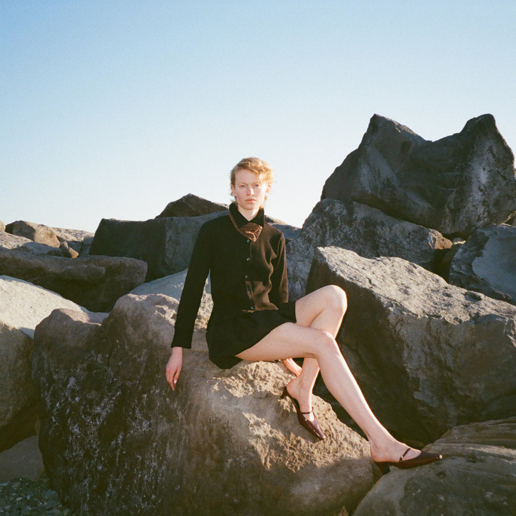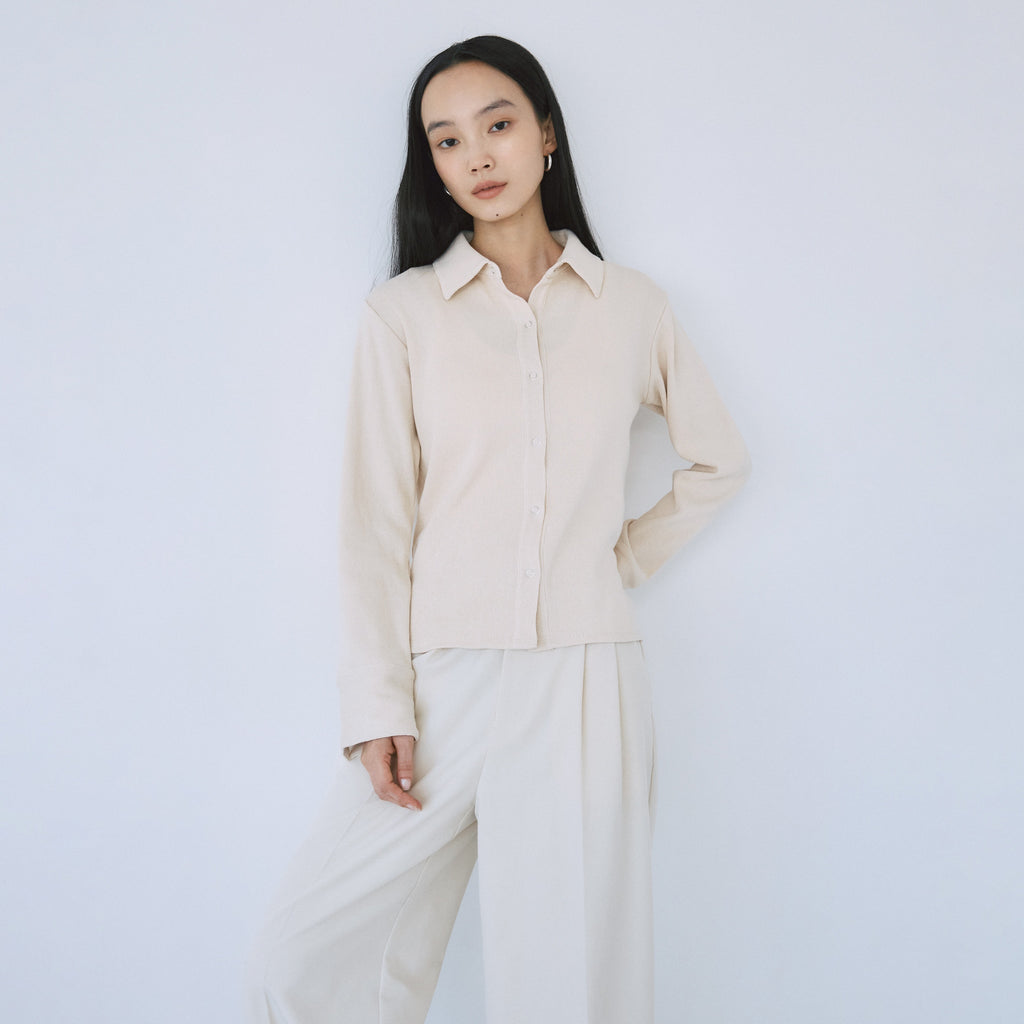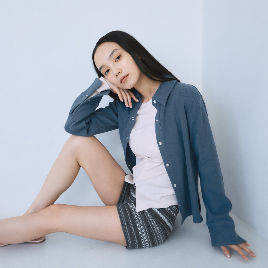 縦のリブ表情がすっきり見せを叶え、リングボタンや布帛ライクなディテールが上品なアクセントに。