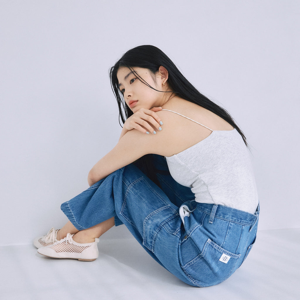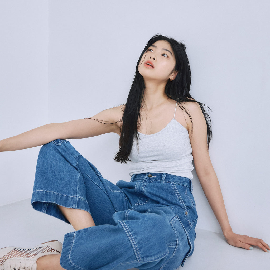 ウエスト部分にわずかな絞りを入れることで自然なくびれを作り、トップスインした際もスマートに収まるバランスに設計しています。