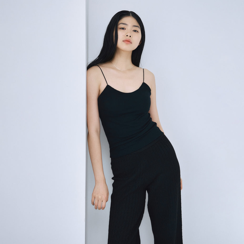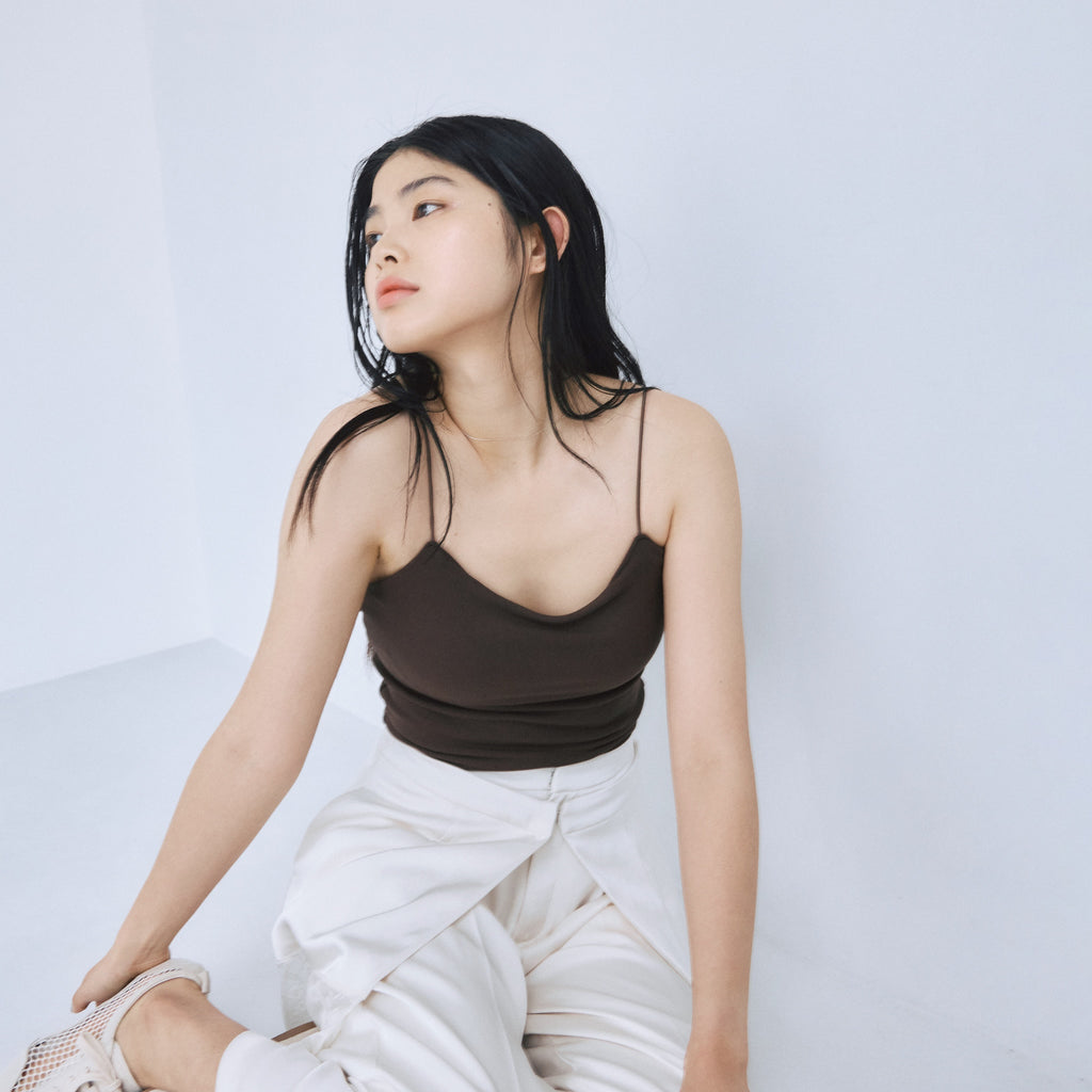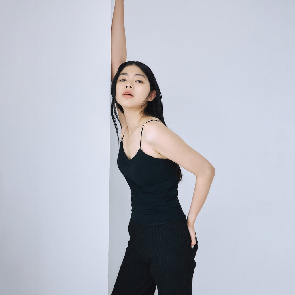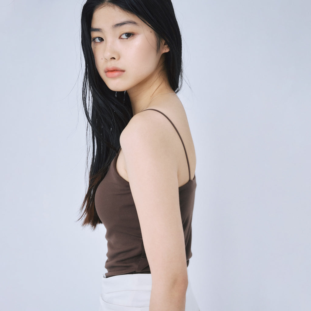 とろみのある天竺生地に下厚モールドカップを内蔵したFitパッドマシュマロスパゲッティキャミソール。