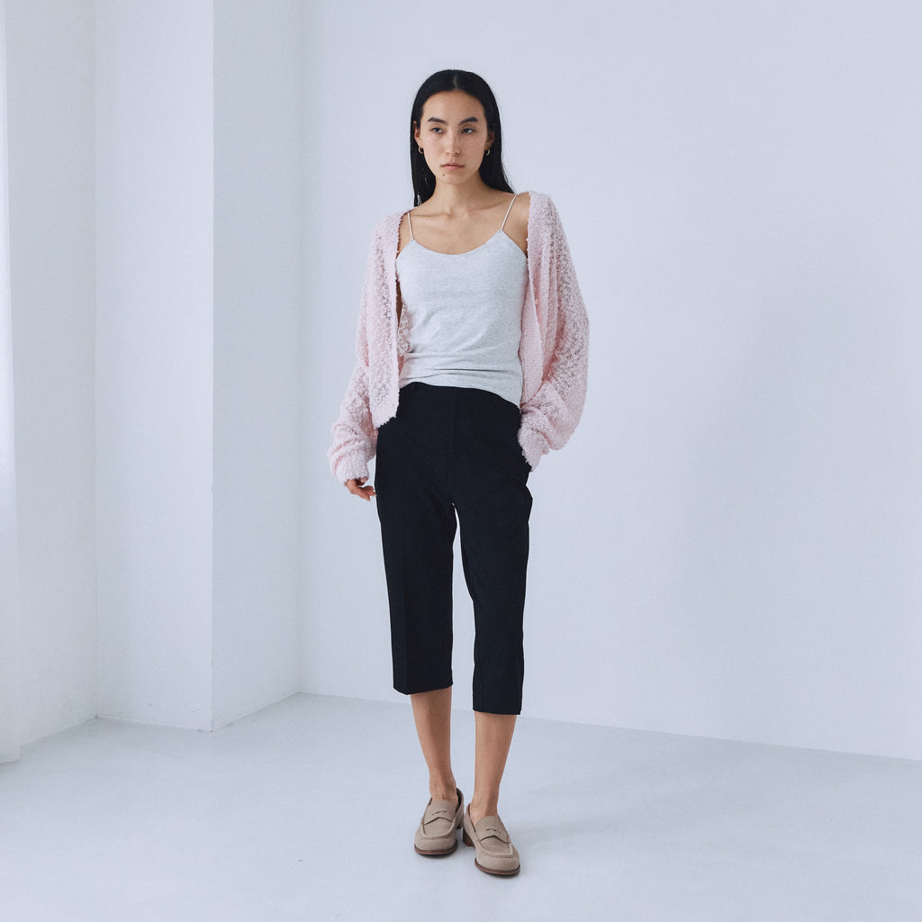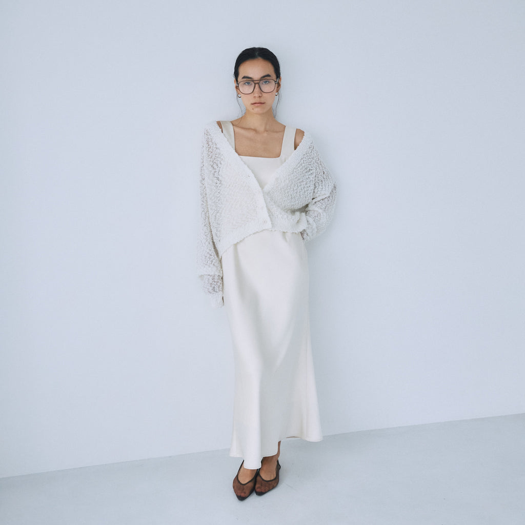 デコルテを綺麗に見せるレディな肌見せと、カーディガンらしいカジュアルさを両立させました。