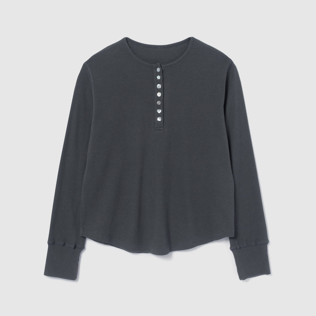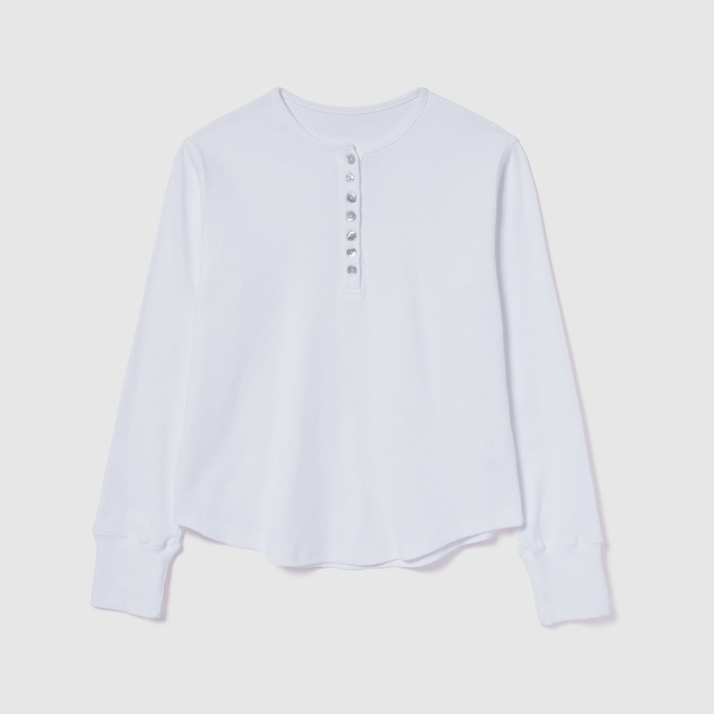 形の異なるシェルボタンをランダムに配置し、シンプルなヘンリーネックにプレイフルなアクセントを加えました。