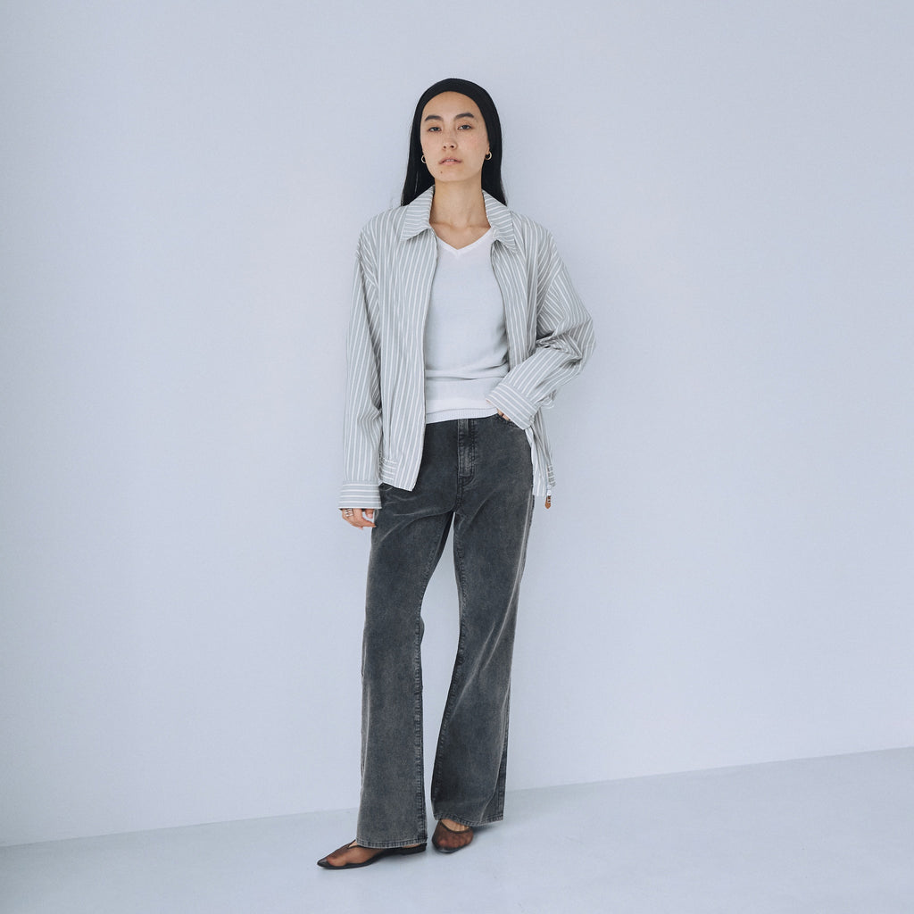 太細ストライプの細見え効果を活かし、シンプルなTシャツやワンピースにさらりと羽織るのがおすすめ。