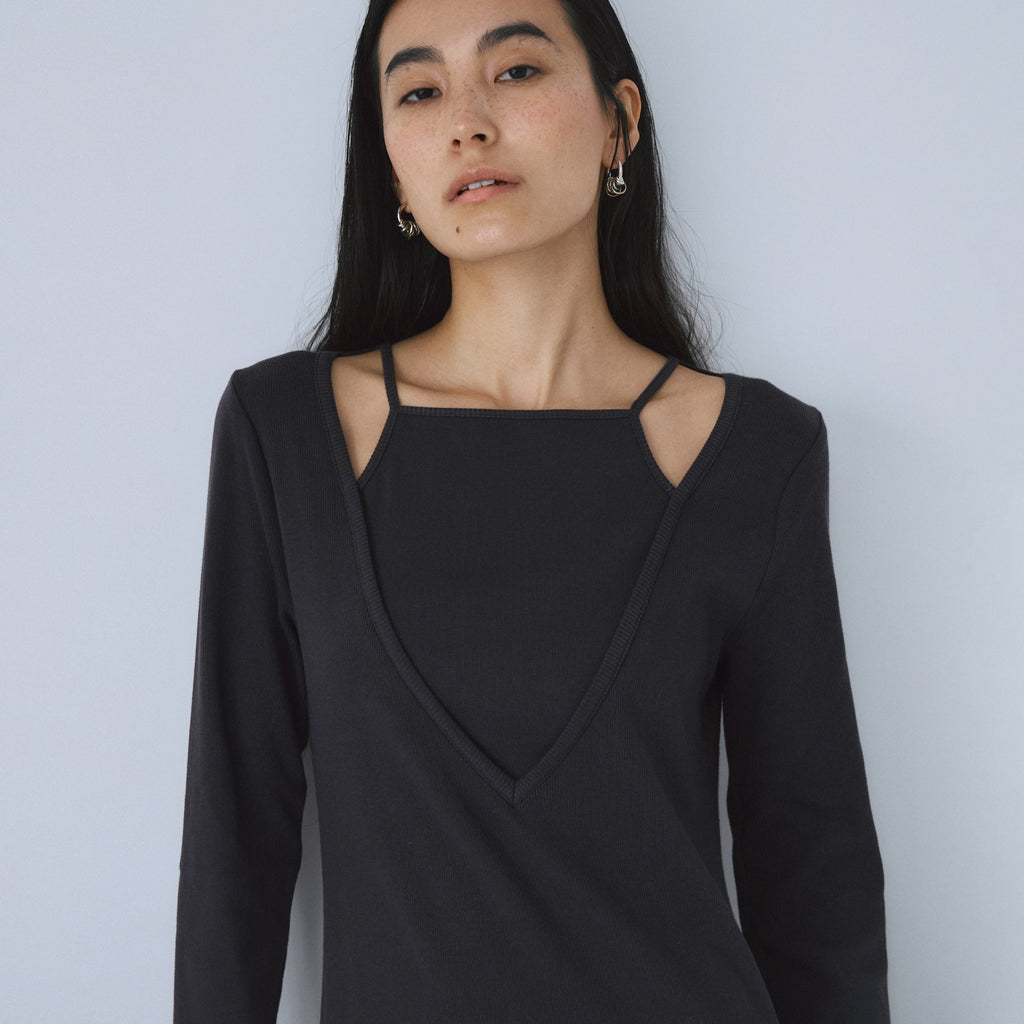 前だけでなく、後ろから見た時も自然な重ね着に見えるよう、ネックの開き加減まで徹底的にこだわり抜きました。