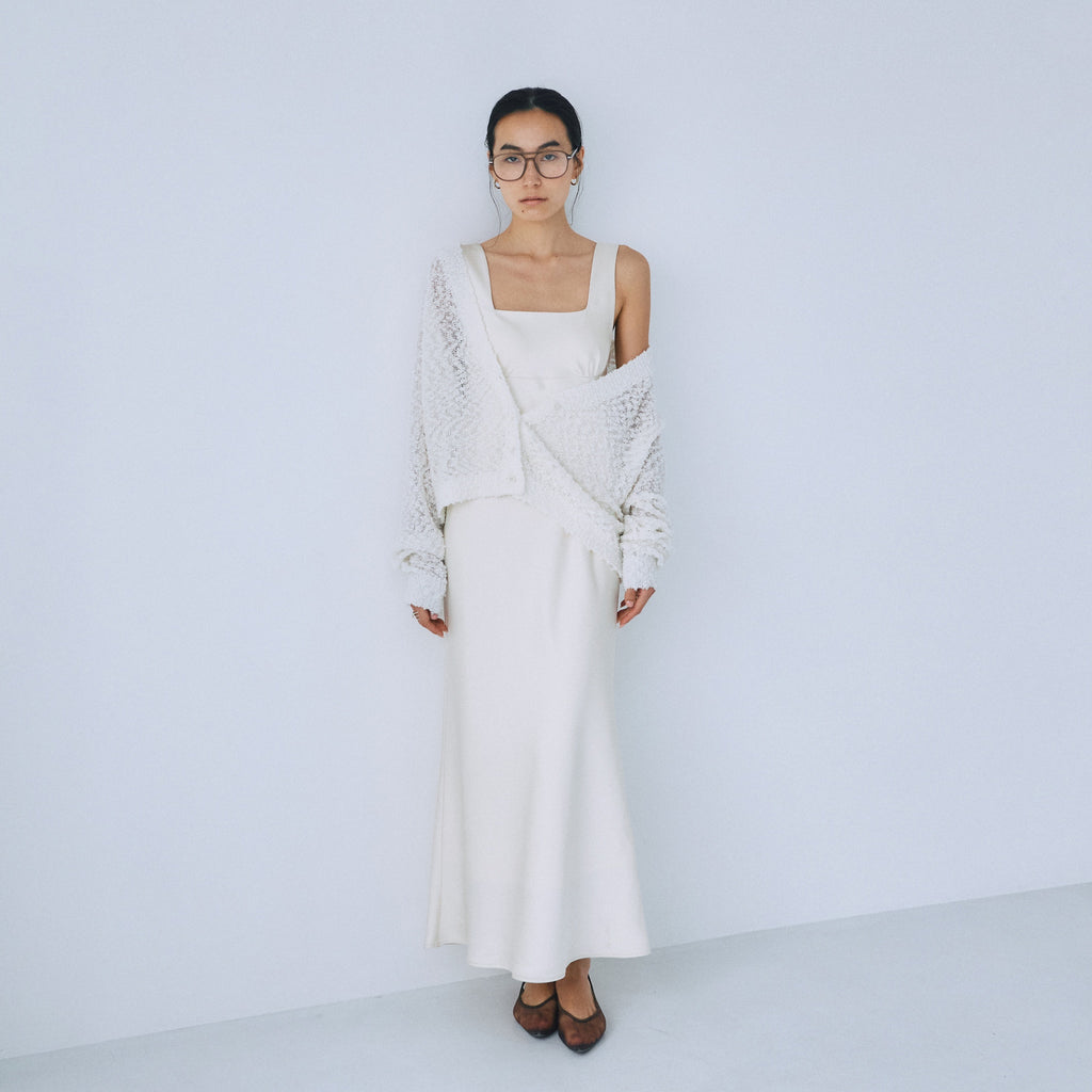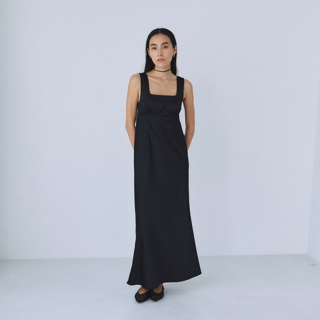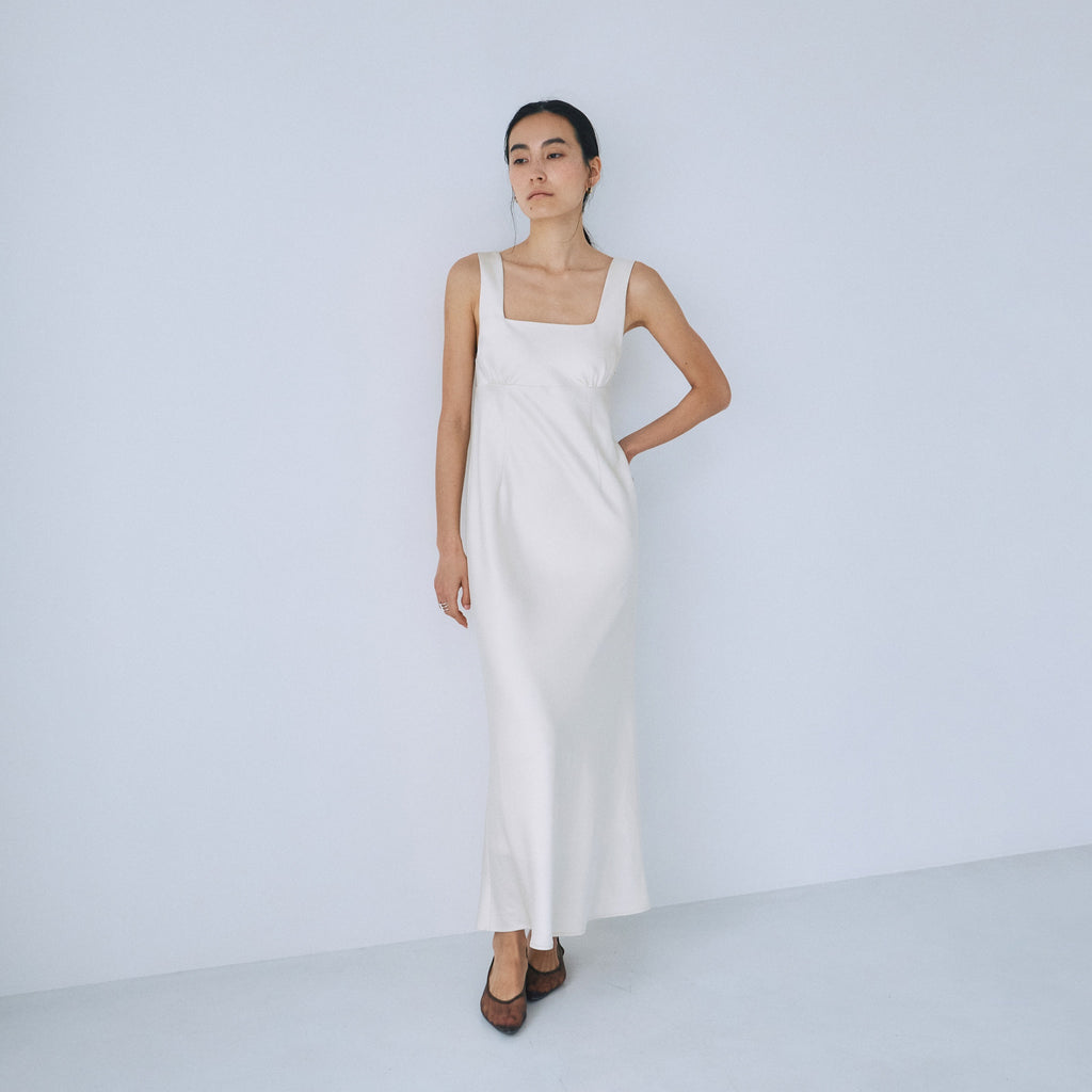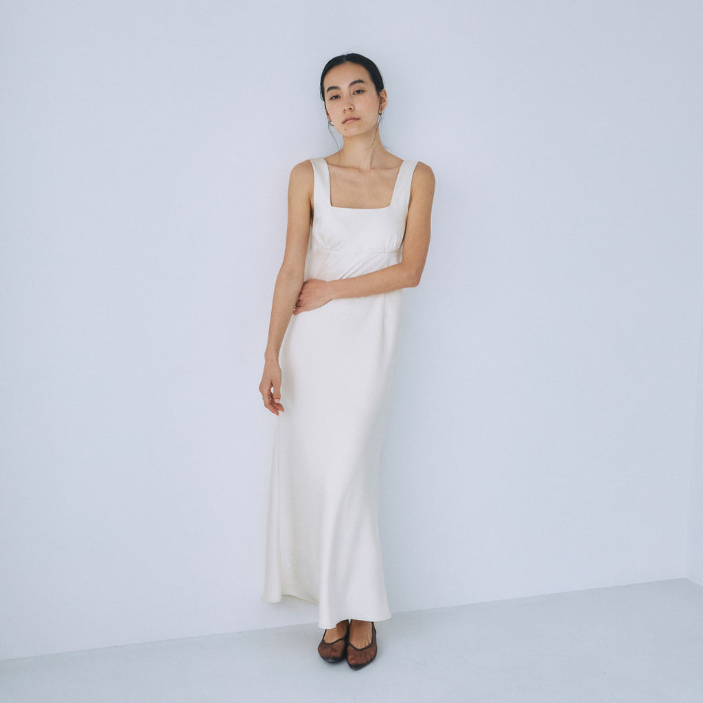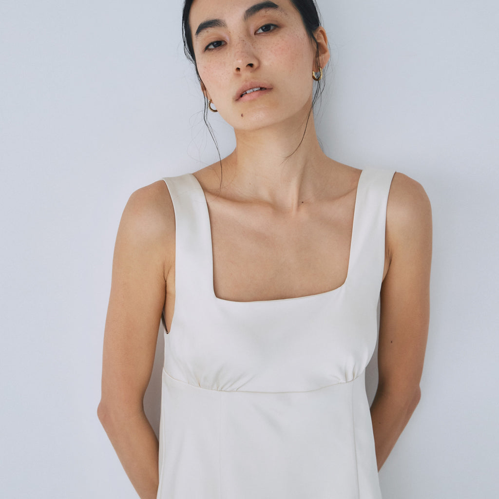 フロント・バックともに潔いスクエアネックを採用し、デコルテを綺麗に見せつつ大人の抜け感を演出。