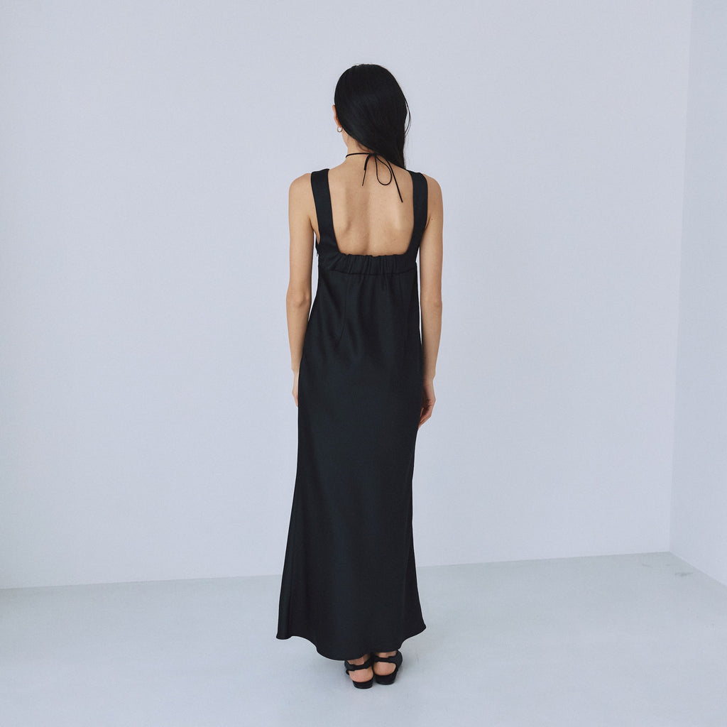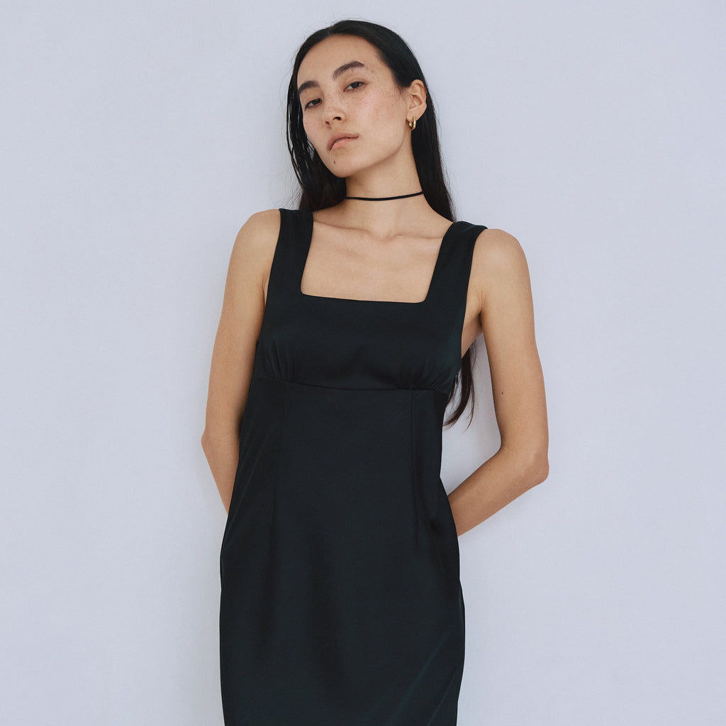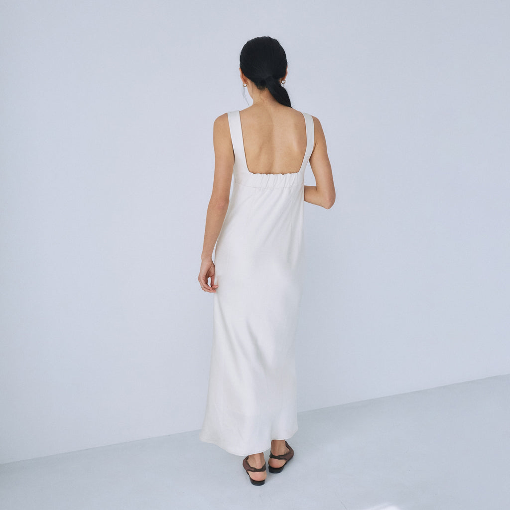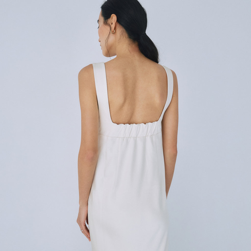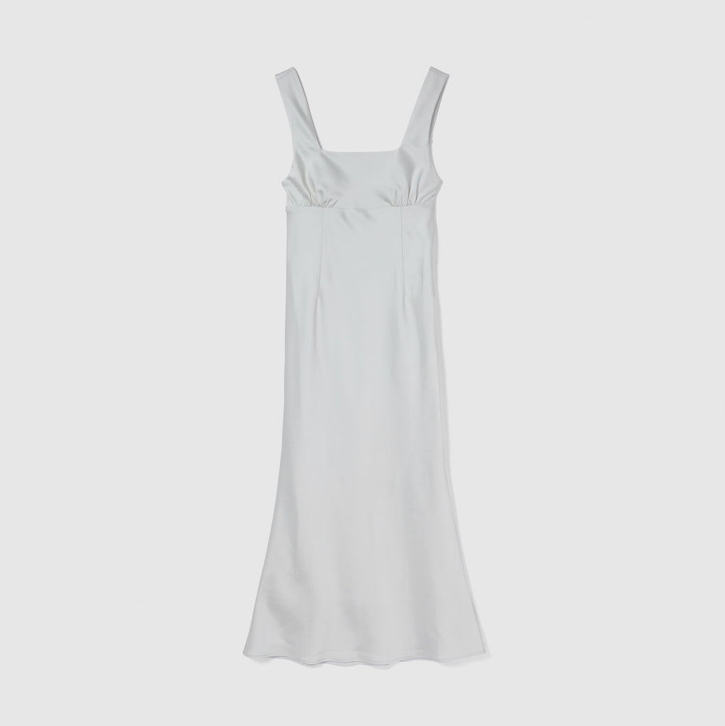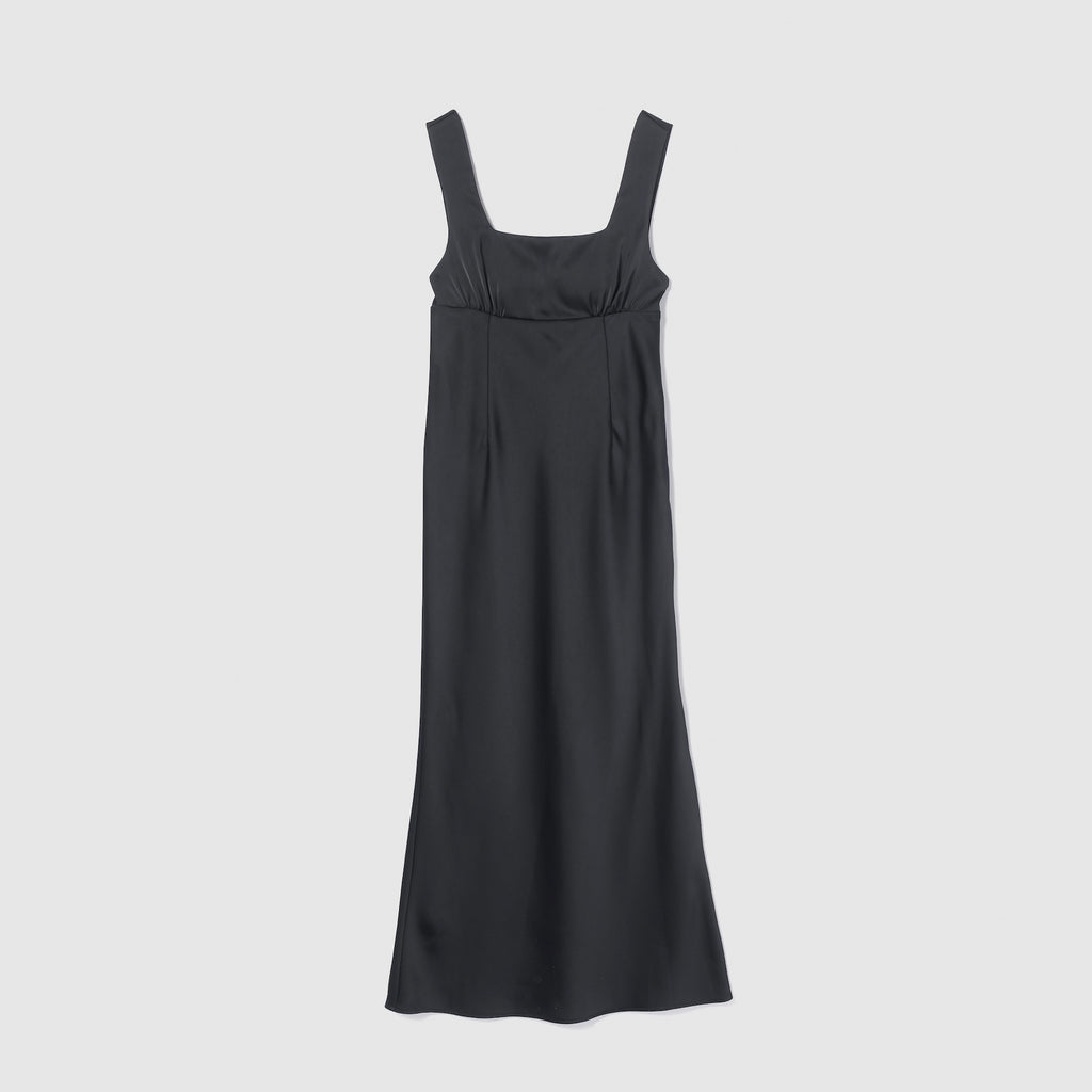フロント・バックともに潔いスクエアネックを採用し、デコルテを綺麗に見せつつ大人の抜け感を演出。