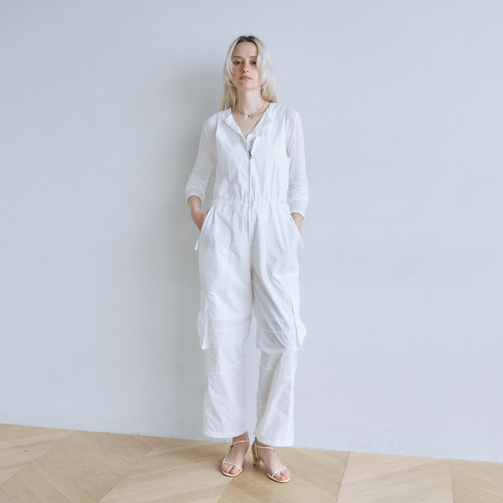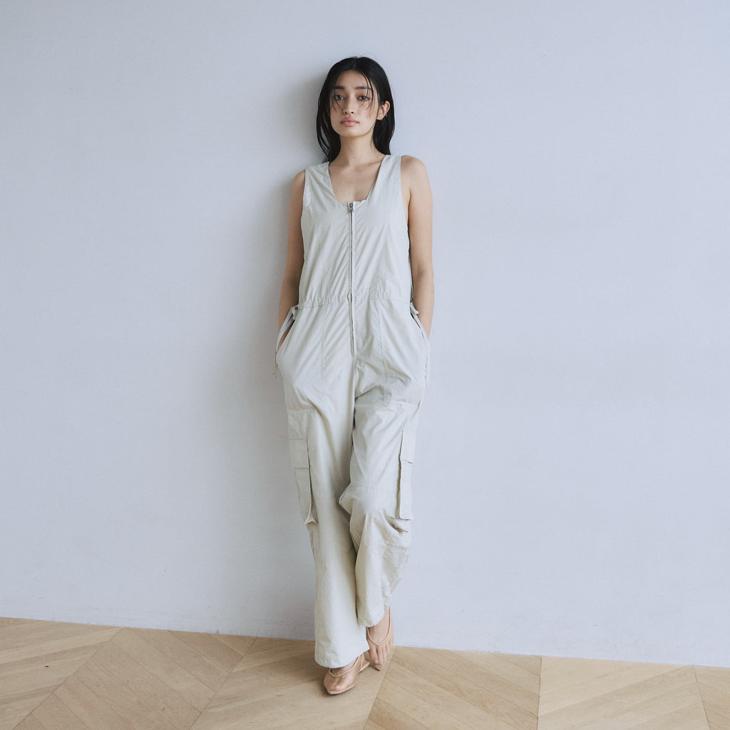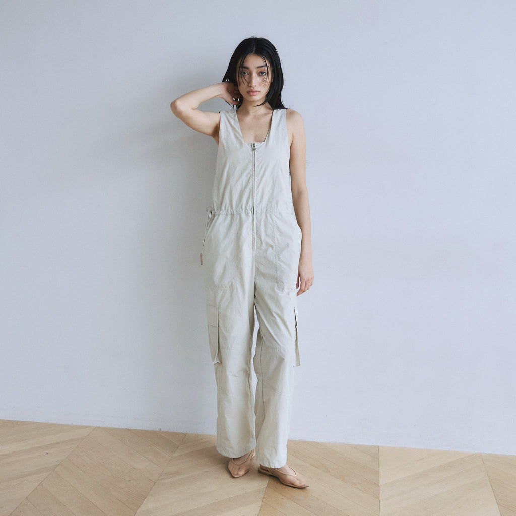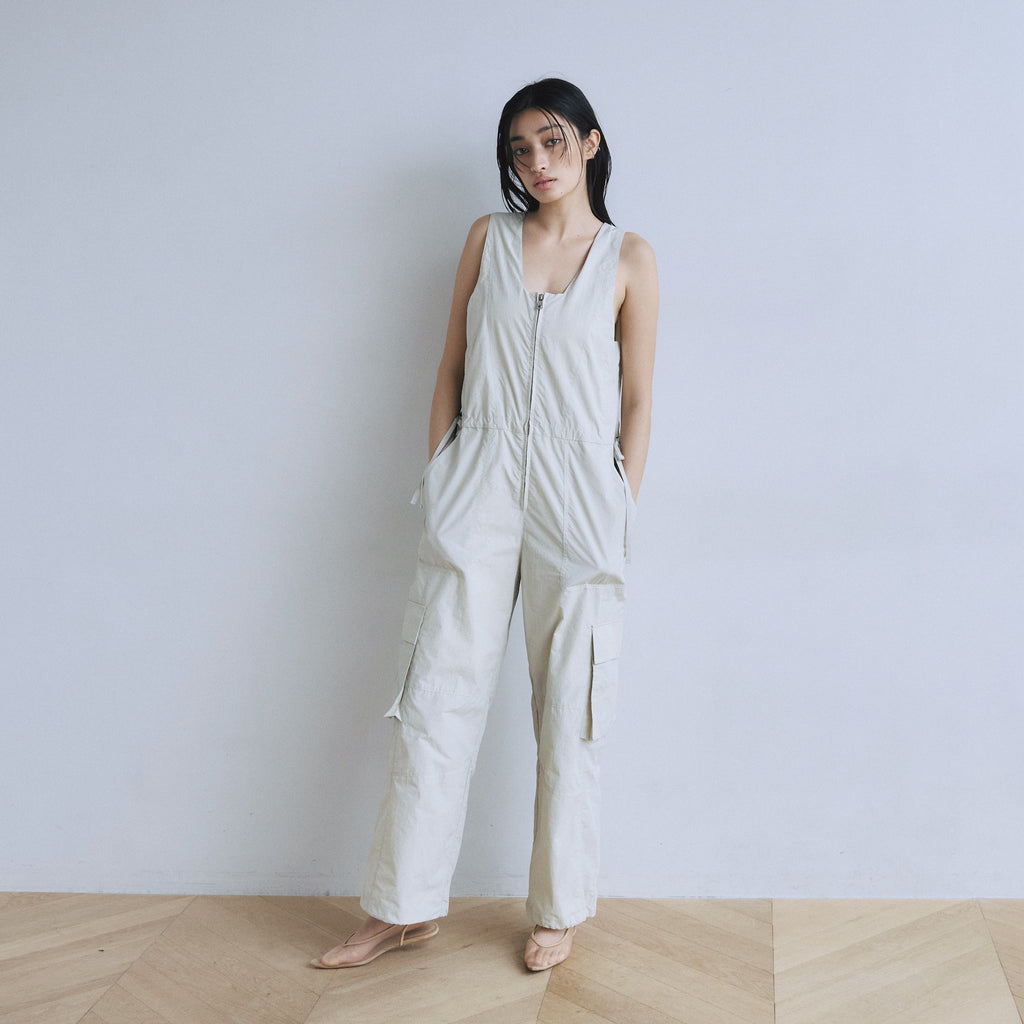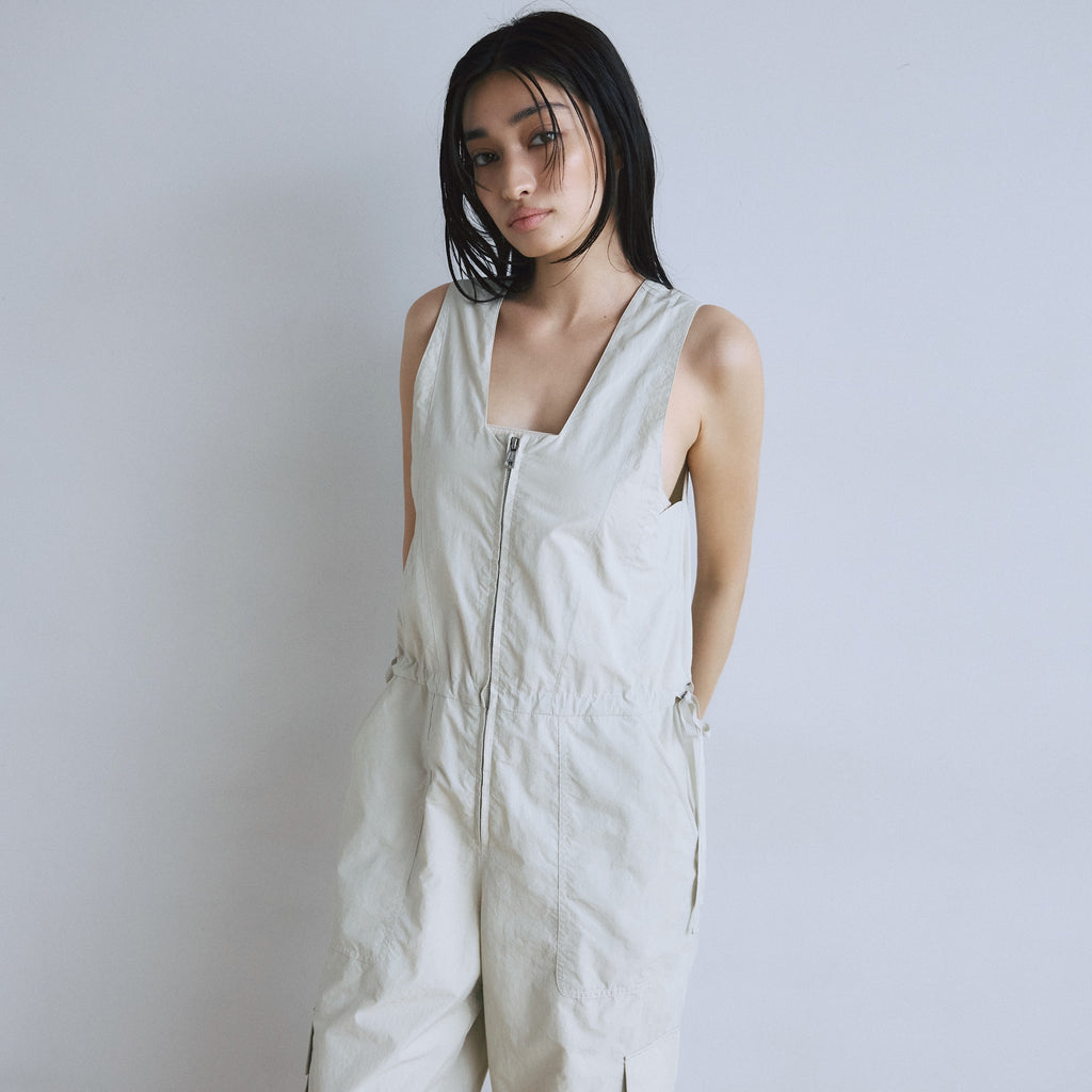 ナイロン特有の軽やかさと、フロントジップのワークな表情が都会的なこなれ感を演出するサロペットが登場。