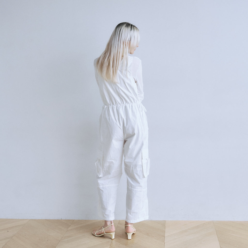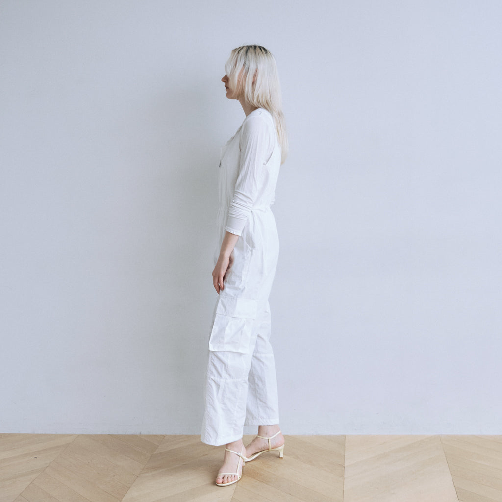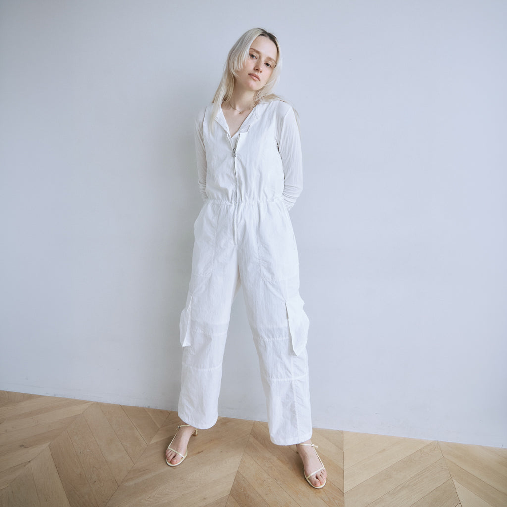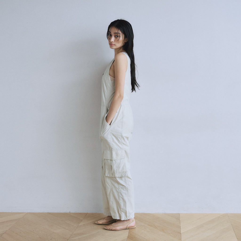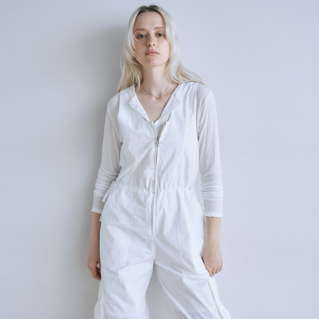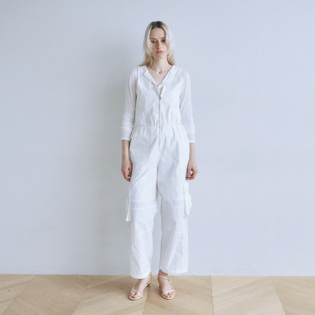 ナイロン特有の軽やかさと、フロントジップのワークな表情が都会的なこなれ感を演出するサロペットが登場。