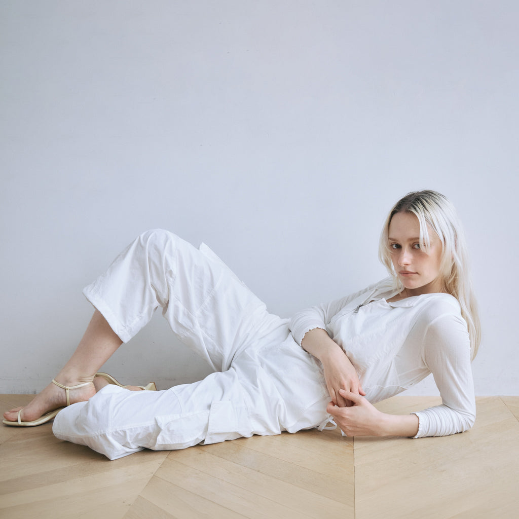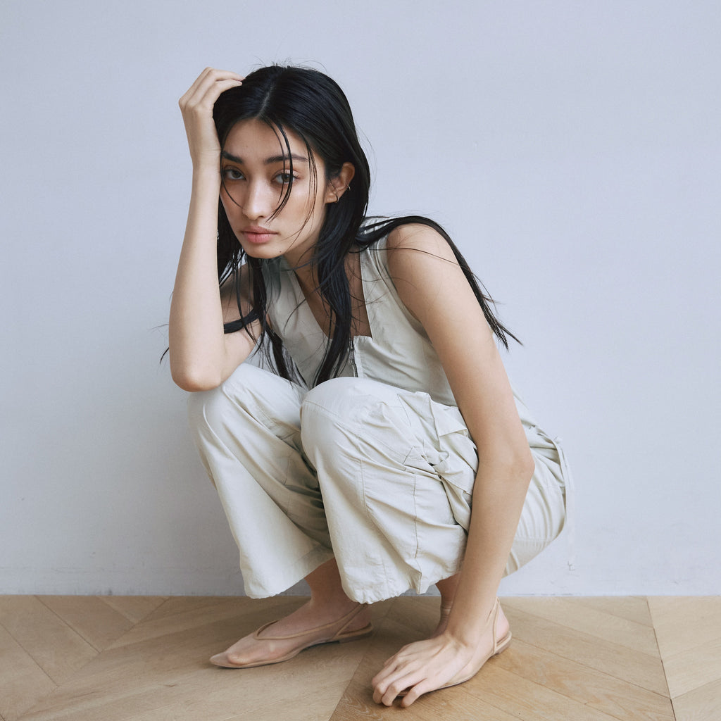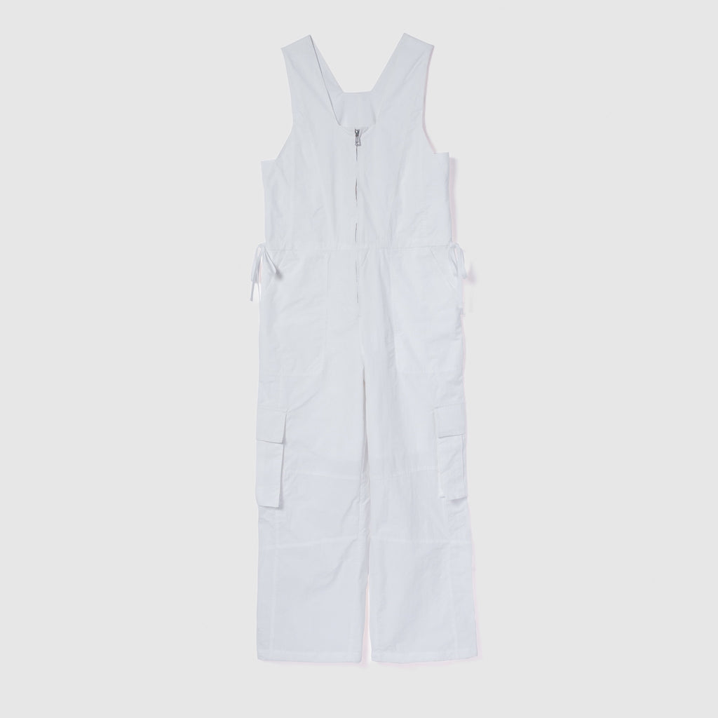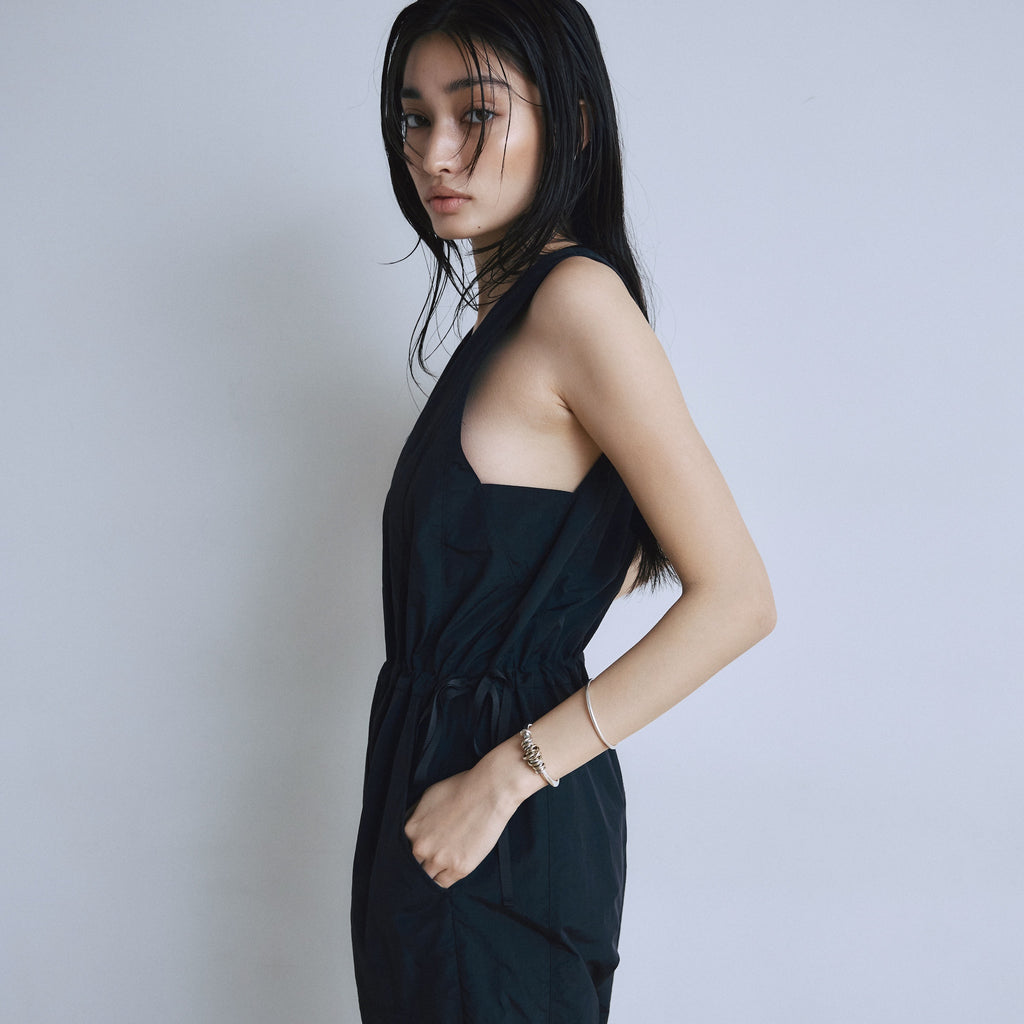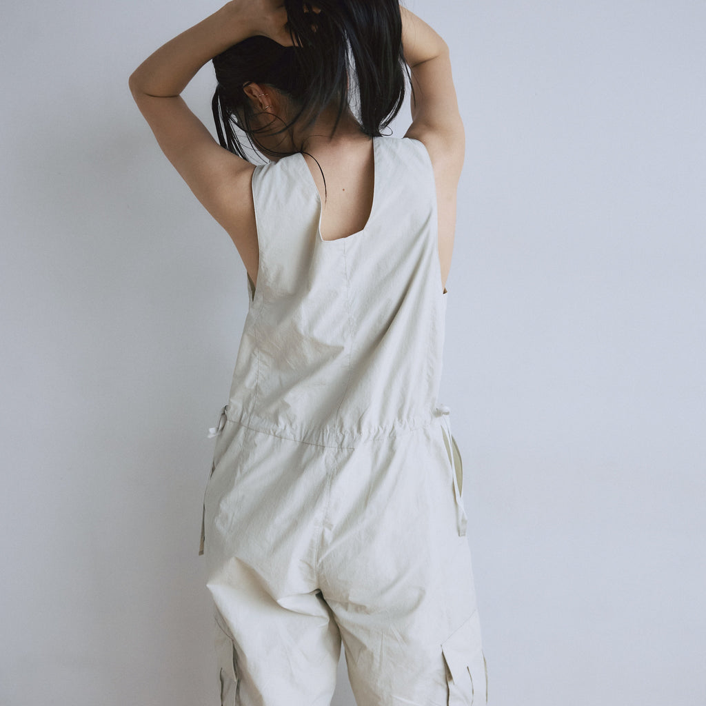 ナイロン特有の軽やかさと、フロントジップのワークな表情が都会的なこなれ感を演出するサロペットが登場。