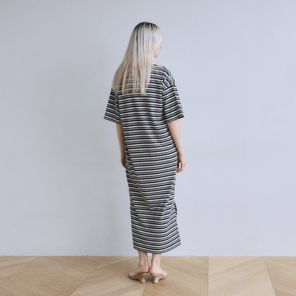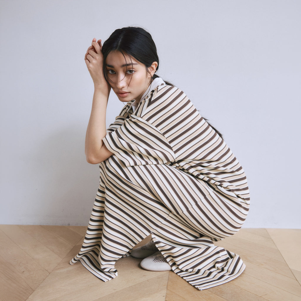 存在感のあるマルチボーダー柄1枚でさらっと着るだけでスタイリングが完成します。