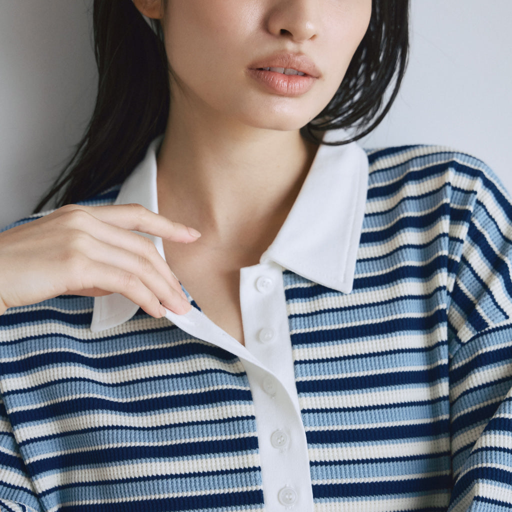 キャッチーなマルチボーダーとヴィンテージ感漂うワッフル素材が融合した大人のためのポロワンピース。