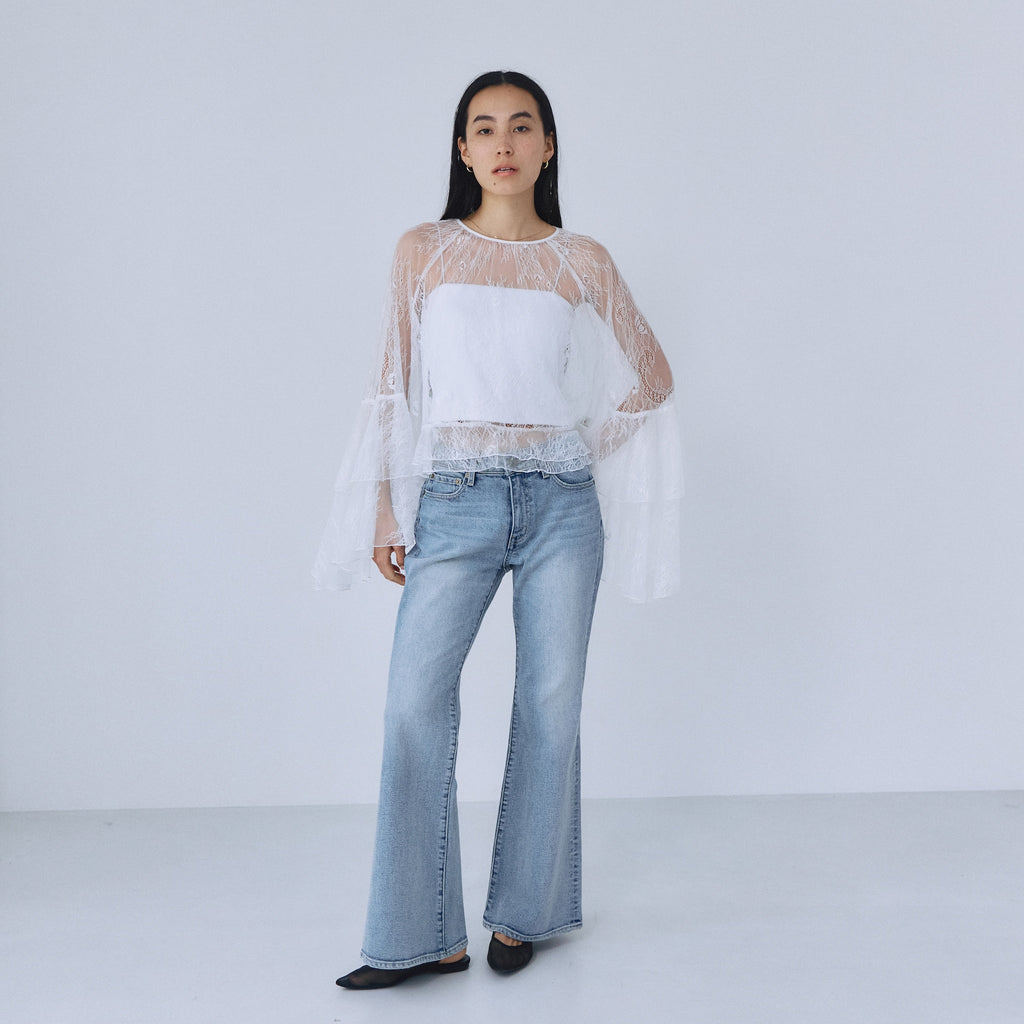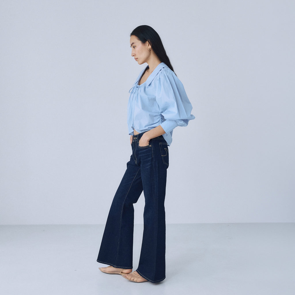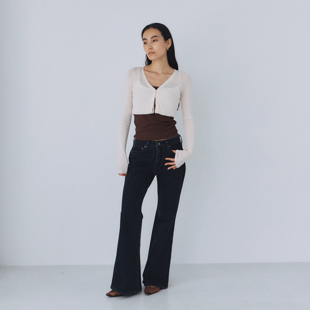 コンパクトなトップスと合わせることで、ローライズフレアのシルエットが際立つスタイリングに。