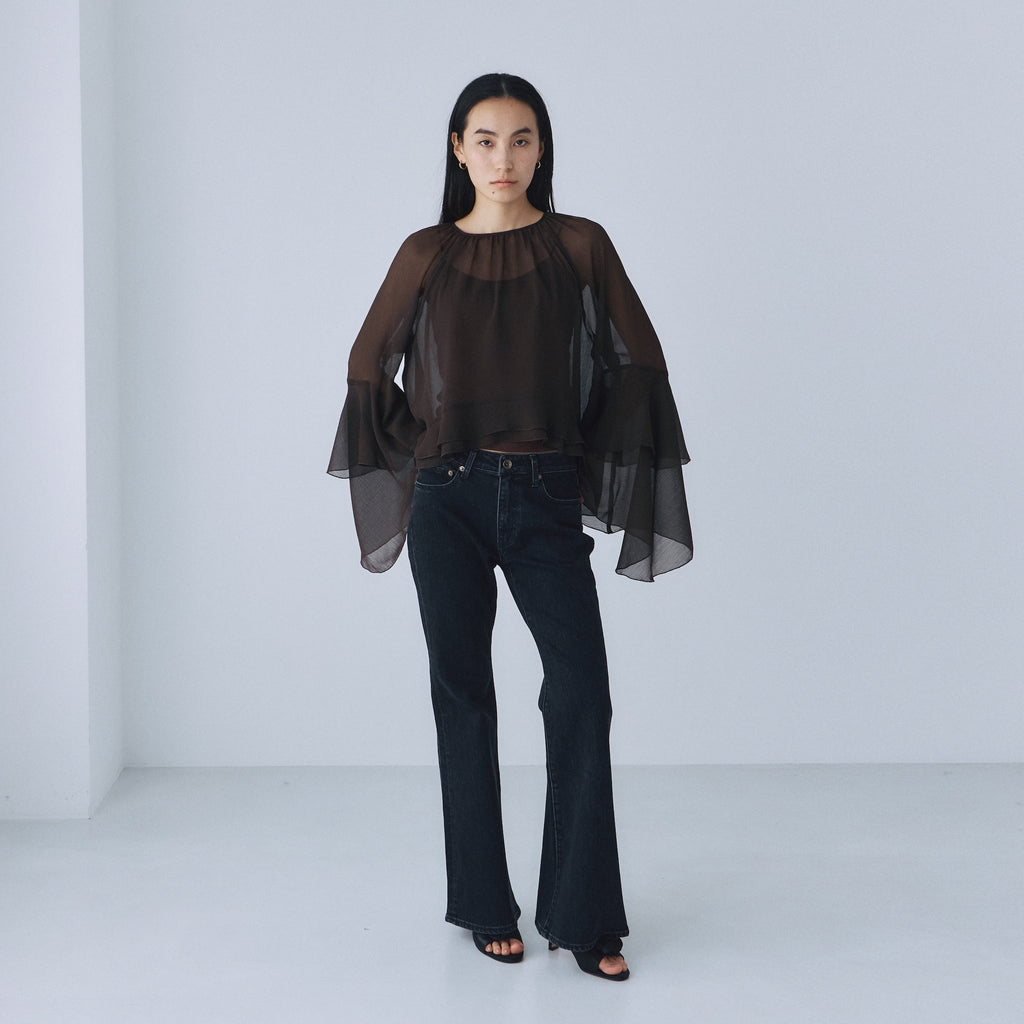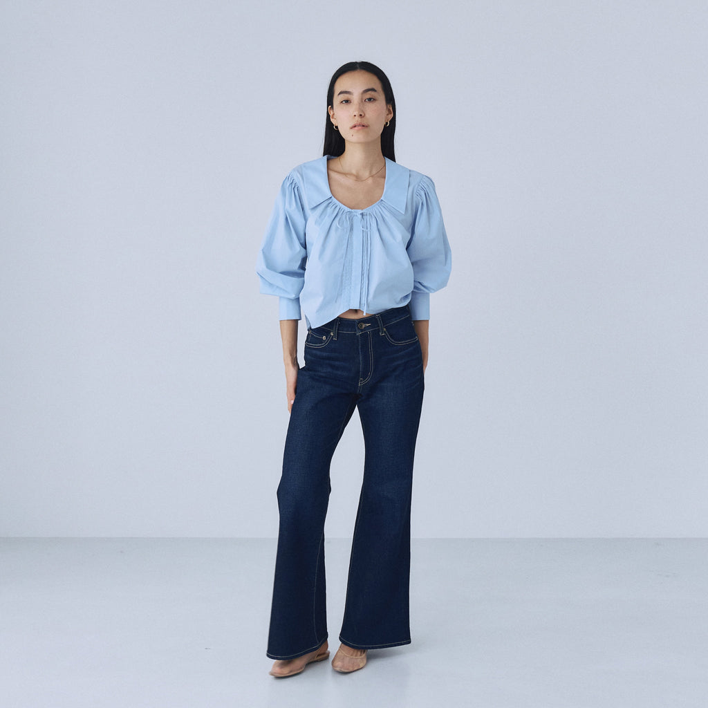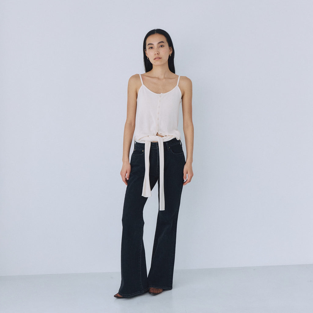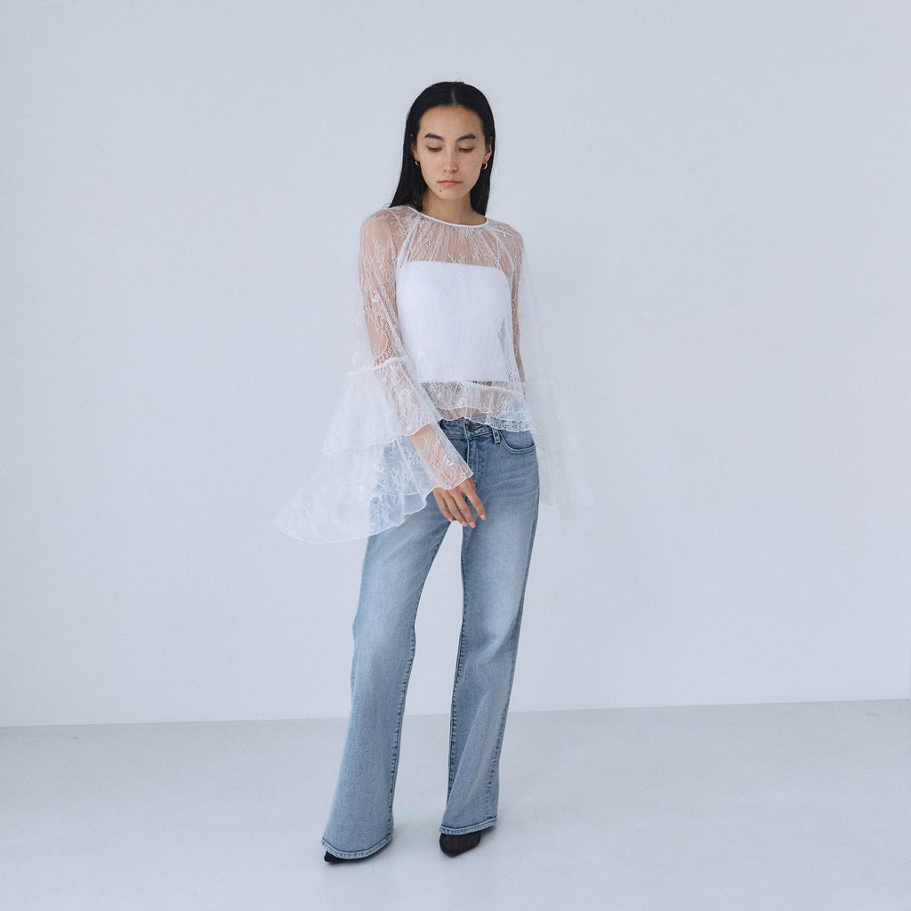 コンパクトなトップスと合わせることで、ローライズフレアのシルエットが際立つスタイリングに。