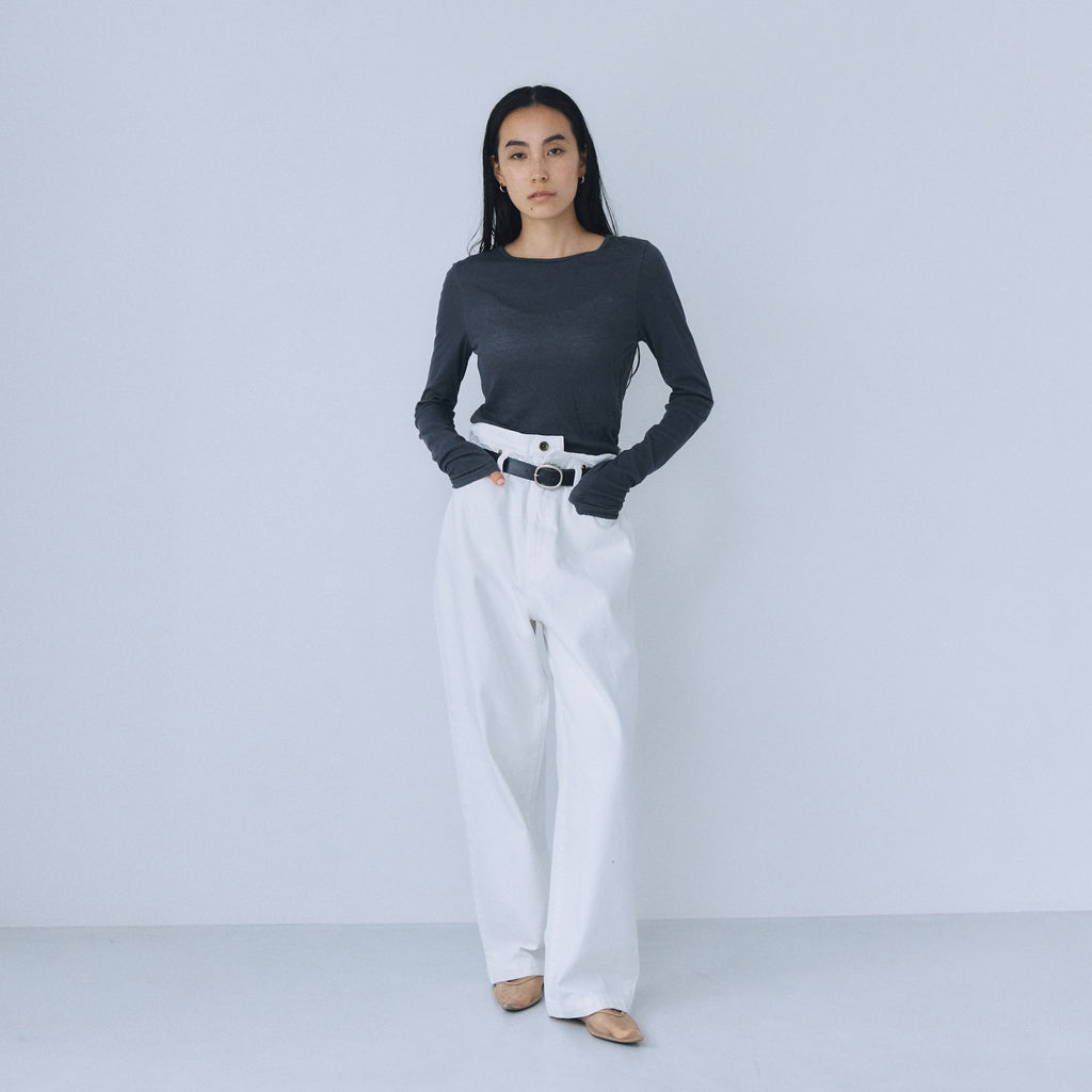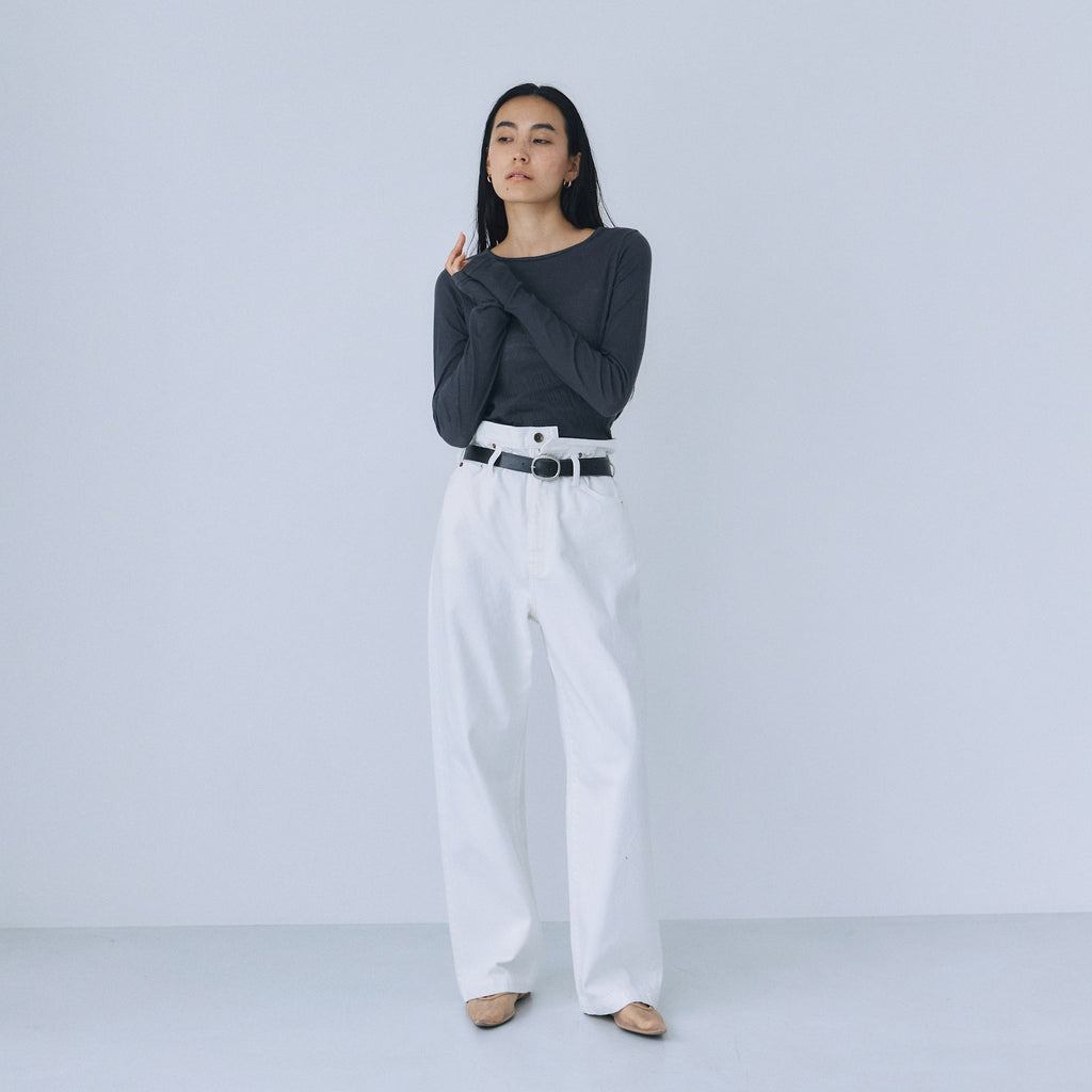 ゆとりあるワイドラインに、美脚を追求した1本。ヒップはかなり大きめの設定ですが、裾に向かってややすぼまるテーパード型になっていることで、ずるっとしすぎない履きやすいシルエットに。