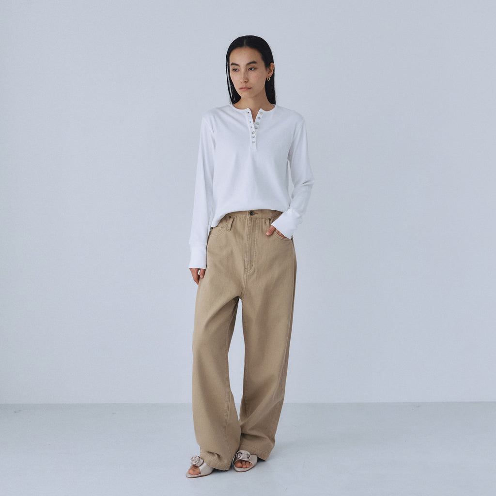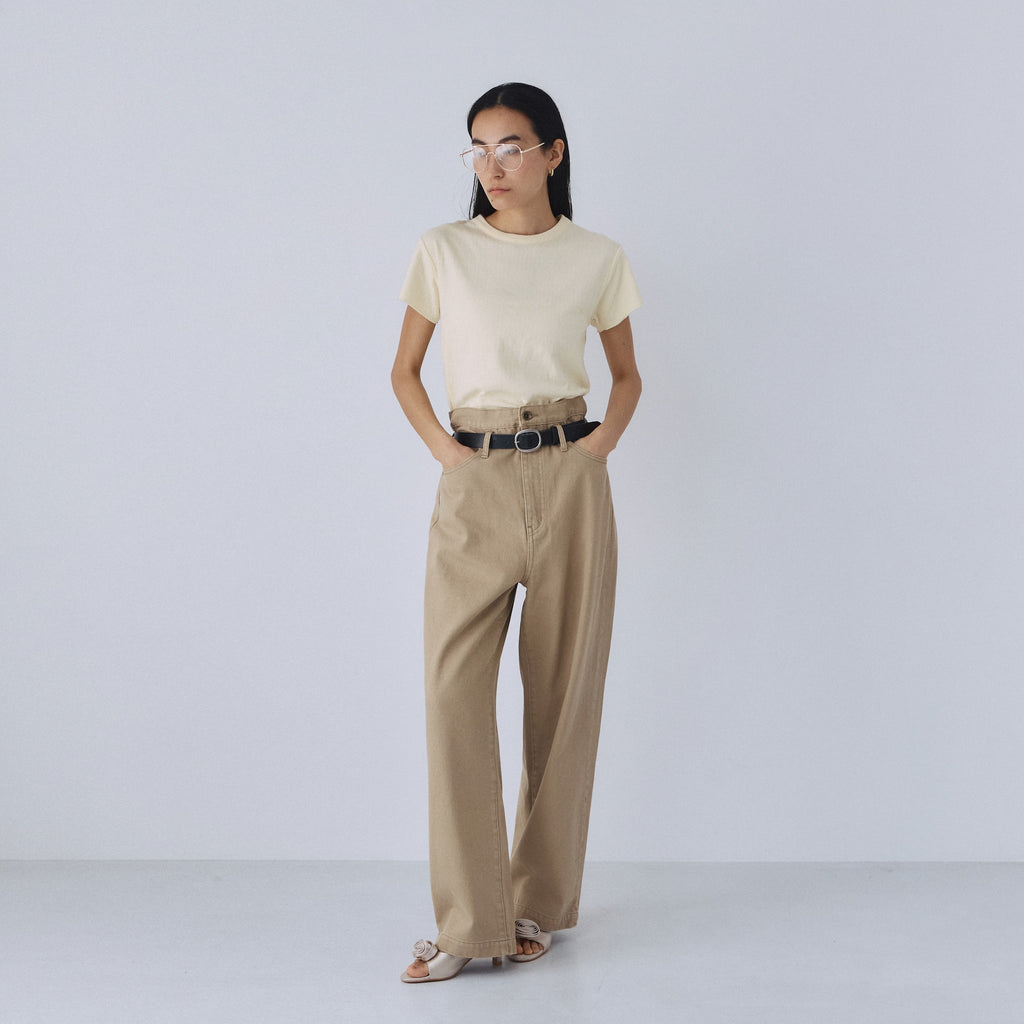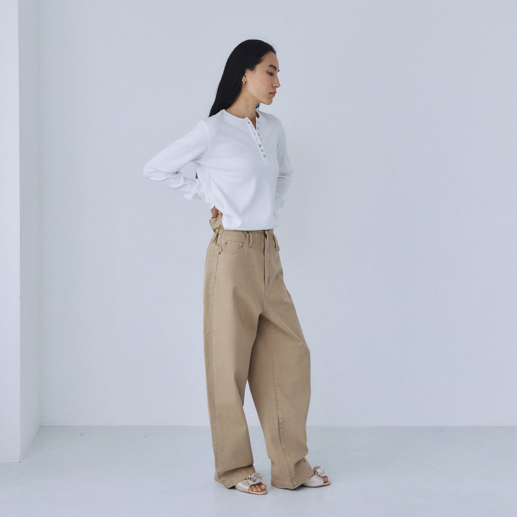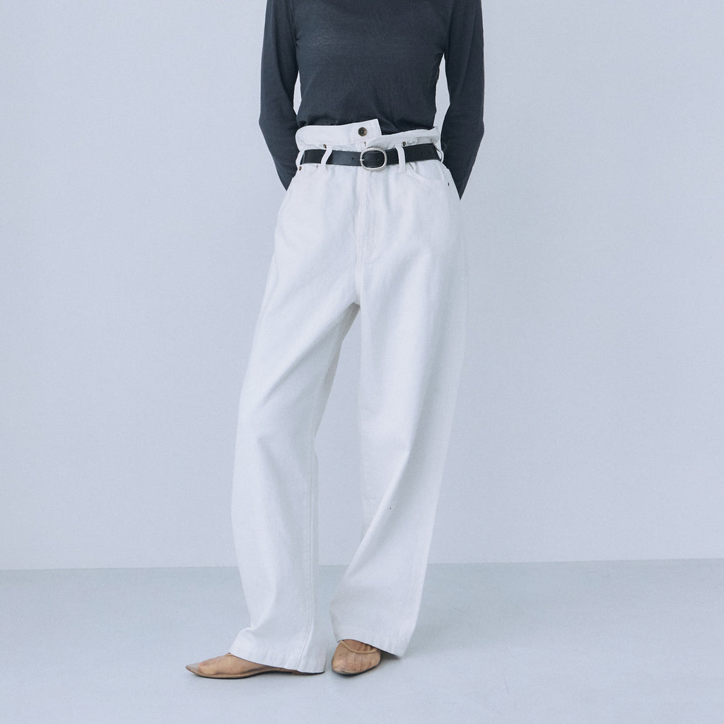 ウエストとヒップ周りにゆとりのある、古着のような大人ワイドデニム。ギャザーが可愛いウエストデザインにも注目。新色「ベージュ」を追加し再登場です。
