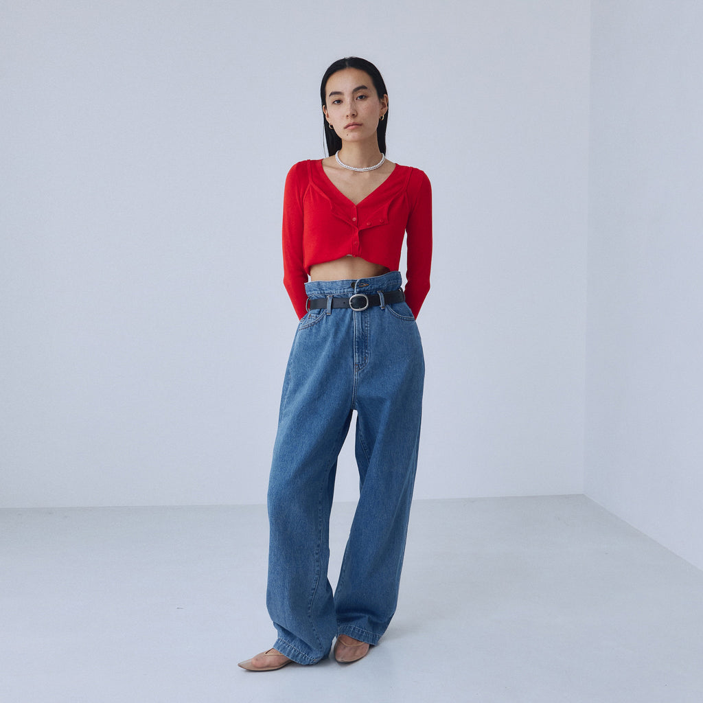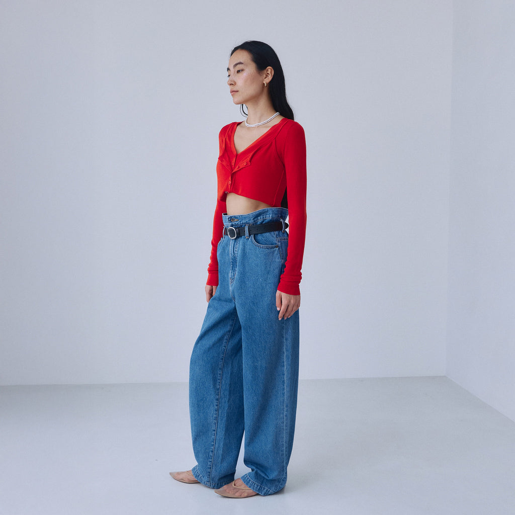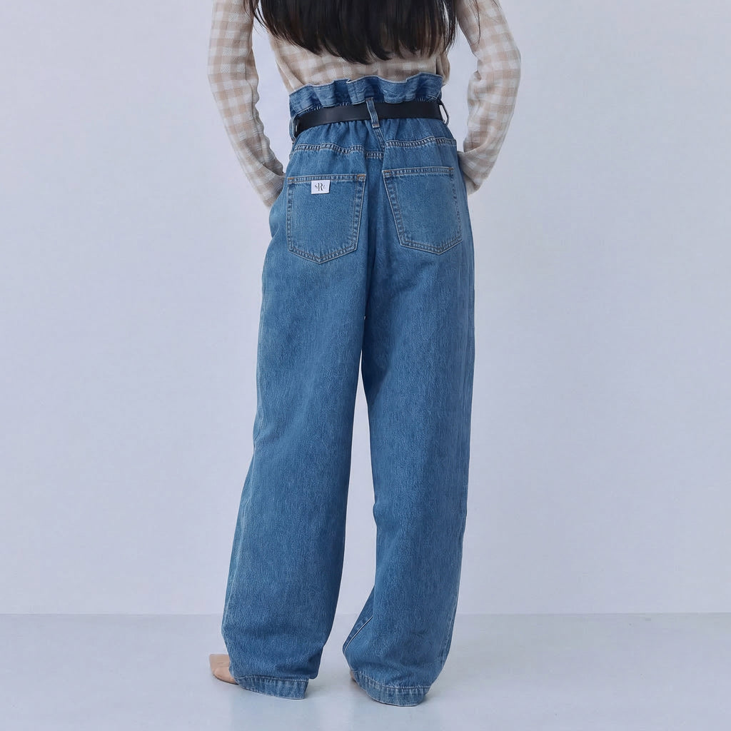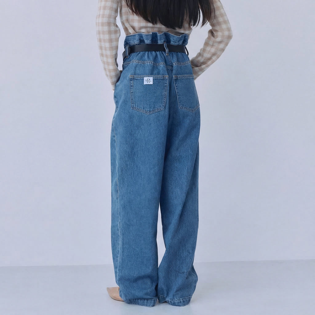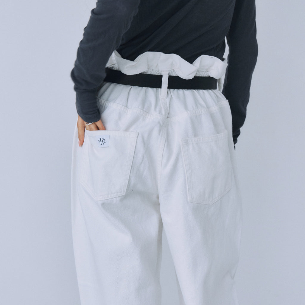 大きいサイズのデニムを、ベルトをギュッと締めて履いているようなウエストデザイン。ウエストバックにはゴム入りで、ギャザーを寄せています。後ろポケットのピスネームもワンポイント。