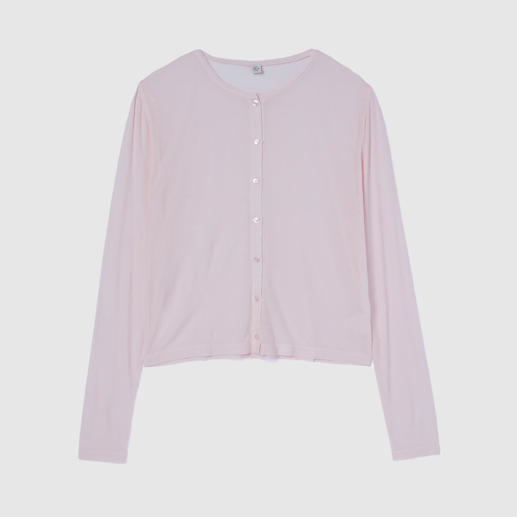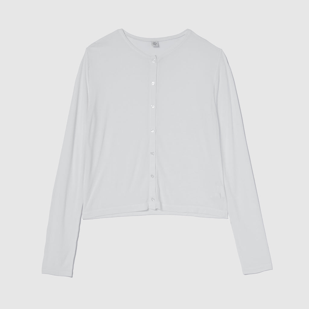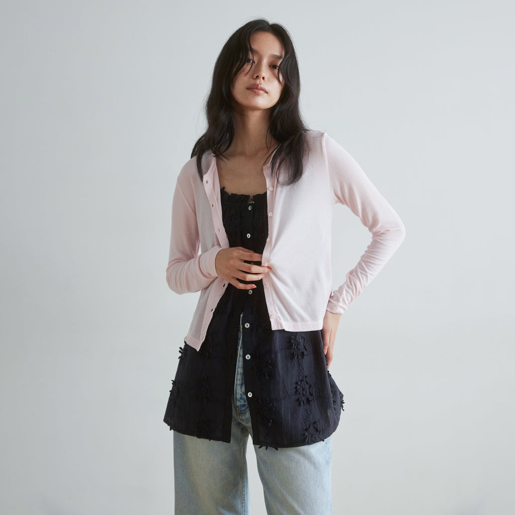 シンプルなミニマルデザインで、どんなスタイリングにも馴染むカーディガン。ネックラインはあえて詰まり気味に設計し、トップスとしても羽織としても着回せる万能な1枚に仕上げました。フロントには強調しすぎないミニサイズのハートボタンをあしらい、さりげなくフェミニンなムードをプラスしています。