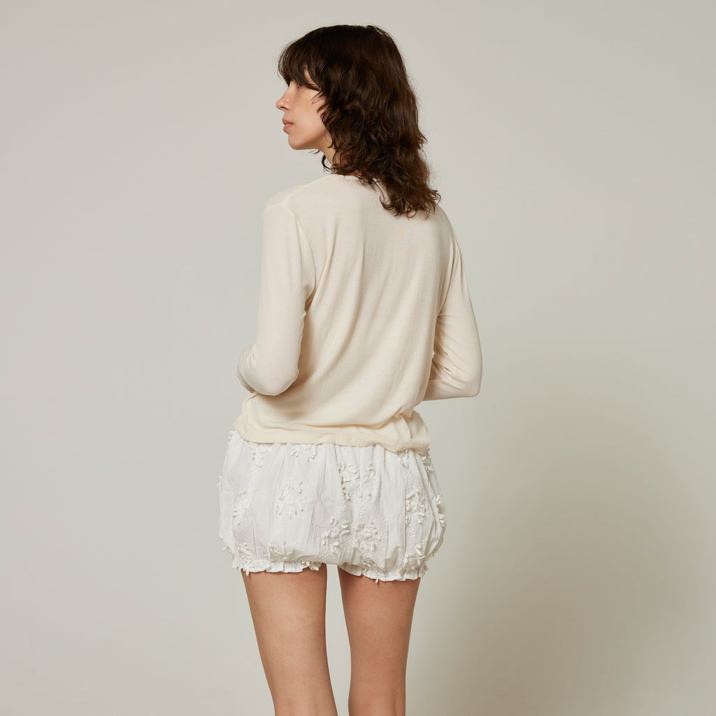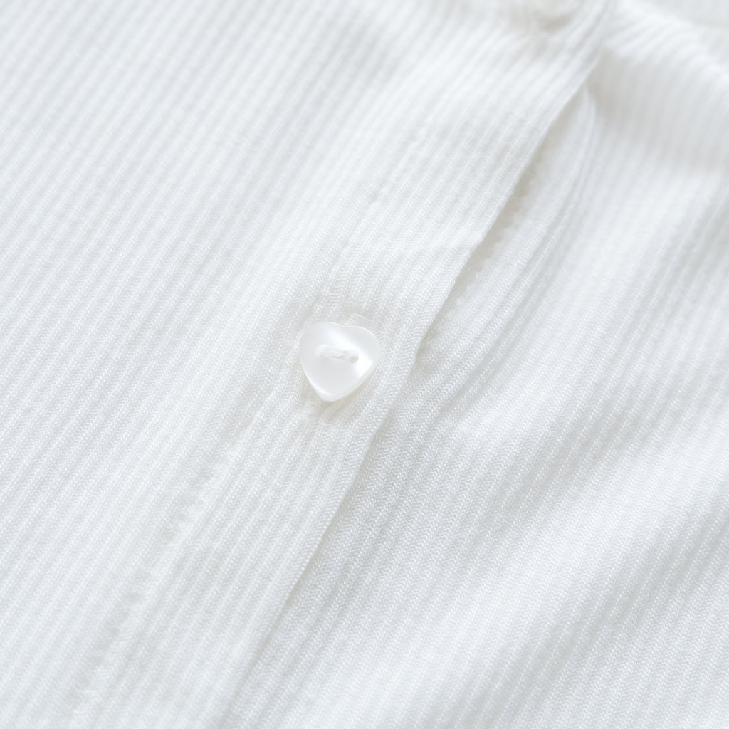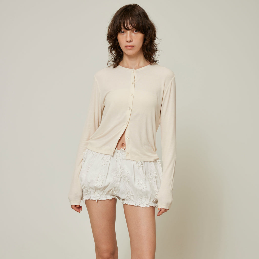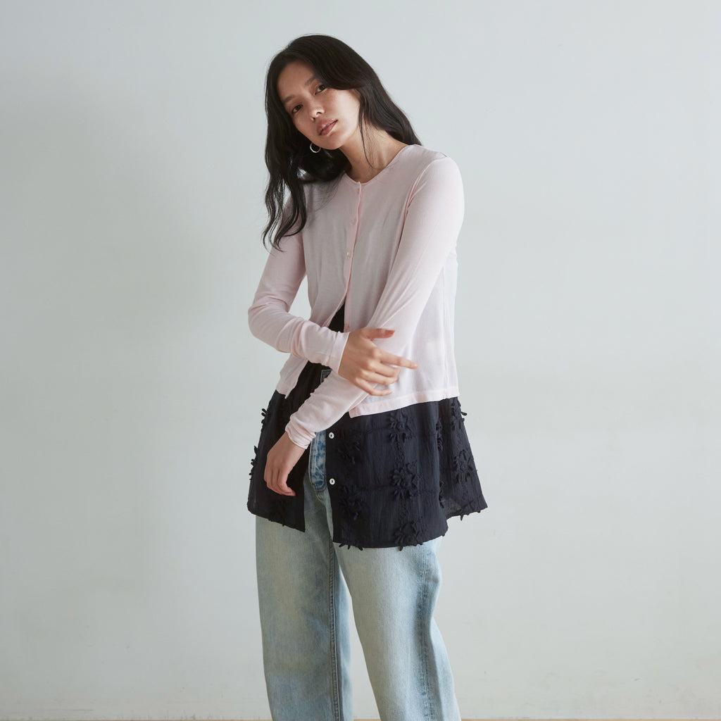 シンプルなミニマルデザインで、どんなスタイリングにも馴染むカーディガン。ネックラインはあえて詰まり気味に設計し、トップスとしても羽織としても着回せる万能な1枚に仕上げました。フロントには強調しすぎないミニサイズのハートボタンをあしらい、さりげなくフェミニンなムードをプラスしています。