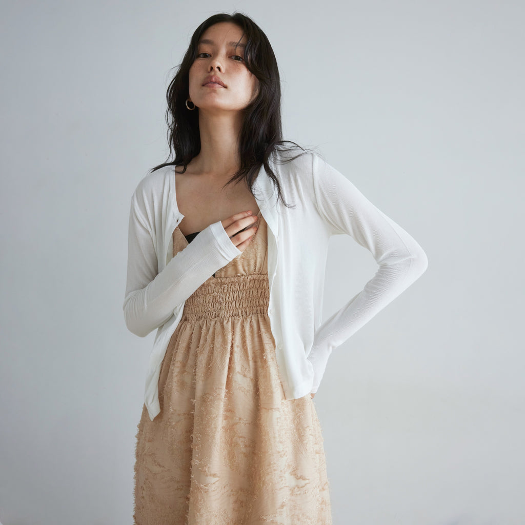 素材にこだわったベーシックカーディガン。滑らかなとろみと透け感が特徴の上質生地をオリジナルで編み上げました。コンパクトなタイトシルエットで、羽織りにもトップスにも自在に着回せます。
